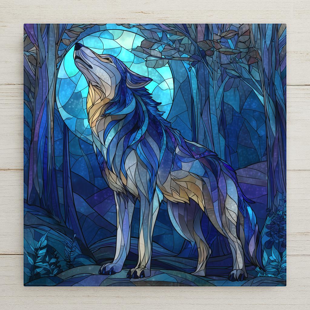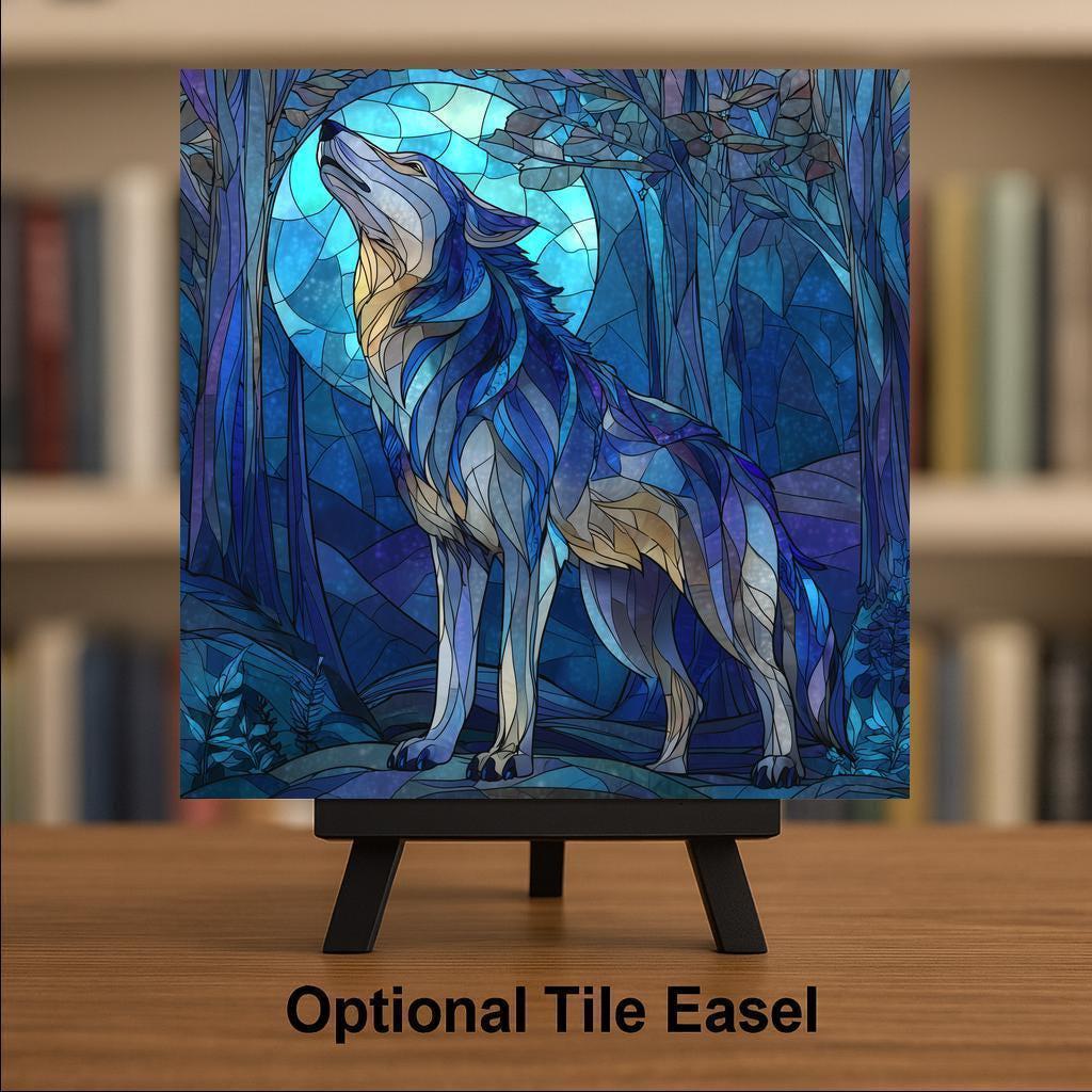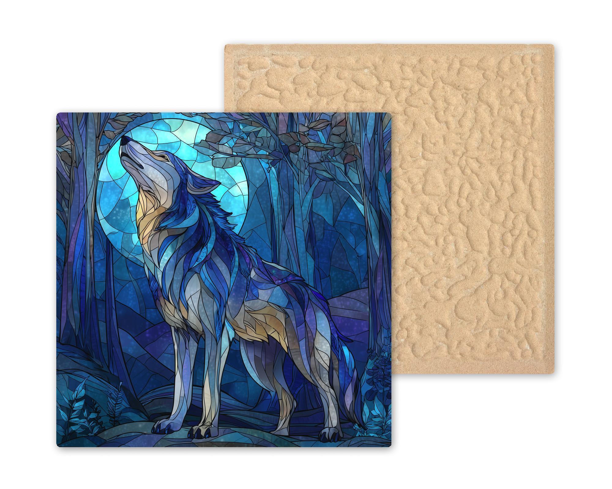 Bring the mystery and beauty of the forest night into your home with this stained glass-style howling wolf ceramic tile. The artwork features an elegant combination of blues, teals, and moonlit highlights, all coming together to create a dramatic wildlife portrait. This tile is permanently printed using a durable, vibrant process that maintains crisp detail and rich color. It isn’t actual stained glass, but the look and texture mimic the luminous style beautifully, giving your wall decor a glowing, dimensional effect.