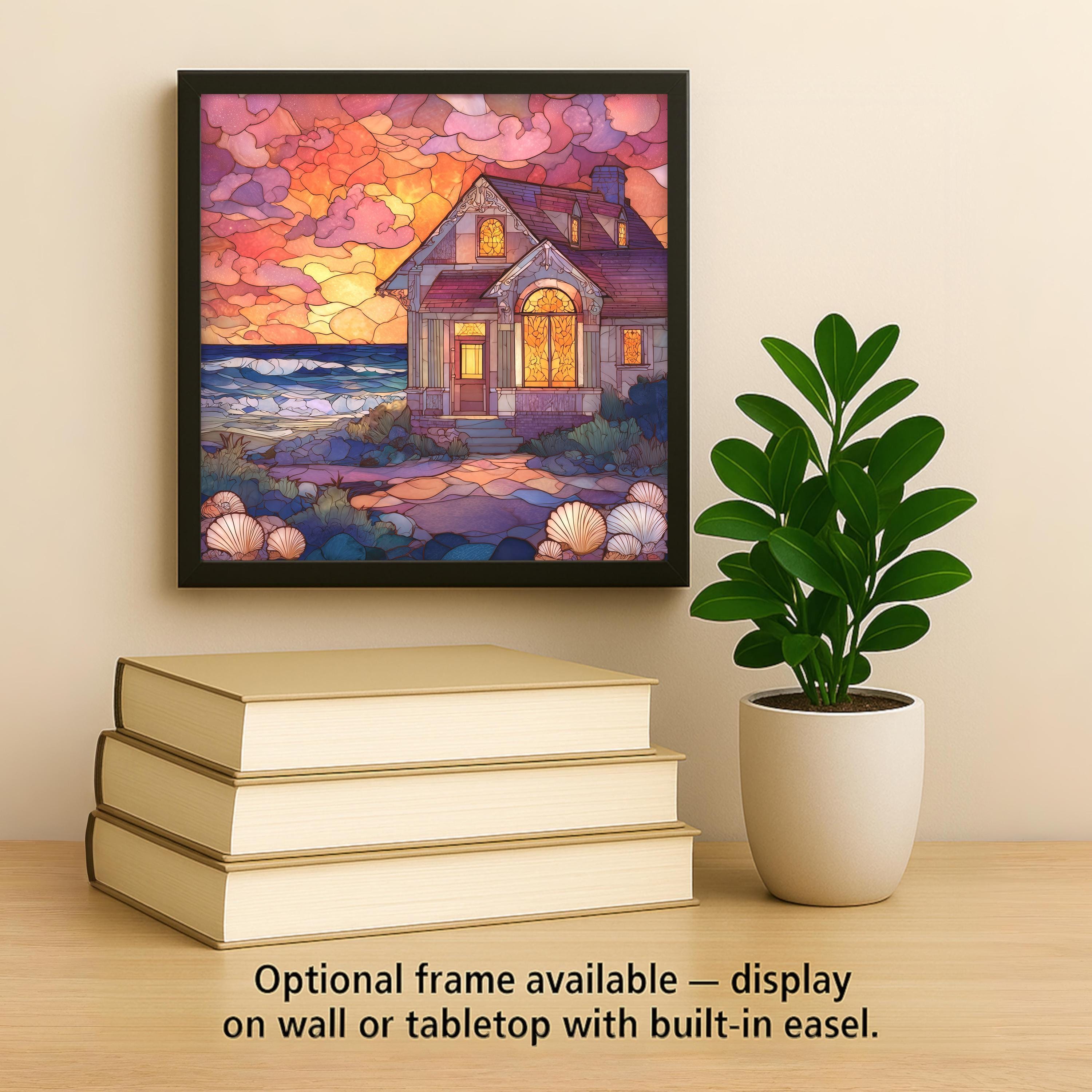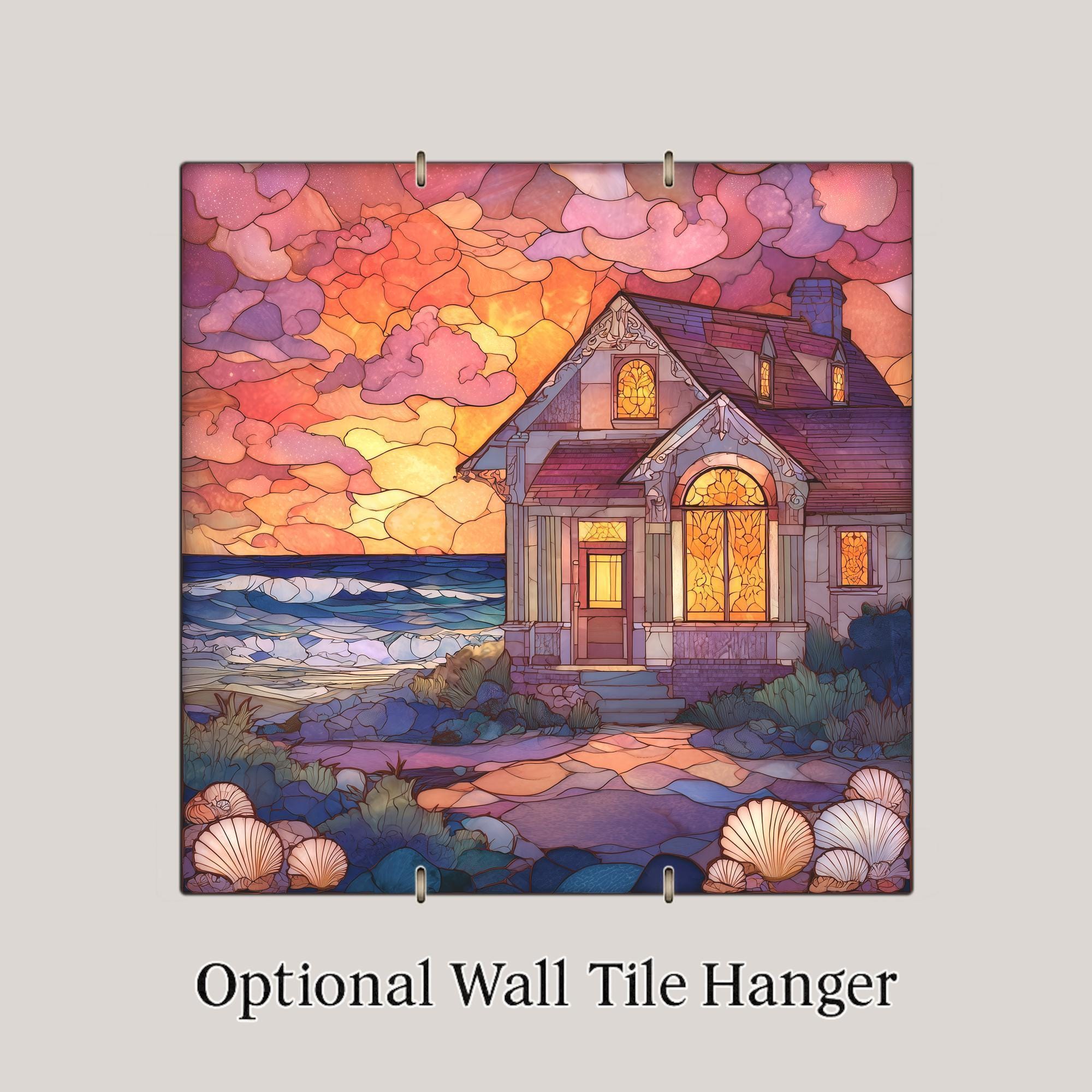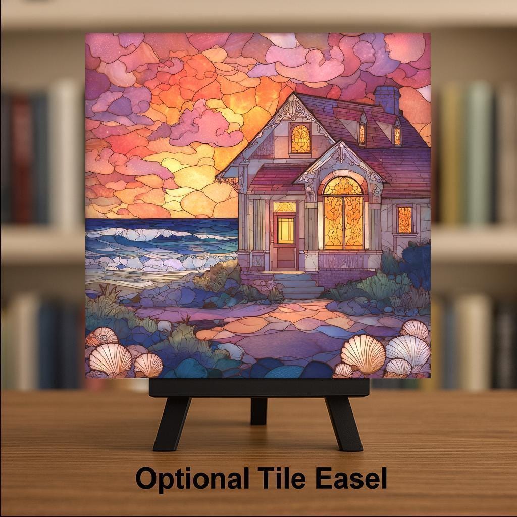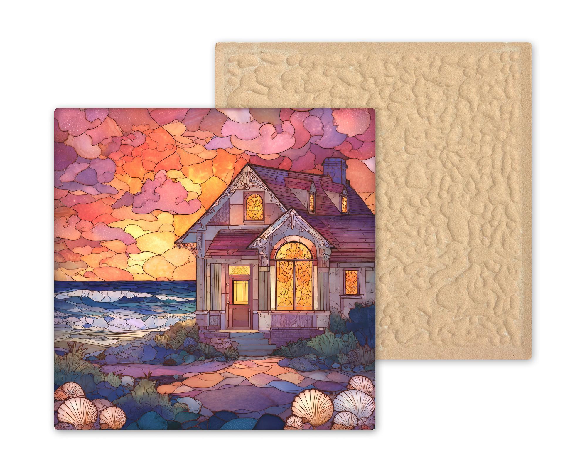 This coastal cottage sunset ceramic tile was designed for a very specific buyer — the one who has a beach cottage or vacation home they love deeply, or who dreams of one. Not the generic coastal decor buyer, but the person for whom a particular cottage at a particular coast means something specific and personal. The glowing windows at dusk suggest a home that is lived in and loved, which is a completely different emotional signal from a daytime exterior shot.
