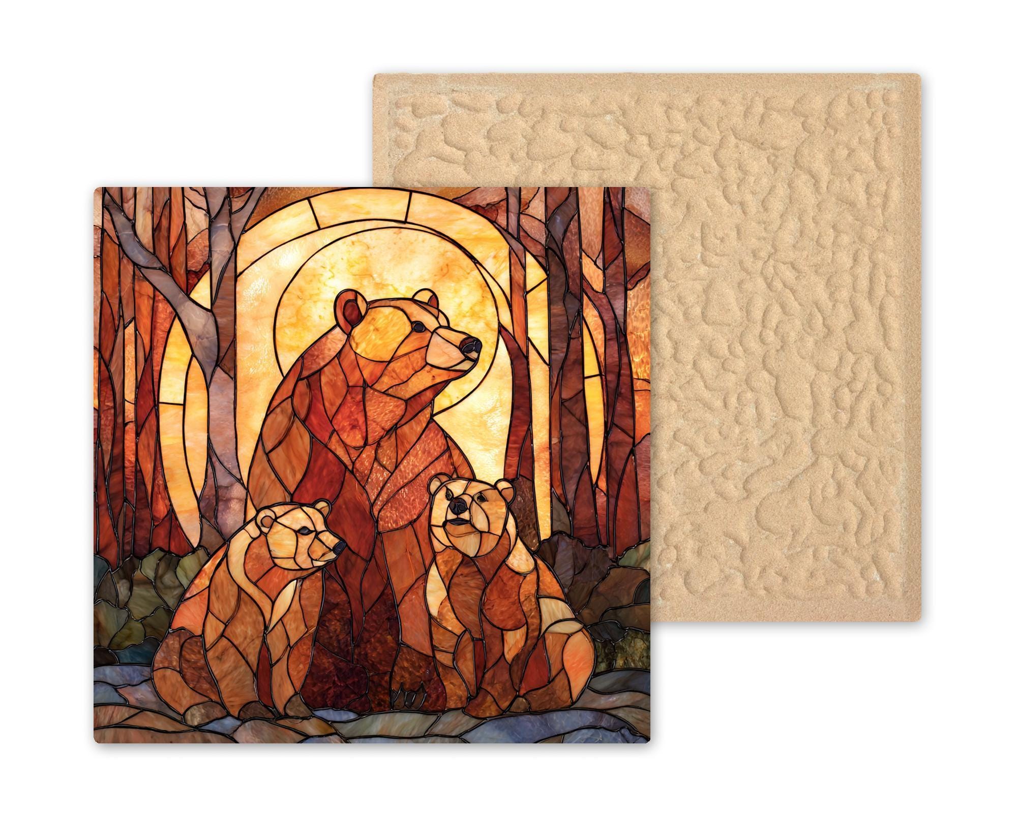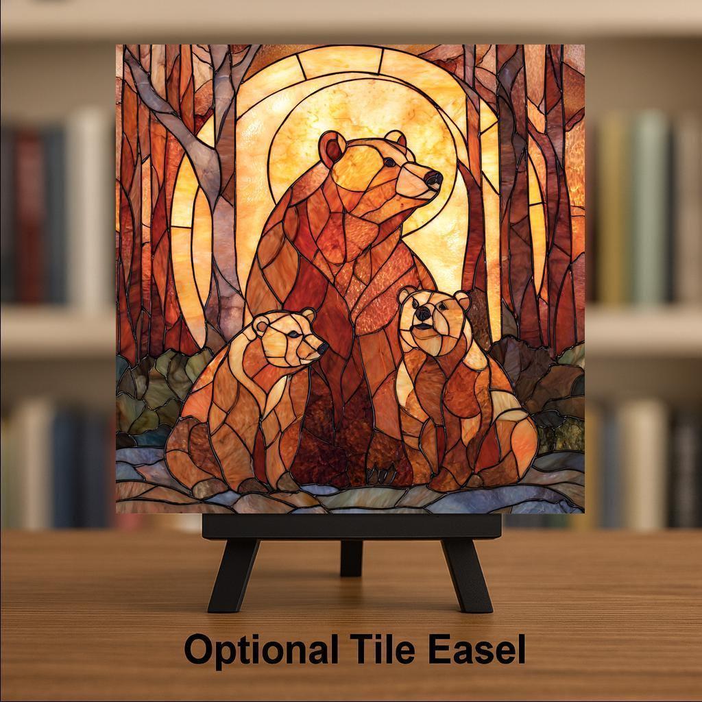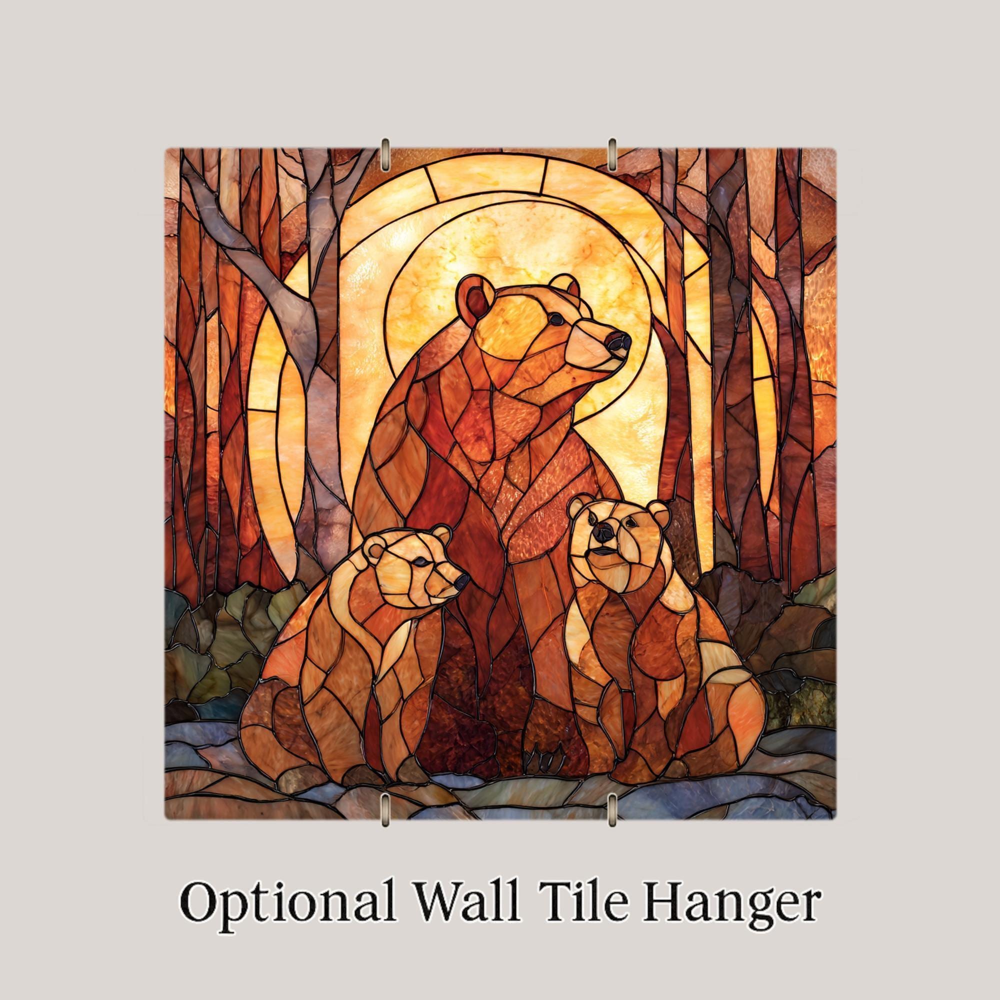 Bring a warm forest glow to your home with this stained glass-style bear family ceramic tile. The artwork shows a mother bear and two cubs resting beneath rich amber light, surrounded by tall woodland trees and glowing sunset tones. Even though the design looks like stained glass, the tile is a permanent print on ceramic created with a process that keeps the colors bright and the details clear. It is ideal for rustic cabin wall decor, lodge-style interiors, woodland themes, and wildlife-inspired rooms. Many customers choose this tile as a unique nature gift, a personal keepsake, or a standout display piece for their home.