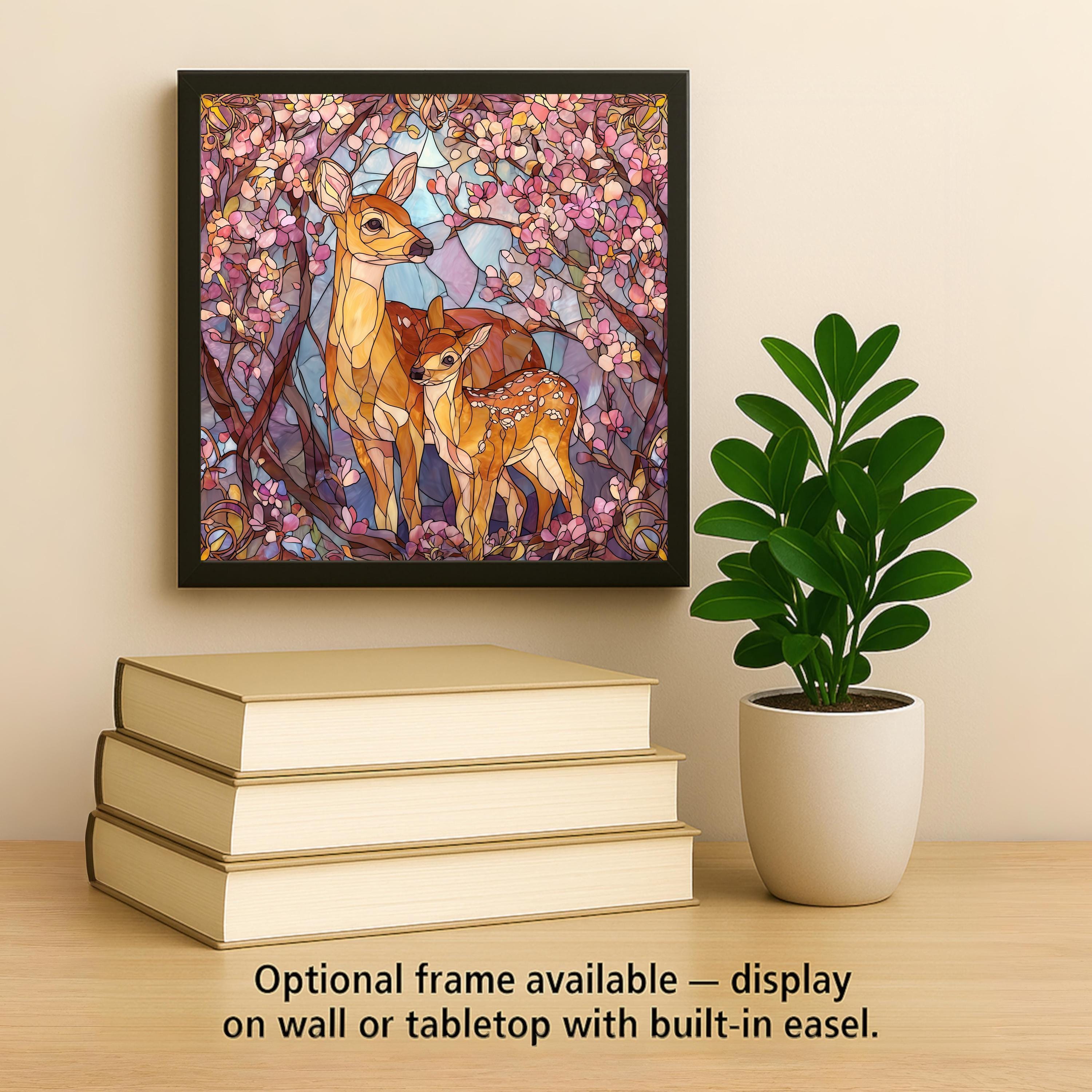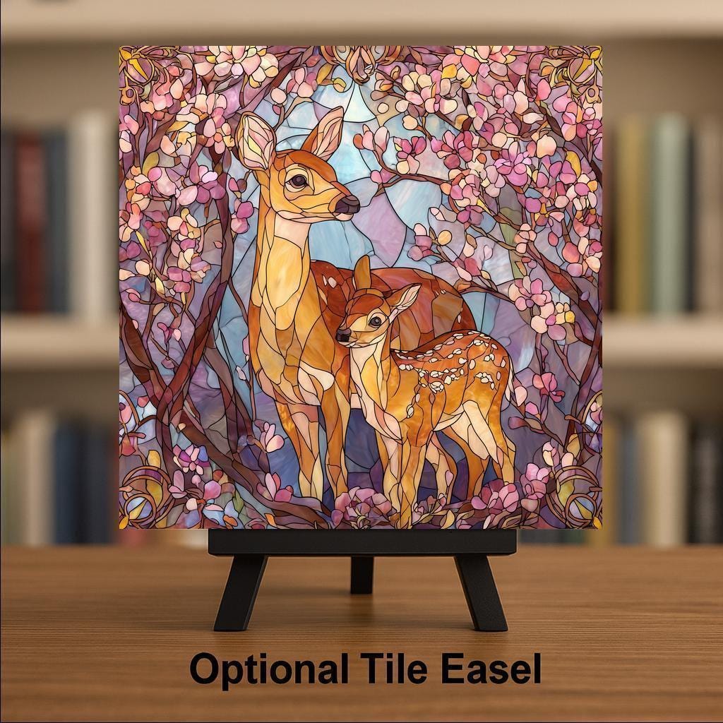 Celebrate the beauty of spring and woodland wildlife with this stained glass-style deer and fawn ceramic tile. The artwork shows a protective mother deer and her spotted fawn standing among blooming pink branches and soft blue and lavender tones. The colors glow like stained glass, but the tile is a permanent print on ceramic using a process that keeps the details crisp and the hues vibrant. This piece works well as woodland wall decor, cabin art, nursery decor, or a spring-inspired accent for any room. Many customers choose it as a thoughtful gift for animal lovers, new parents, or anyone who enjoys peaceful floral artwork.
