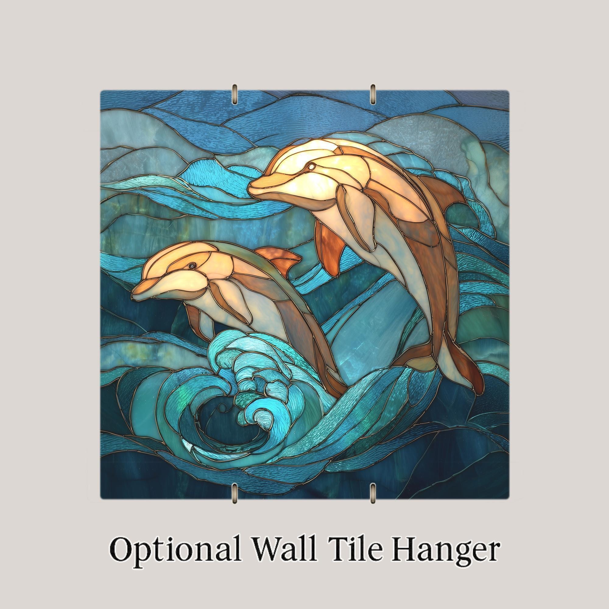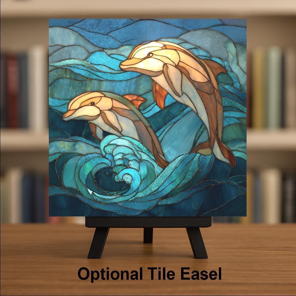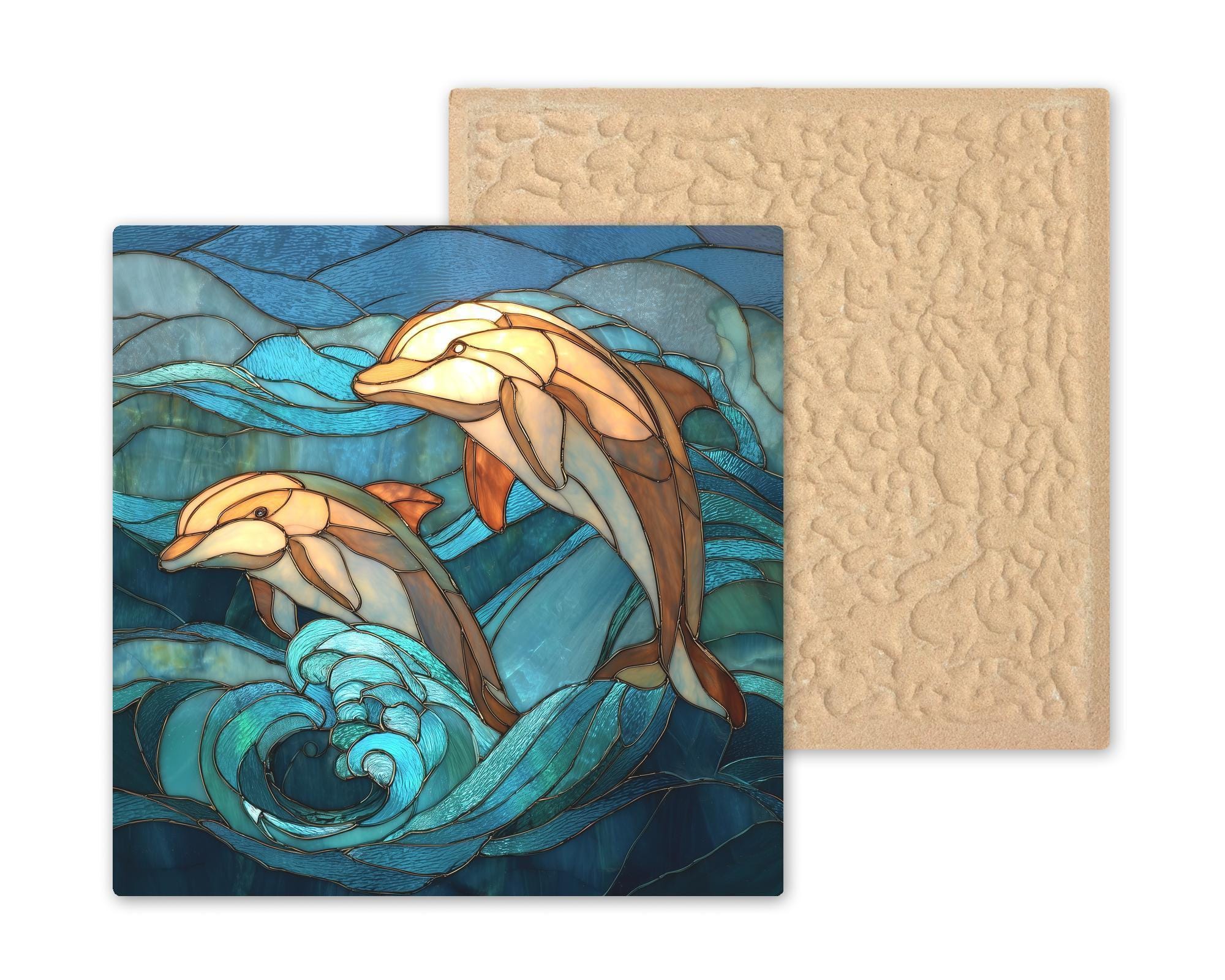 This stained glass-style dolphin ceramic tile brings a bright, uplifting coastal feeling into any home. The artwork features two graceful dolphins leaping through glowing teal waves, with layered ocean textures and warm highlights that create the look of illuminated stained glass. While the design appears sculpted and textured, this is a permanent print on a smooth ceramic tile—durable, vivid, and made to last. Many buyers choose this tile for beach homes, nautical decor, ocean-themed rooms, or as a unique coastal wildlife gift.