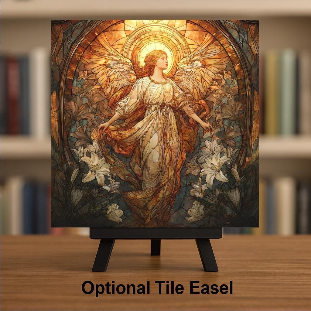 This ceramic tile is designed for shoppers who want meaningful decor with the look of stained glass but without the weight or fragility of real glass. The angel’s flowing robes, feathered wings, and halo of warm light create a gentle sense of protection and peace. The surrounding lilies add a soft symbolic touch, often associated with love, purity, and remembrance. This makes the piece a strong choice for memorials, sympathy gifts, or spiritual home accents.