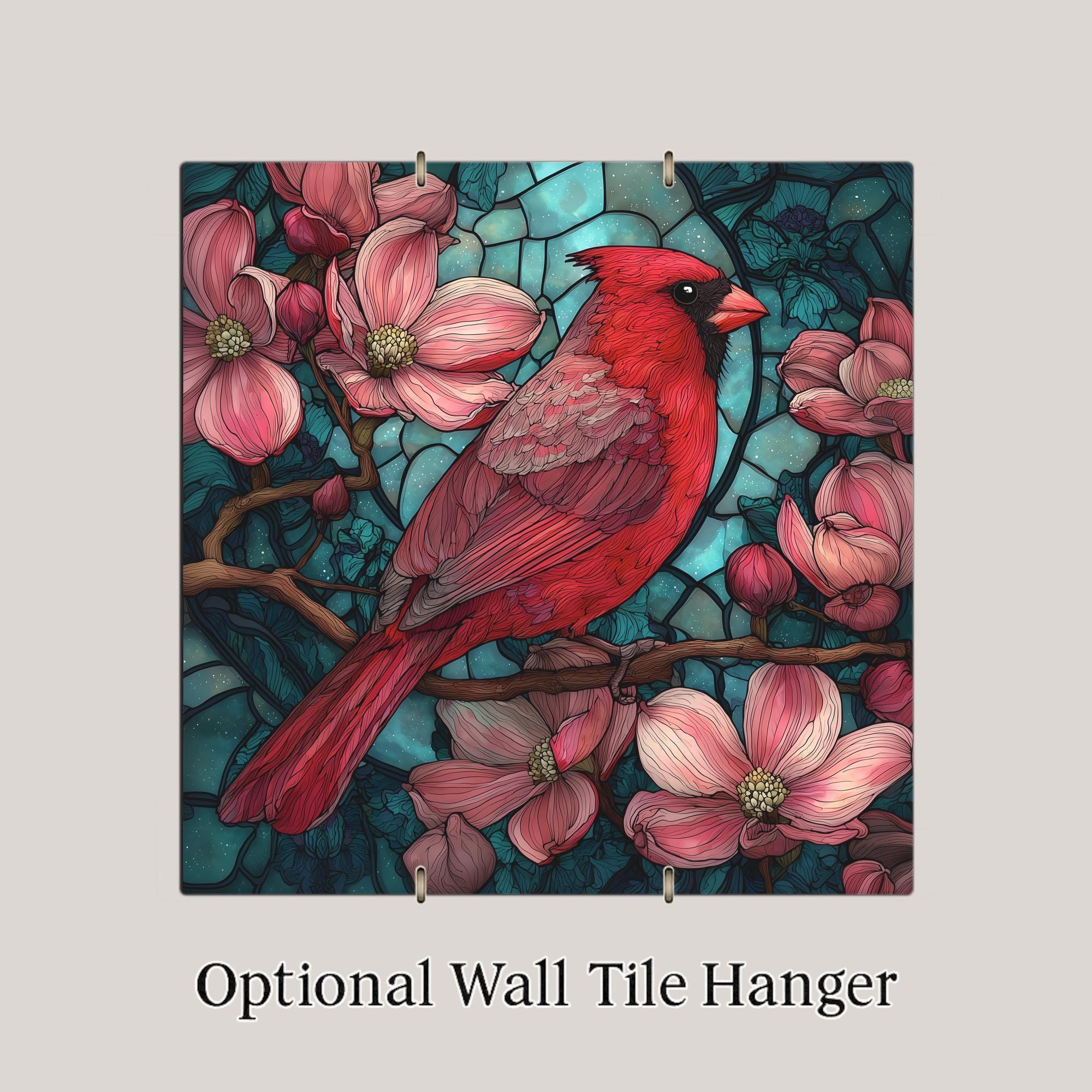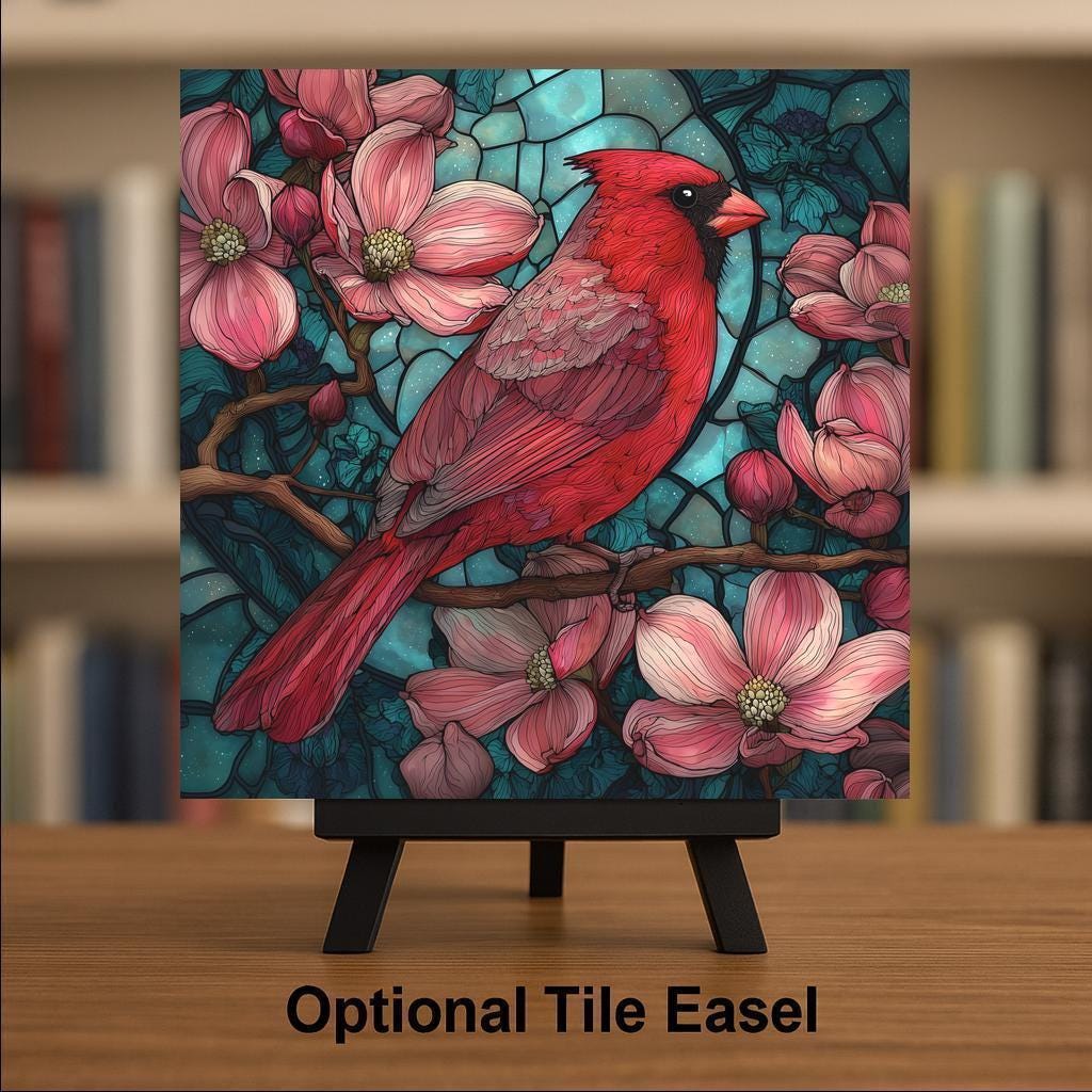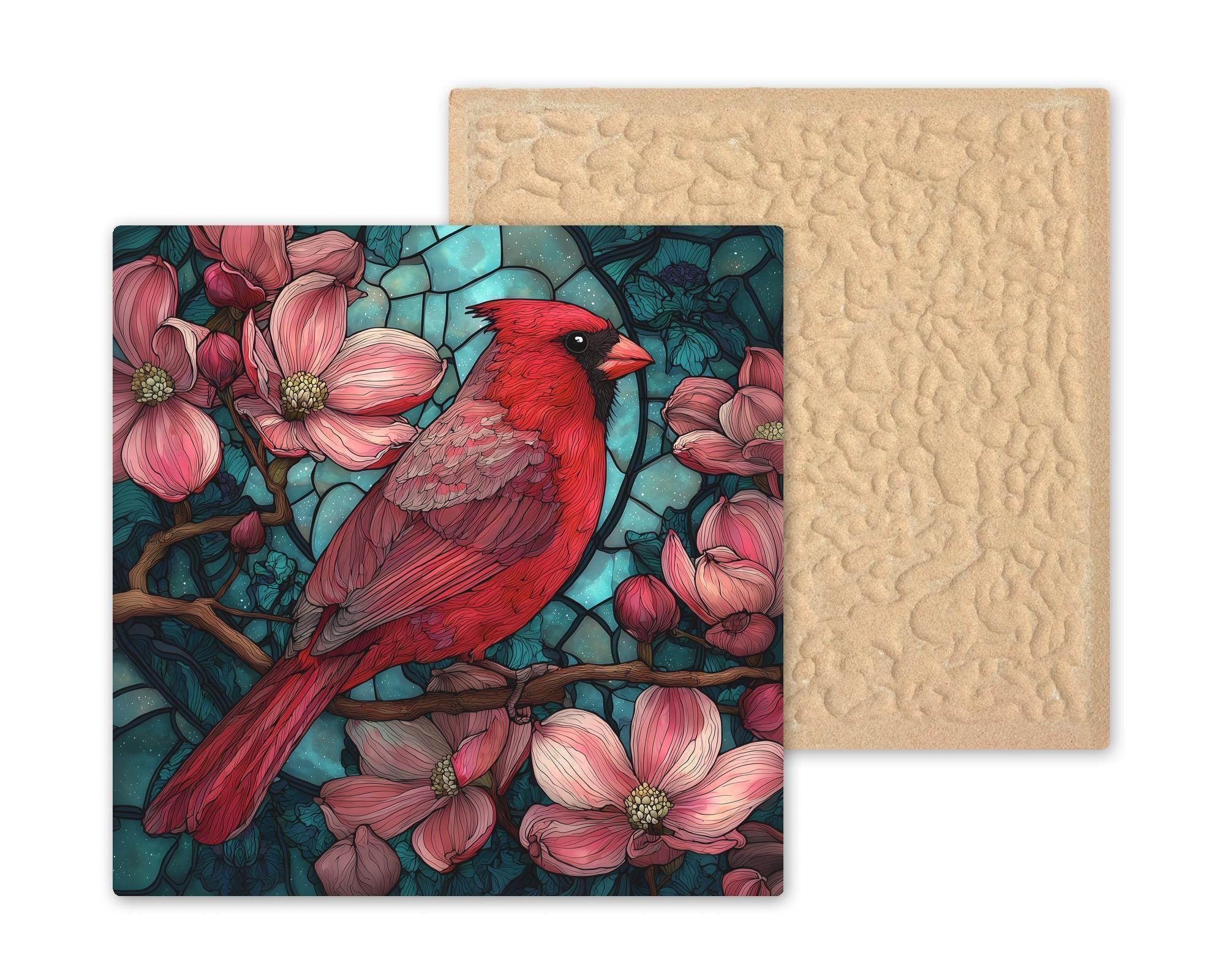 This stained-glass style red cardinal ceramic tile offers a striking mix of detail, brightness, and visual warmth. The design captures the iconic beauty of a cardinal perched among blooming flowers, with soft pink petals balanced against a bold teal sky. Because the artwork is permanently printed onto the ceramic surface, the colors remain vibrant over time and will not fade. While the artwork resembles stained glass, it is a printed ceramic tile, not an actual glass mosaic, giving you the look of stained-glass art in a durable format suitable for daily home decor.