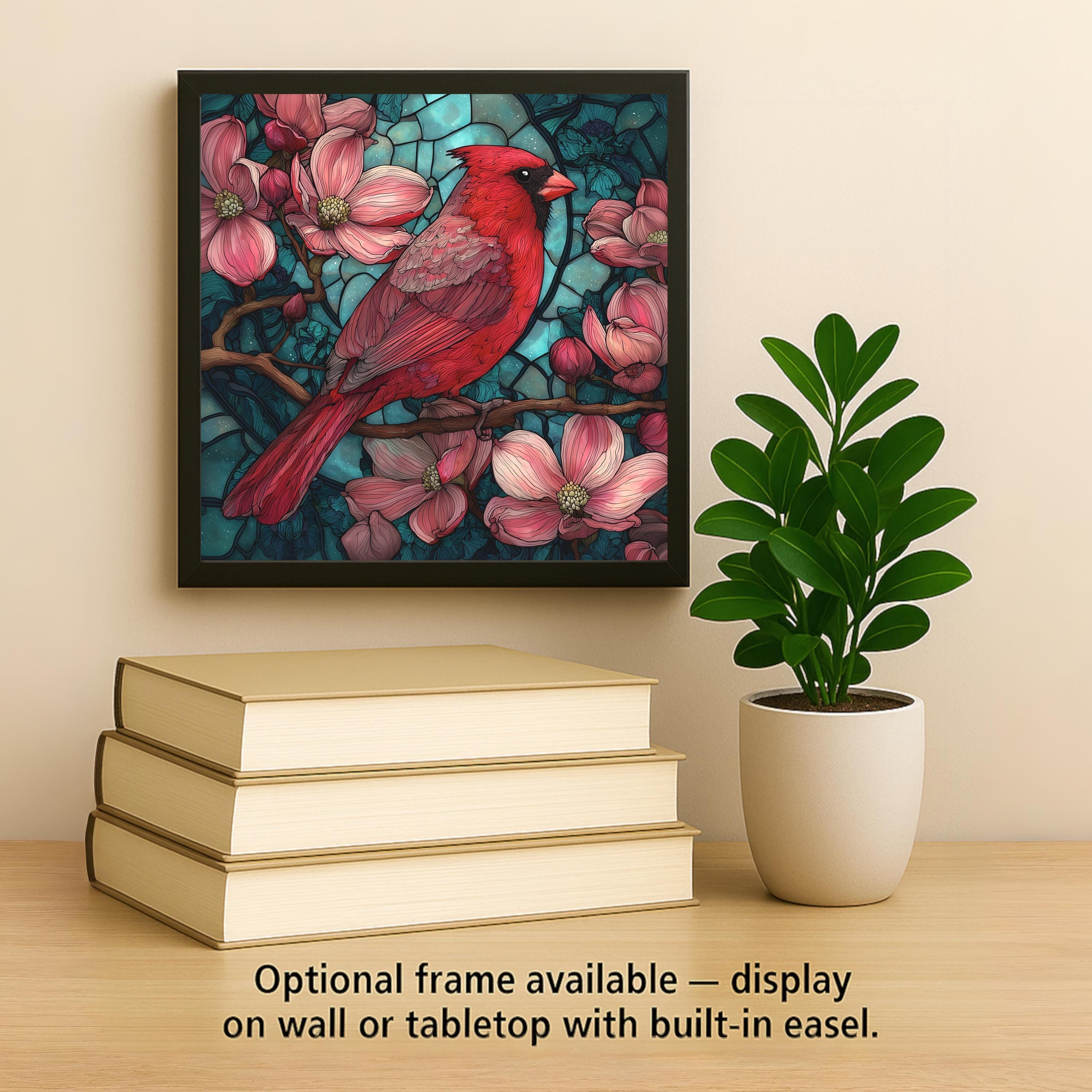 Optional add-ons help you customize your display. Choose a tile wall hanger for easy wall mounting, a cork backing for shelf display, an easel tile stand for tabletop decorating, or a premium frame that supports both hanging and standing. These additions enhance the artwork while giving you multiple ways to place it throughout your home. Each tile is shipped with protective packaging to ensure safe arrival. This red cardinal tile is a beautiful way to brighten a room and create a visually rich focal point that stays timeless.