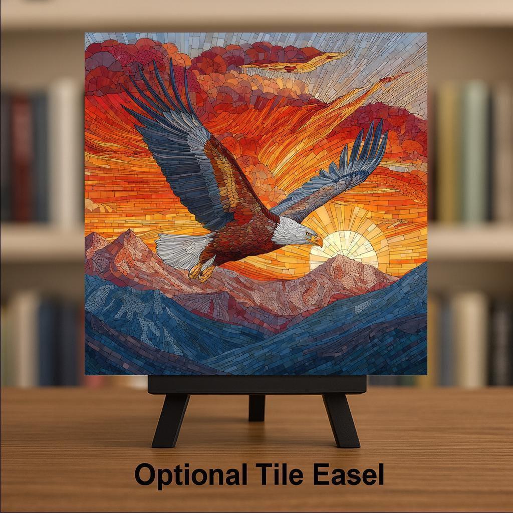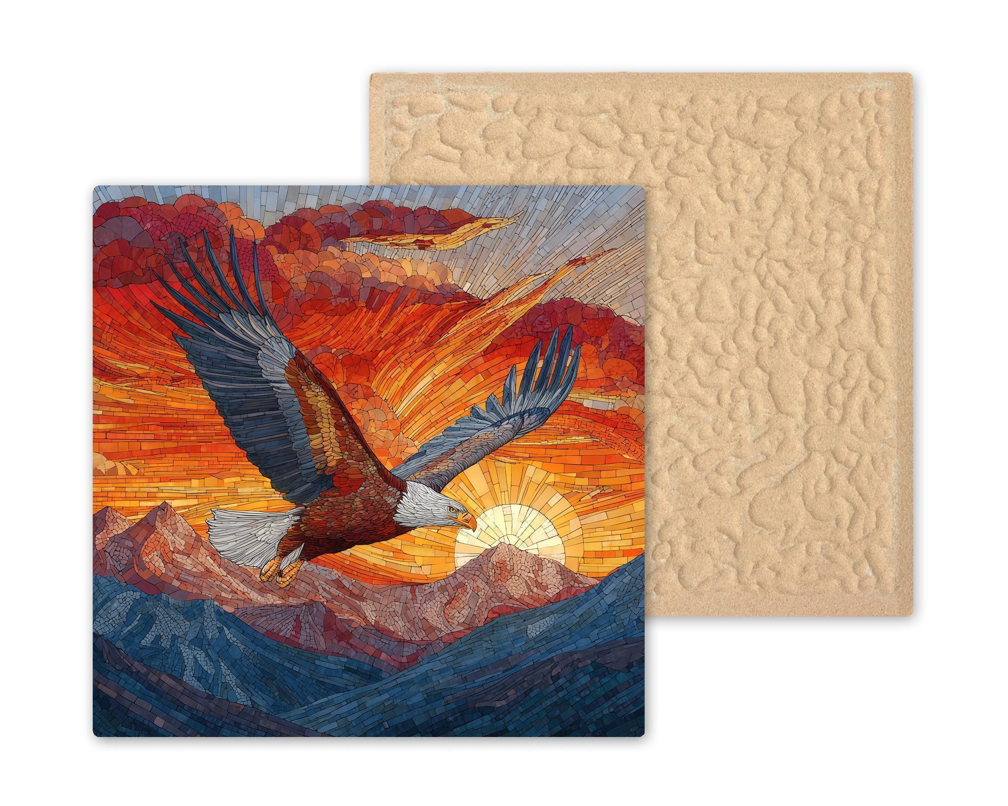 This eagle soaring at sunrise brings a sense of strength and freedom to any room. The stained glass style highlights the warm oranges, deep reds, and gemstone blues that appeal strongly to shoppers looking for patriotic wall art, nature scene tiles, and uplifting wildlife decor. The mosaic-style wings and mountain landscape offer a handcrafted aesthetic while remaining durable and easy to display.