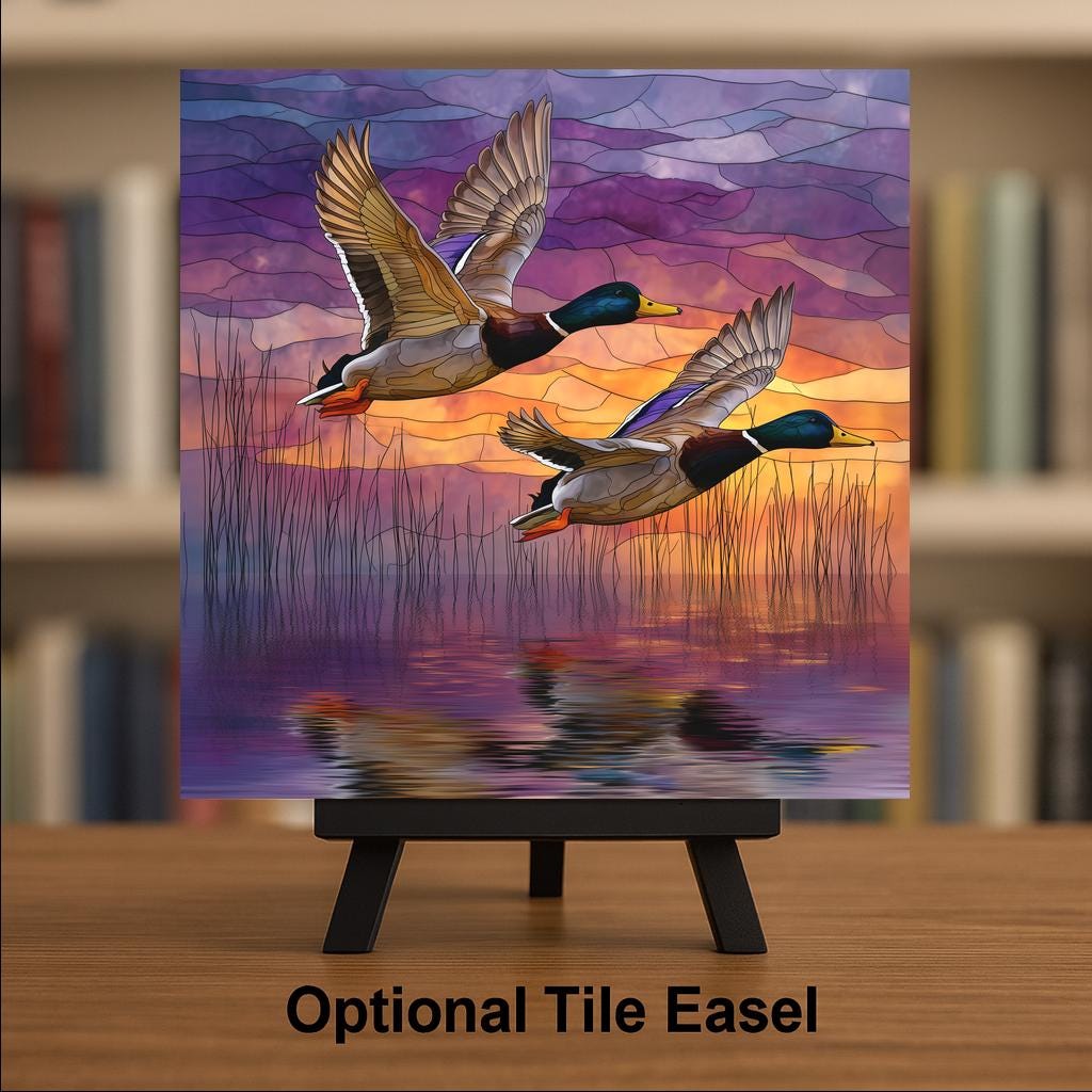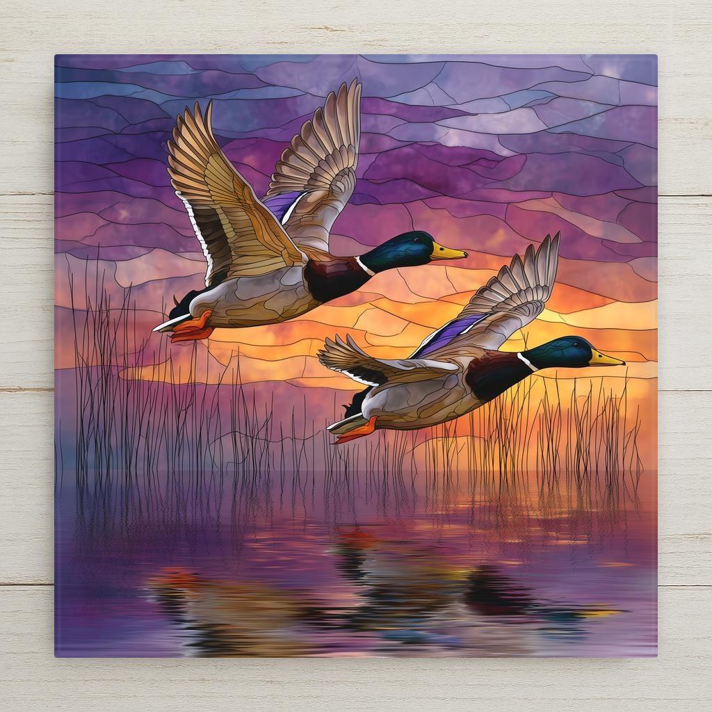 This stained glass–style Mallard Ducks Ceramic Tile Wall Art captures the peaceful feeling of a lake at sunset. The artwork features two mallard ducks flying low over the water as warm sunlight reflects across purple and orange skies. Although the design looks like real stained glass, it is a permanent print on ceramic tile, made to keep its color and detail for years.