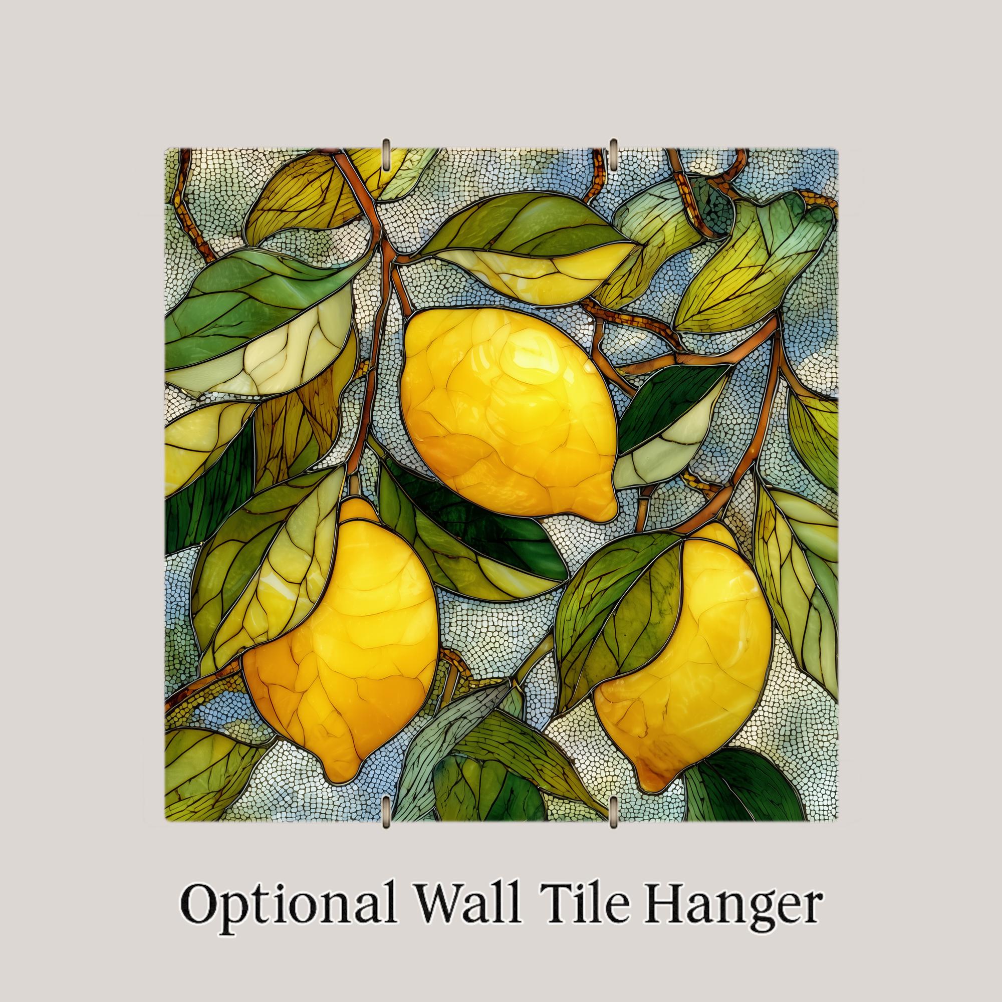 This Lemon Branch Ceramic Tile Wall Art brings a bright, cheerful Mediterranean feel to any kitchen or dining area. The artwork features vivid yellow lemons hanging from twisting branches with lush green leaves, all designed in a stained glass style that looks warm and glowing. Although the design appears like real stained glass, it is actually a permanent print on a ceramic tile, created to keep its rich color and fine detail for many years.