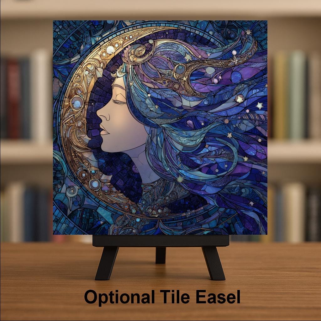Even though the art looks like stained glass, the image is actually a high-quality permanent print on ceramic tile. This makes it durable, vibrant, and easy to clean while still offering the look of handcrafted glass. The tile fits many décor styles including celestial décor, fantasy themes, boho spaces, and spiritual or goddess-inspired rooms.