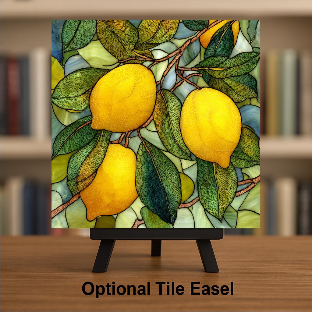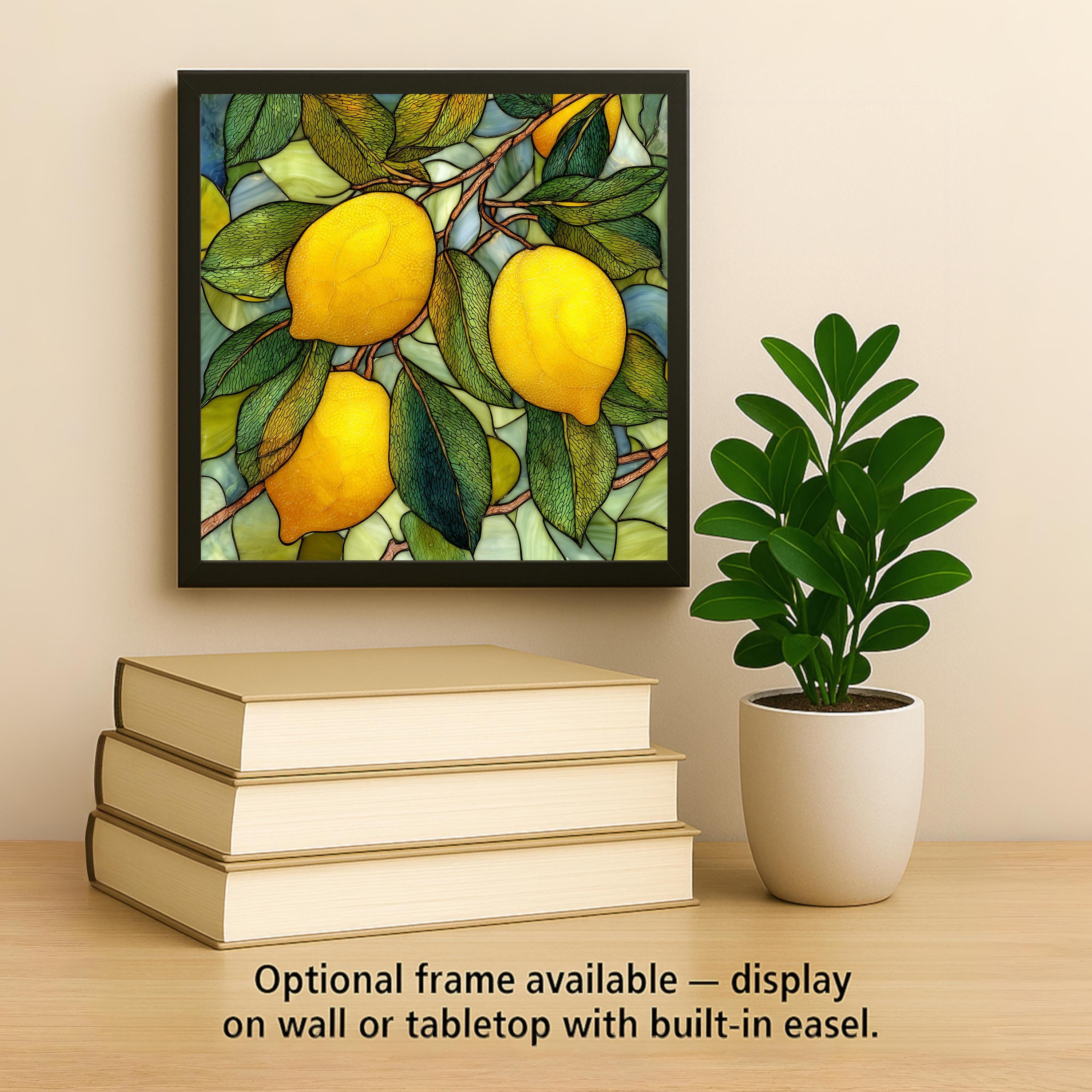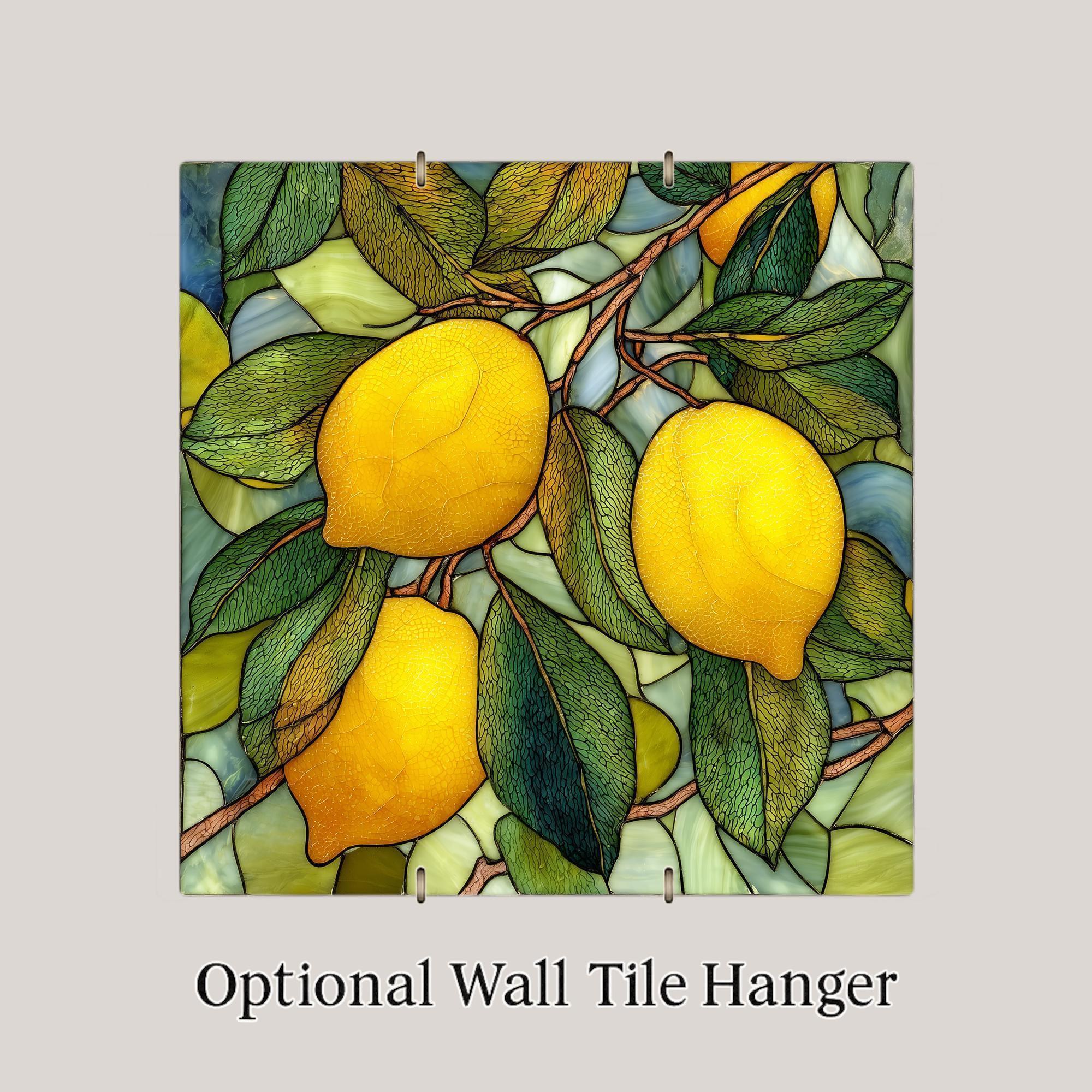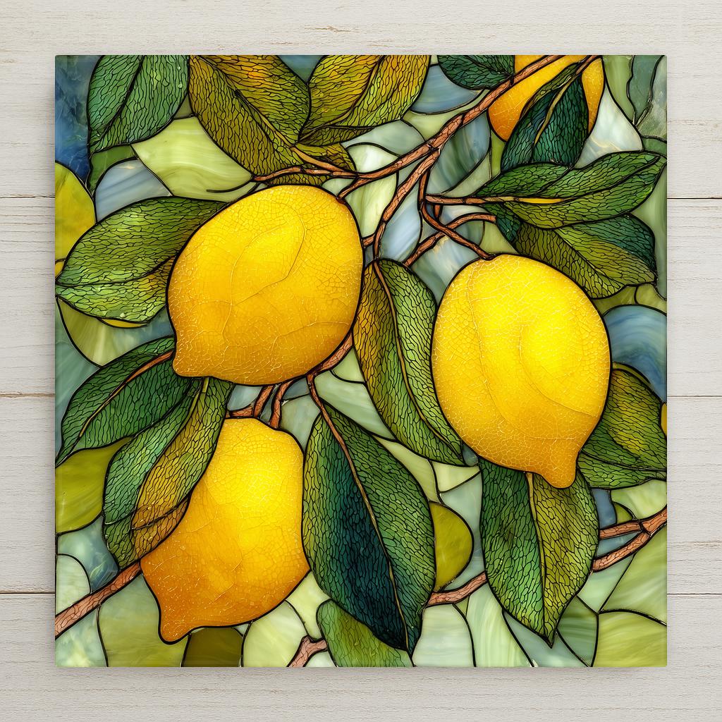 This stained glass style lemon branch ceramic tile wall art adds a fresh and cheerful look to any room. The bright yellow lemons and glossy green leaves create a warm Mediterranean mood. Many people enjoy citrus artwork because it brings energy, color, and a sense of sunlight into the home. This piece has a clean, vibrant look that works well in kitchens, dining rooms, patios, and modern farmhouse spaces.