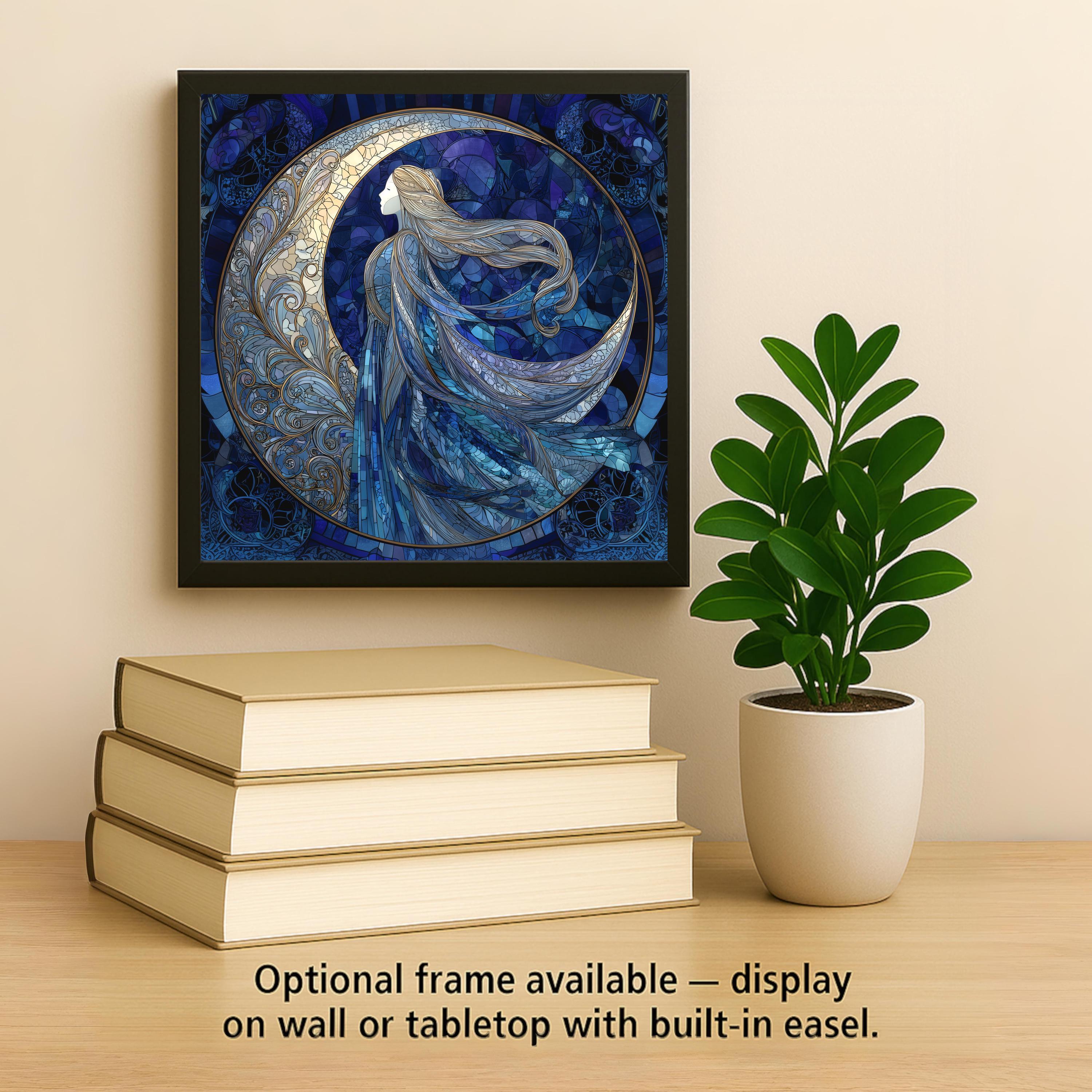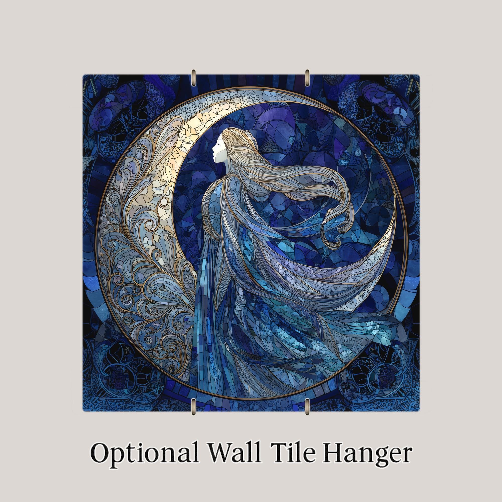 Bring a sense of calm and magic into your home with this Moon Goddess ceramic tile wall art. The design features a flowing celestial goddess wrapped in deep blue stained-glass textures and soft moonlit tones. Each detail creates a peaceful and dreamlike look that stands out beautifully in any room. This artwork adds a relaxing mood that works well in bedrooms, living spaces, reading nooks, and meditation areas.