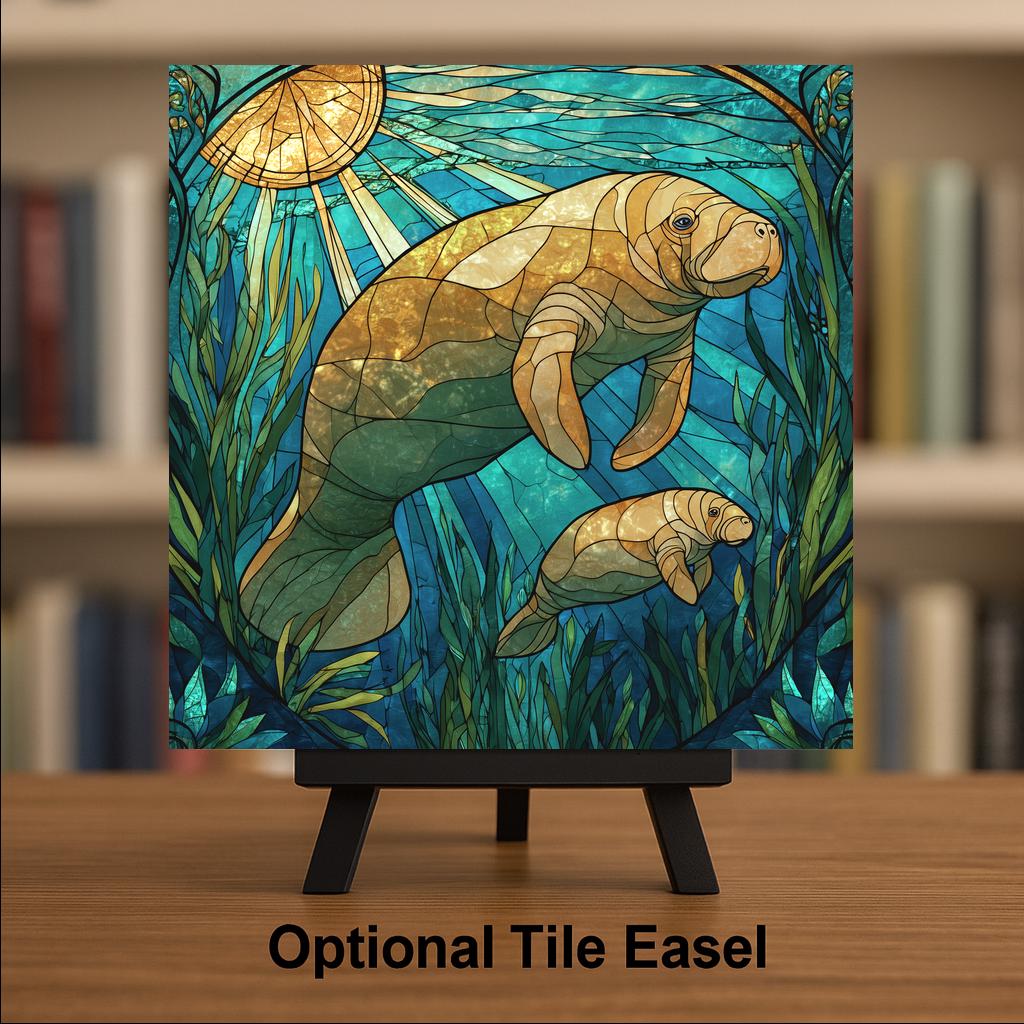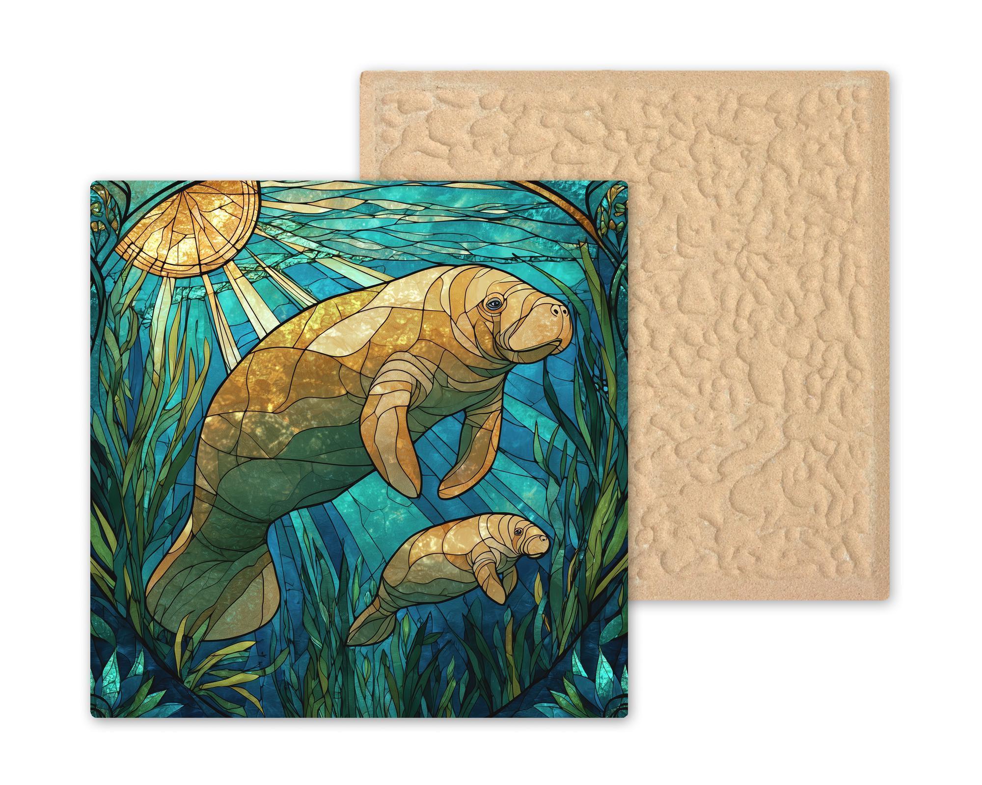This stained glass style manatee ceramic tile brings a warm and peaceful ocean feeling into your home. The artwork shows two gentle manatees gliding through clear blue water with sunbeams shining from above. Each piece is permanently printed onto a ceramic tile, giving rich color and lasting detail without the fragility of real stained glass. It makes a beautiful accent for coastal spaces, beach houses, bathrooms, kitchens, and anywhere that could use a relaxing touch of sea life.