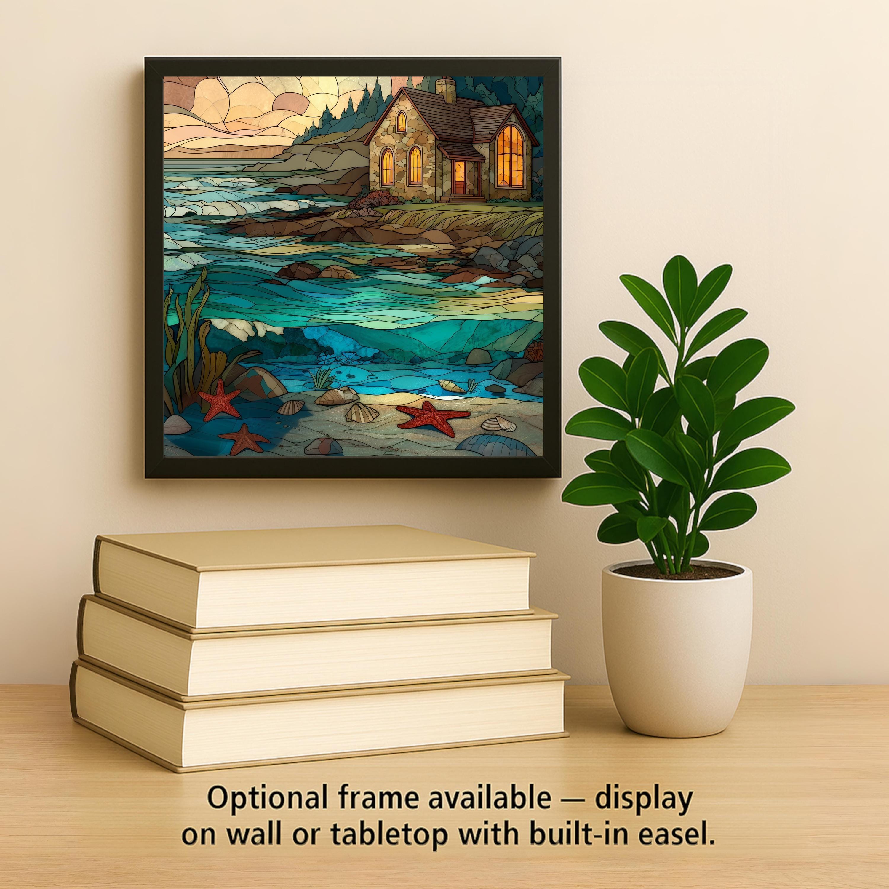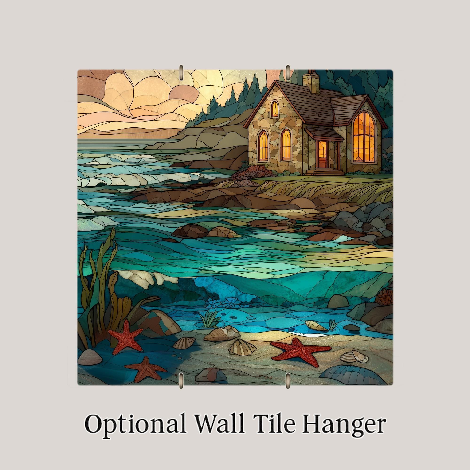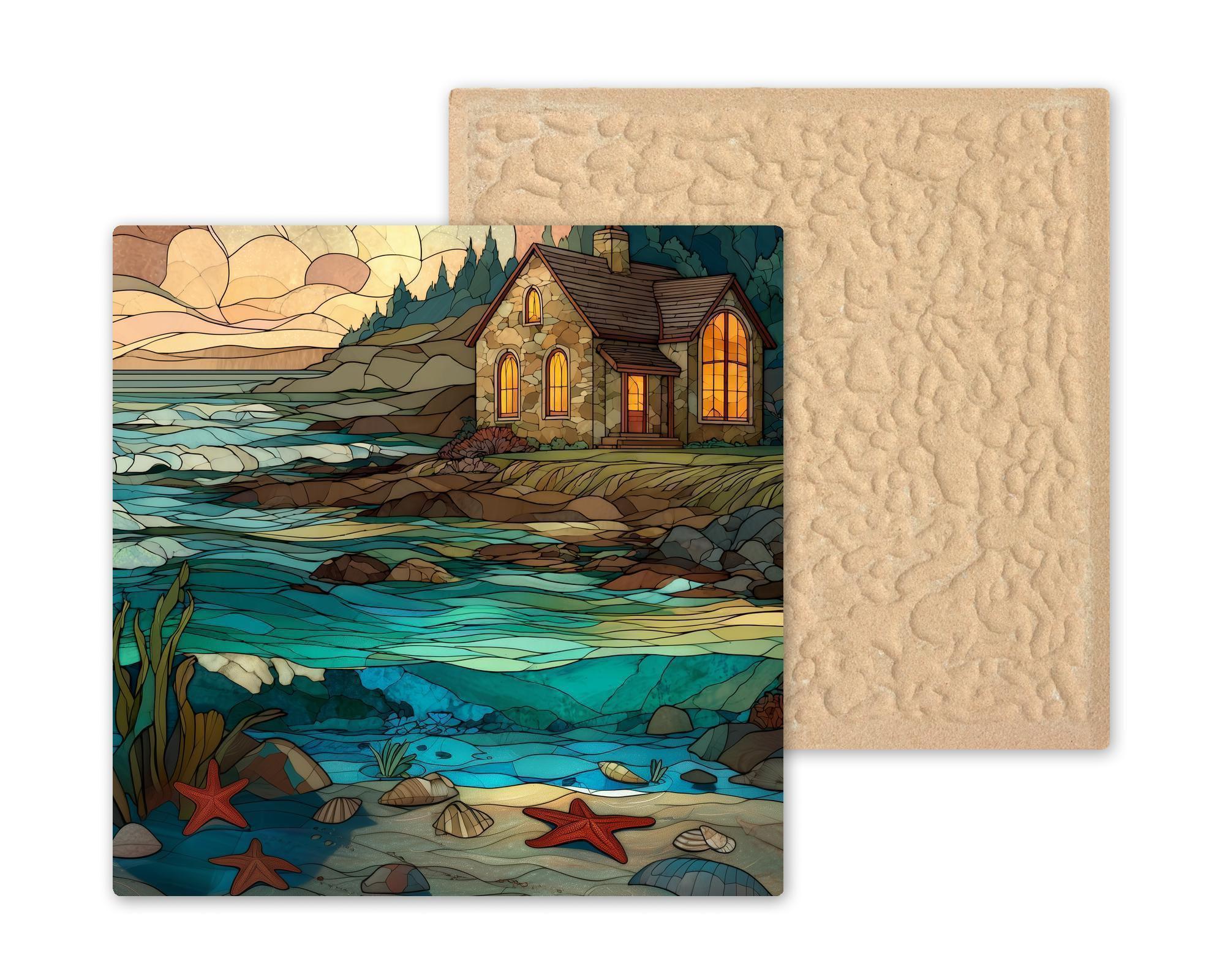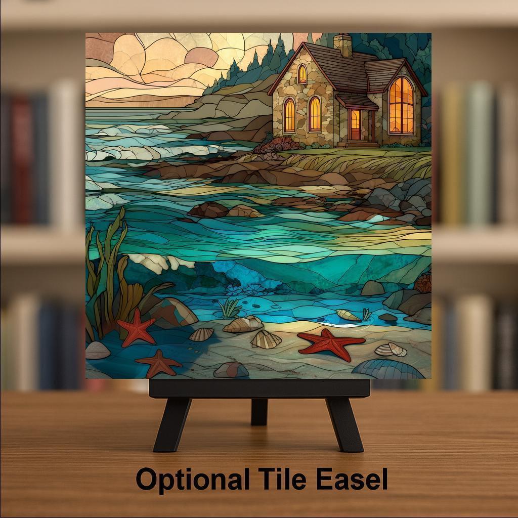 This stained glass style coastal cottage ceramic tile brings the peaceful feeling of the shoreline into your home. The artwork features a warm stone cottage with glowing windows, rolling ocean waves, gentle tide pools, and starfish resting along the sand. Every detail is permanently printed onto a ceramic tile, giving you rich color, depth, and texture without the fragility of real stained glass. It fits beautifully in coastal homes, beach houses, entryways, kitchens, and relaxing living spaces.