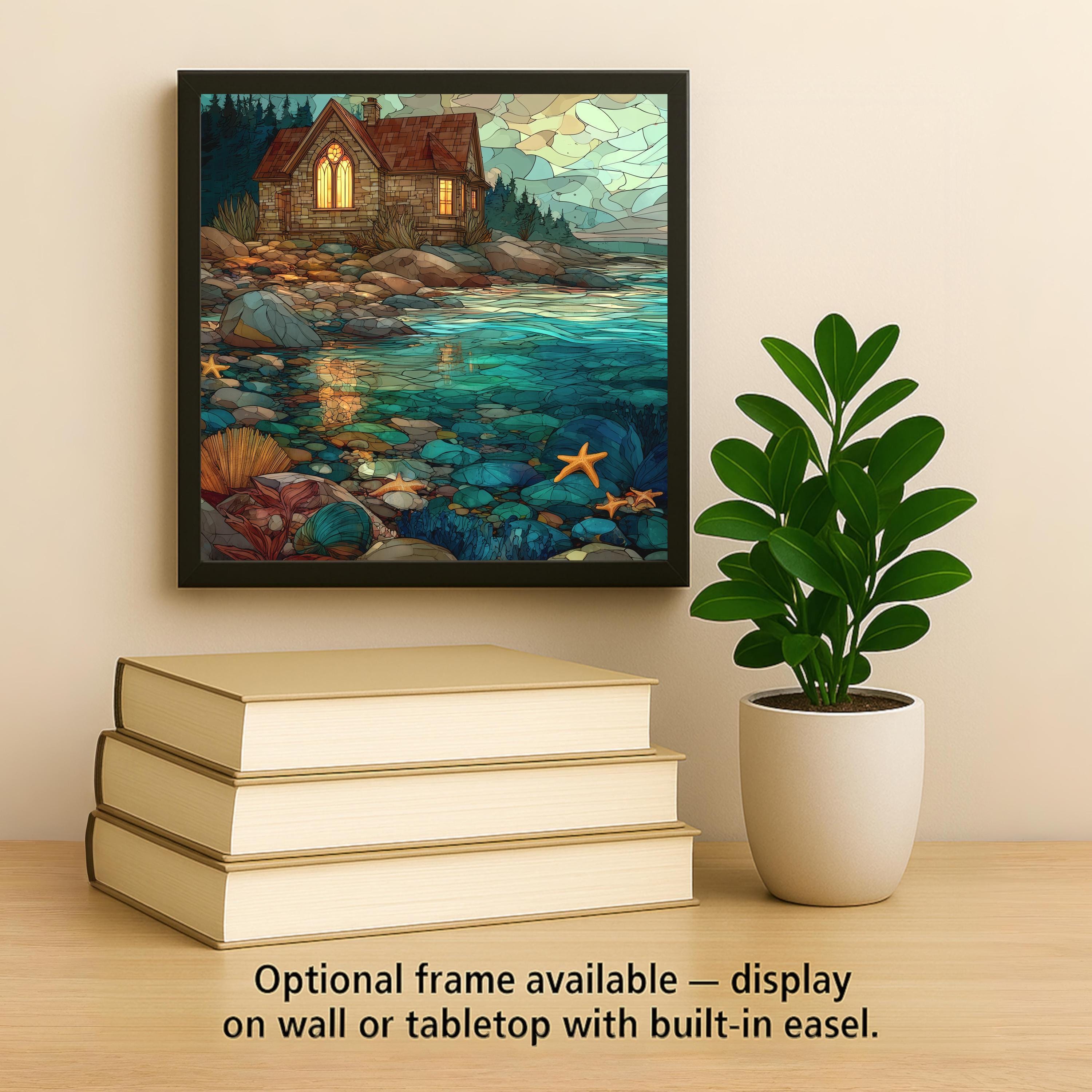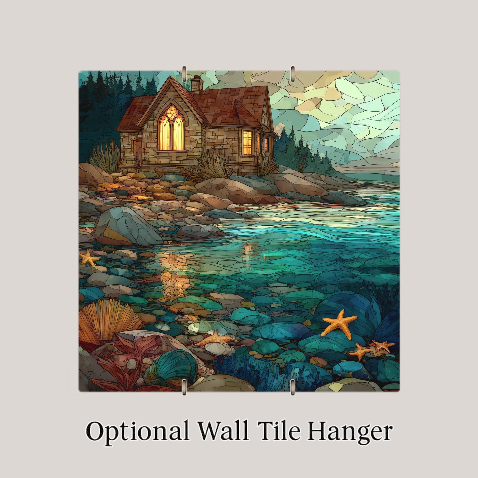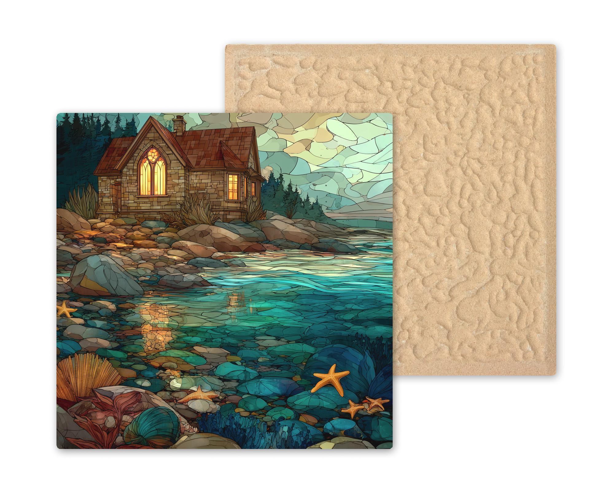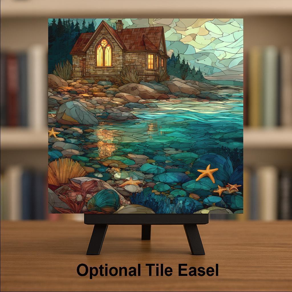This stained glass style coastal cottage ceramic tile brings the peaceful beauty of the shoreline straight into your home. The scene features a warm stone cottage with glowing windows, surrounded by rocky tide pools, teal water, starfish, shells, and colorful coastal textures. The image is permanently printed onto a ceramic tile, giving you vivid colors and lasting durability without the fragility of real stained glass. It’s a stunning accent for coastal décor, beach homes, ocean-themed rooms, and serene living spaces.