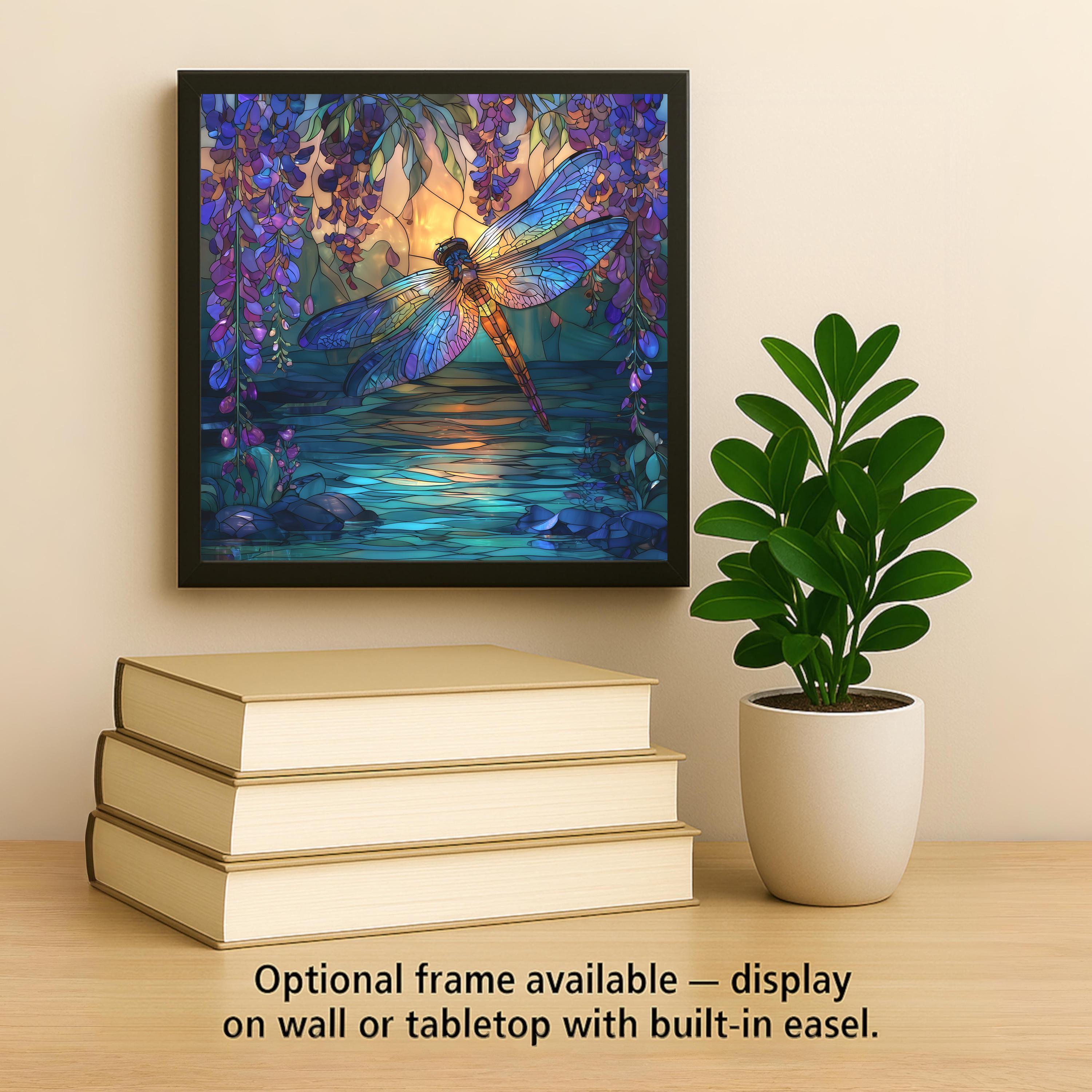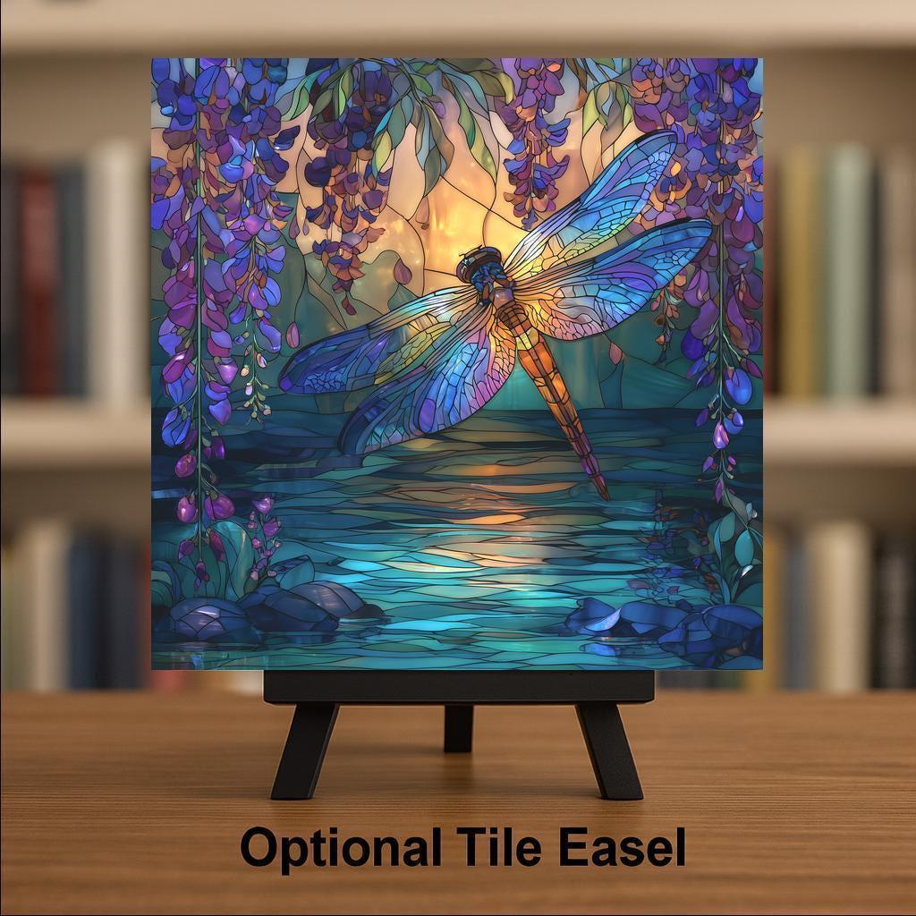 You can display the tile in several ways using optional accessories: a tile wall hanger, easel tile stand, cork backing, or our premium frame that works for wall or tabletop display. Each tile is printed using a special process that creates rich, lasting color and clarity—something our customers consistently love. This piece also makes a meaningful gift for dragonfly enthusiasts, gardeners, and collectors of stained glass style art.