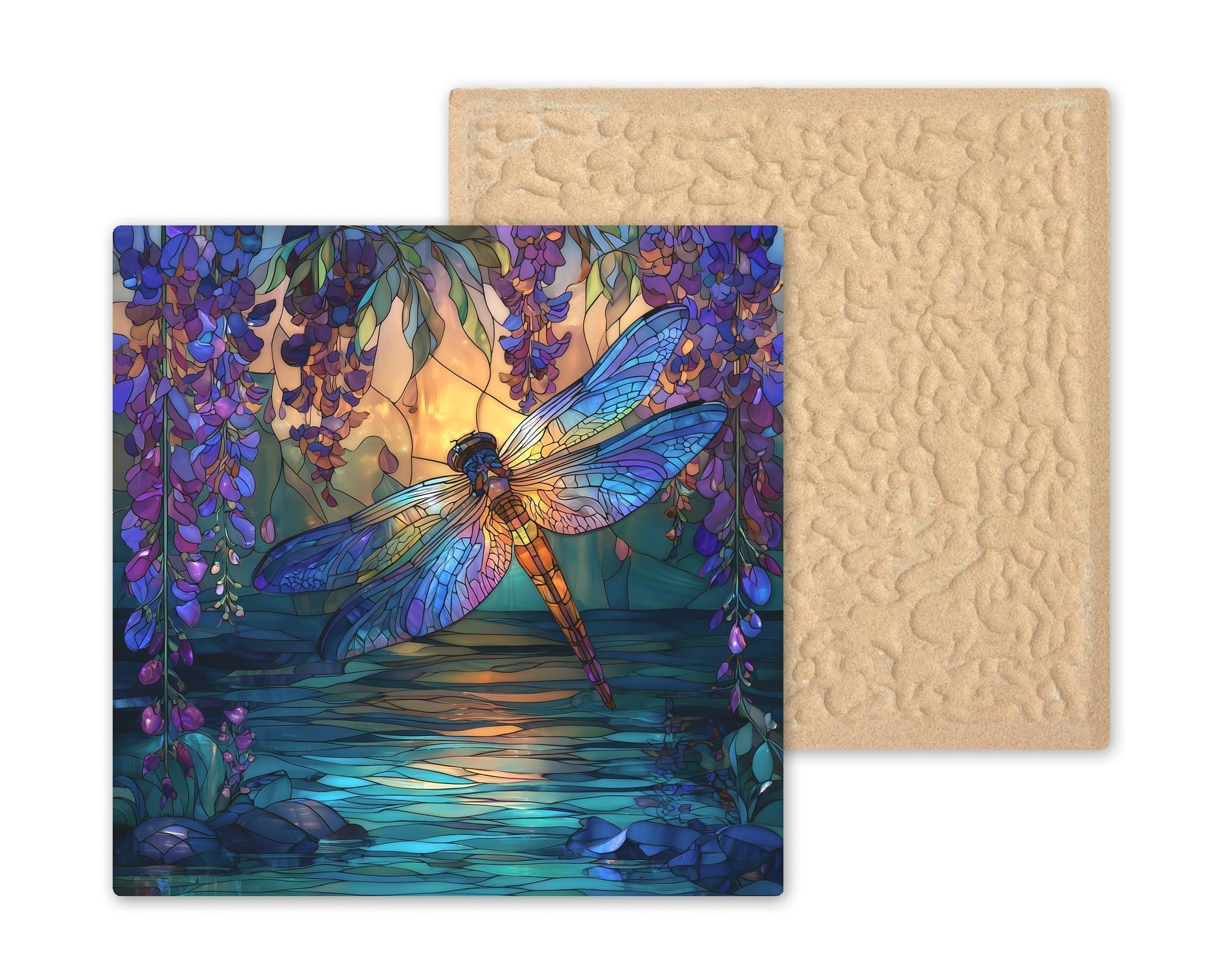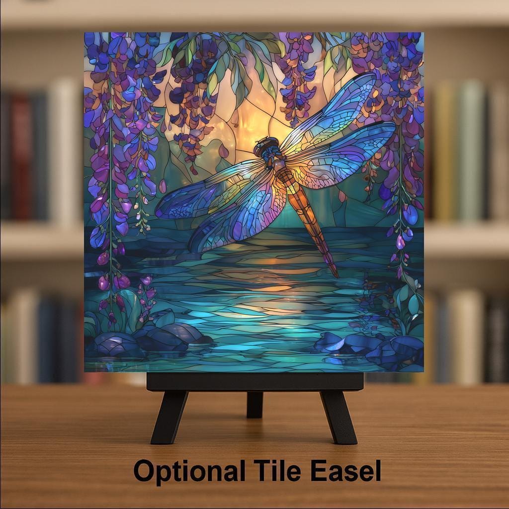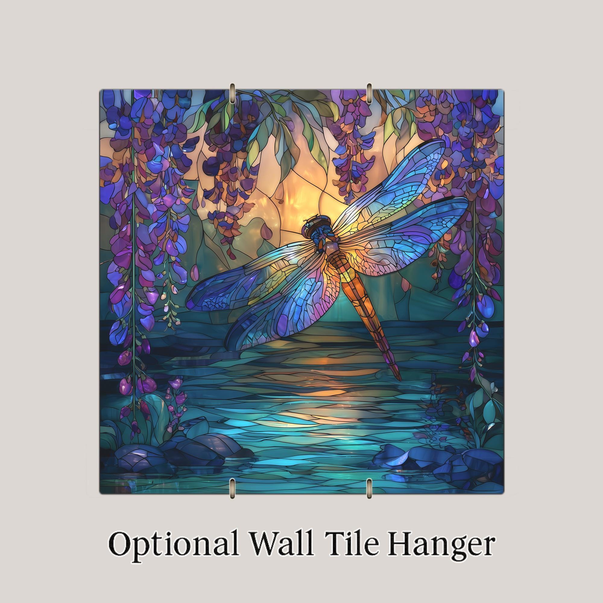 This stained glass style dragonfly ceramic tile brings a serene and enchanting feeling to any room. The artwork shows a luminous dragonfly hovering above a teal pond, surrounded by cascading wisteria and warm sunset light. The permanent print on ceramic creates a glowing effect that mimics stained glass without the fragility or maintenance. It’s perfect for nature lovers, garden-inspired décor, and anyone who enjoys peaceful, magical artwork in their home.