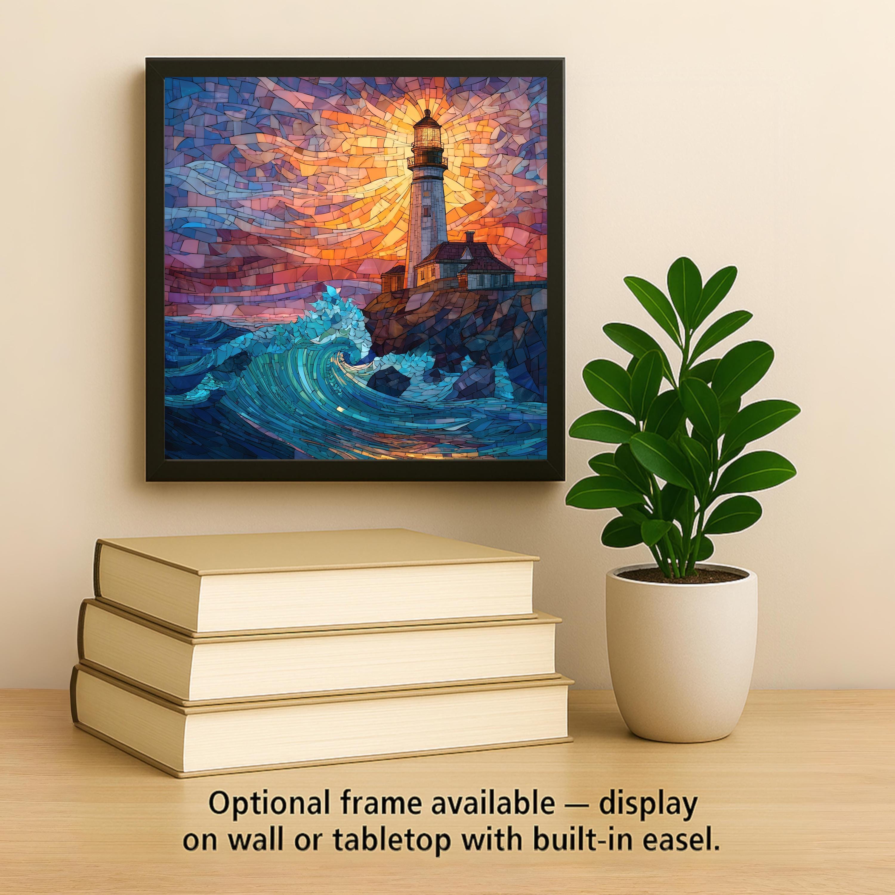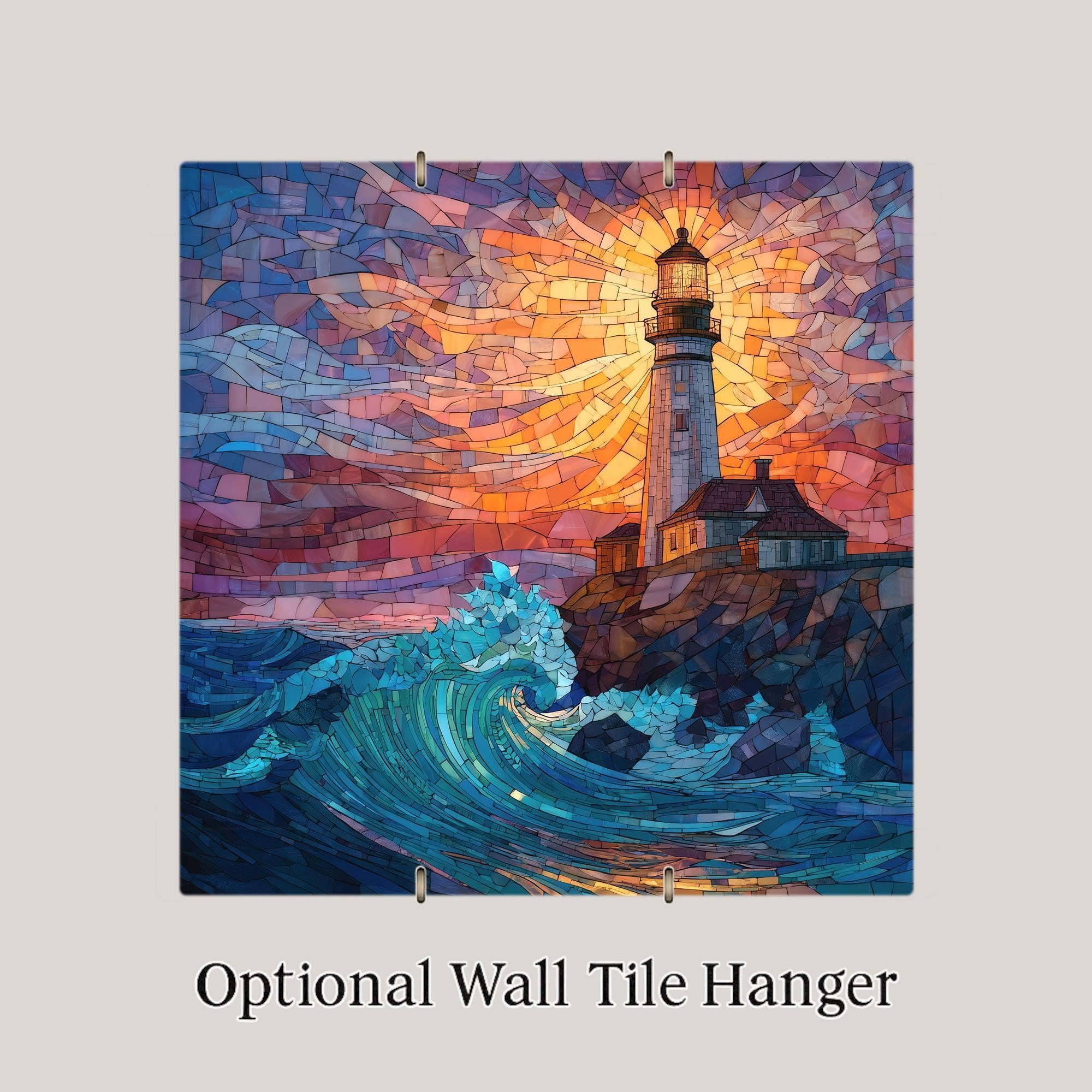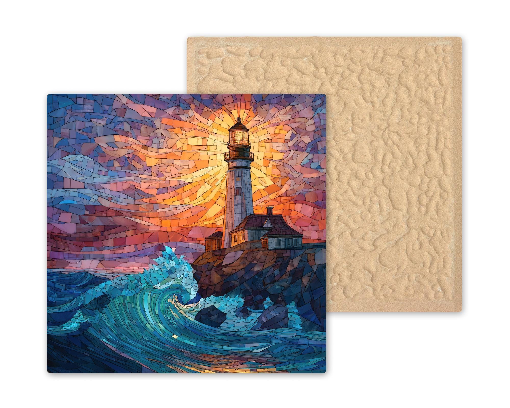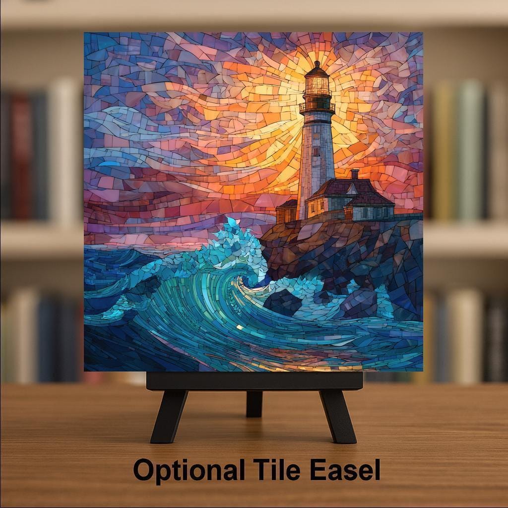 Bring the warmth of a coastal sunset into your home with this stained-glass-style lighthouse ceramic tile. The artwork features a glowing sky, shining lighthouse beacon, and powerful blue-green waves, creating a scene full of movement and color. The design feels bright and handcrafted, yet it is a permanent print on ceramic and not actual stained glass or mosaic. This gives you the look of stained glass with the durability of tile. The colors stay sharp and vibrant, and the tile is easy to clean and display.