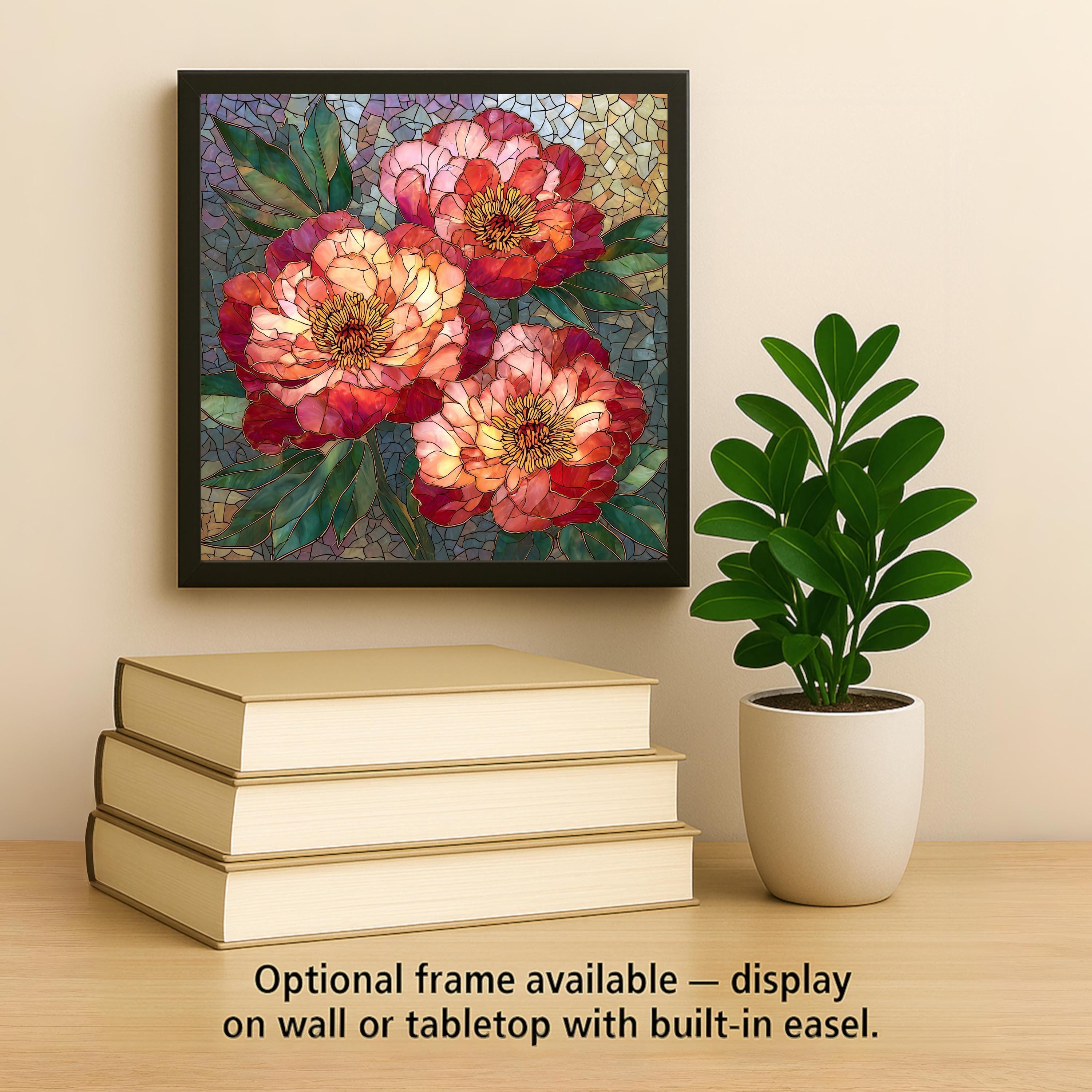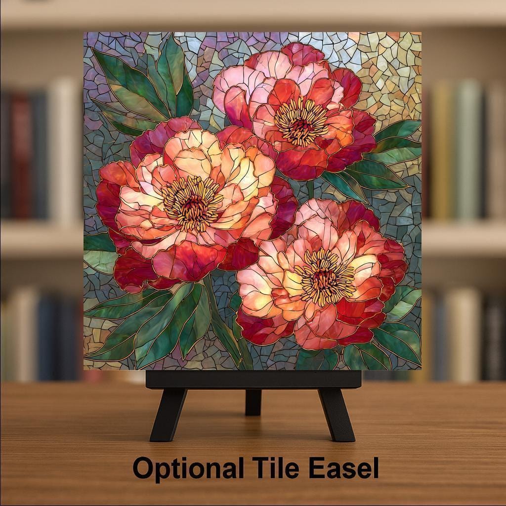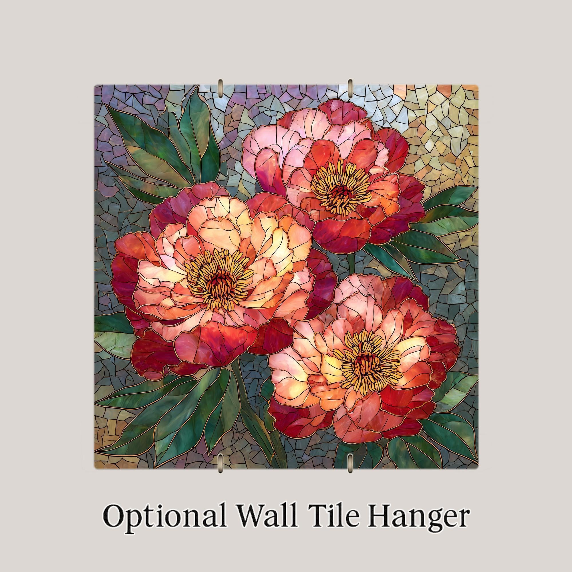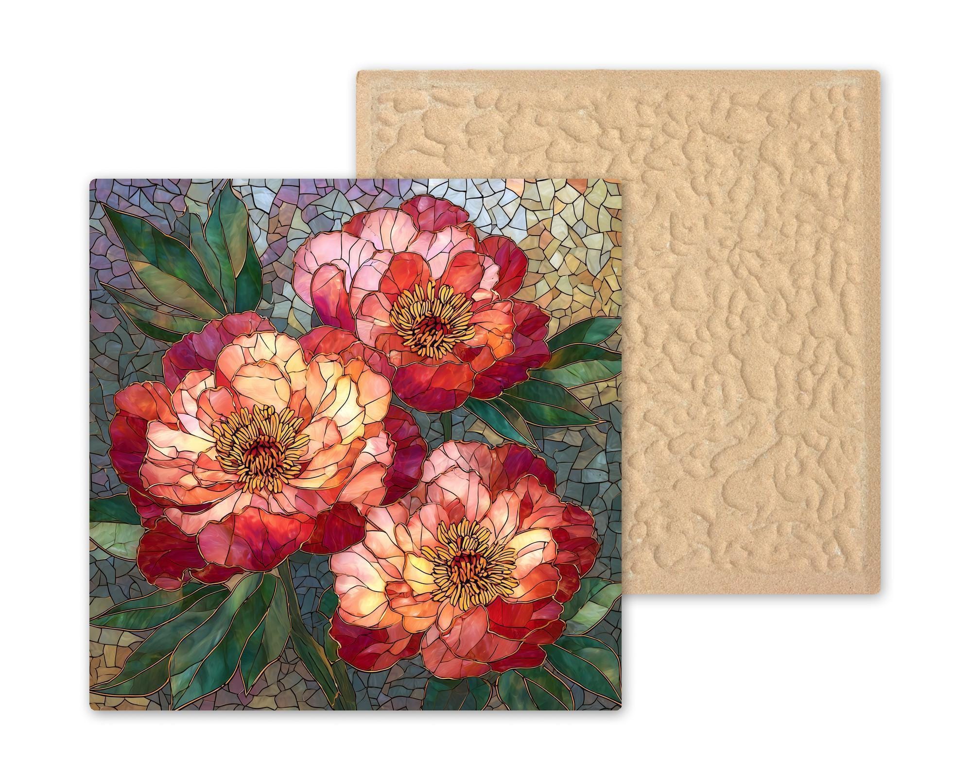 Bring the beauty of blooming peonies into your home with this stained glass–style ceramic tile featuring vibrant pink and coral flowers set against a softly textured mosaic background. The detailed linework and glowing color transitions create a stunning stained-glass effect, while the ceramic tile offers durability and a premium feel. This piece is ideal for cottage-style interiors, botanical décor, floral art collections, and nature-inspired home accents. Its warm palette brightens any room and adds a charming artistic focal point.