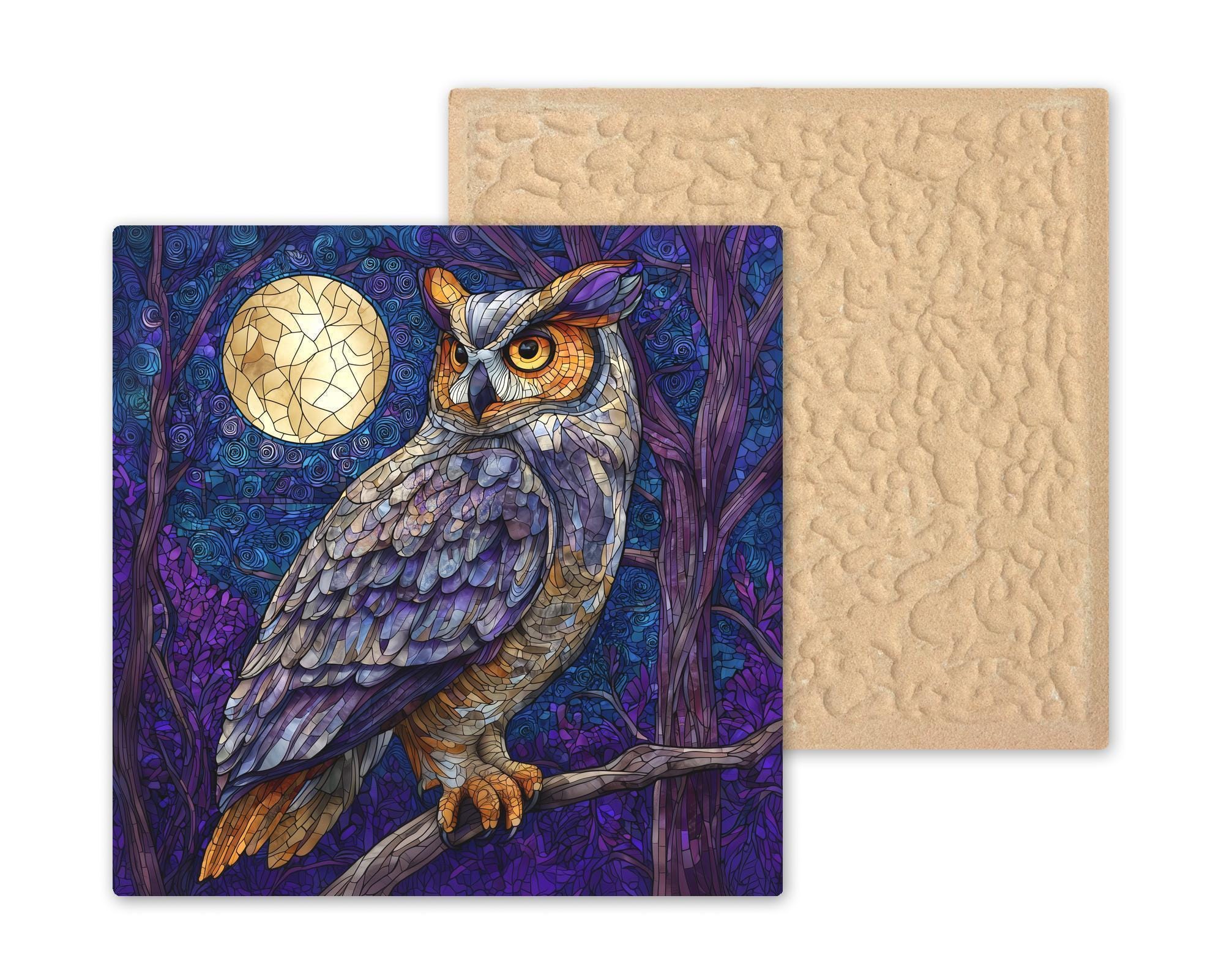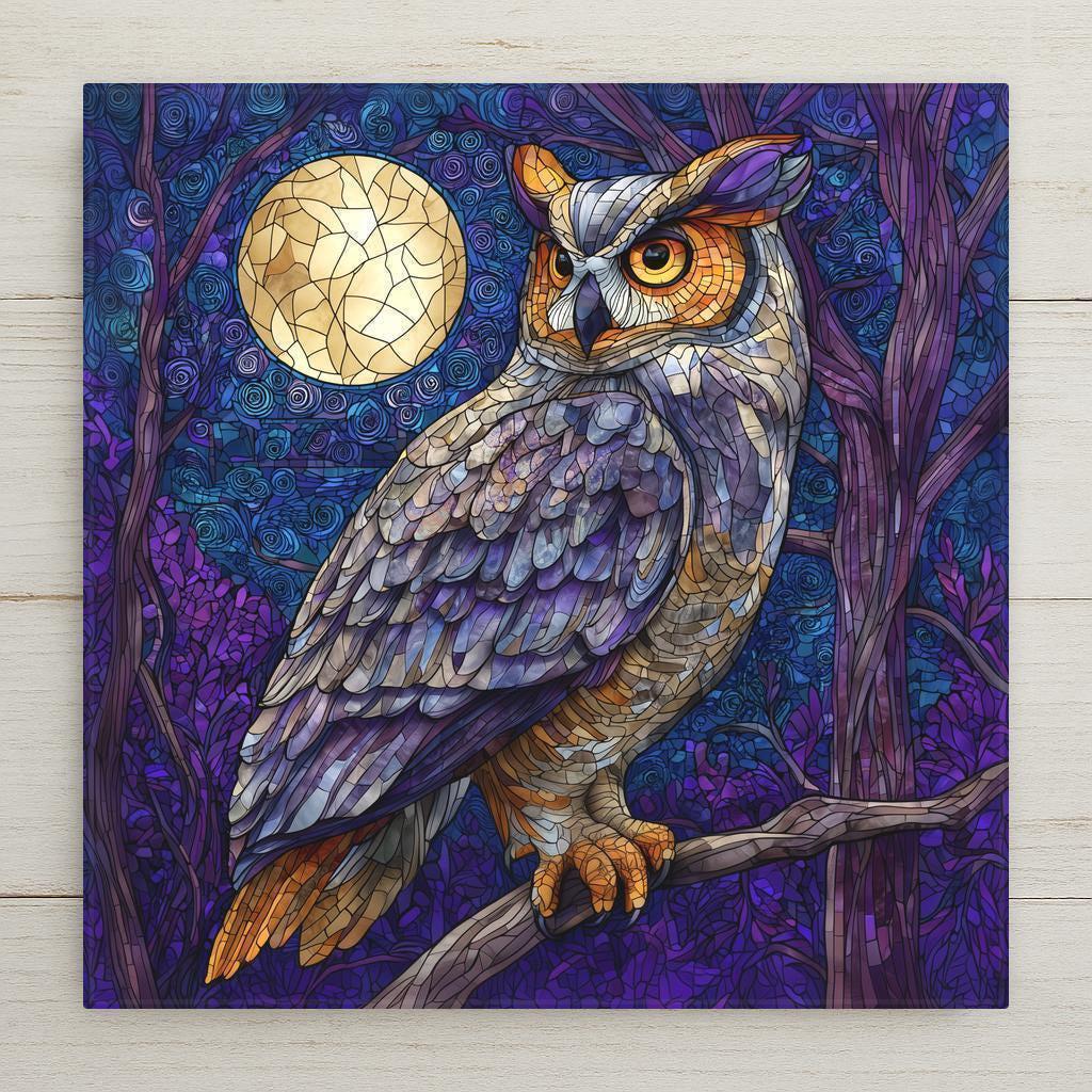 Bring the enchantment of the night forest into your home with this stained glass–style owl ceramic tile, featuring luminous moonlight, swirling background details, and rich jewel-toned colors. The artwork blends natural beauty with bold visual texture, making it a standout addition to woodland décor, rustic home styling, or wildlife-inspired art collections. The permanent printing process creates vivid, long-lasting detail that enhances the layered look of feathers, branches, and shadowed foliage.