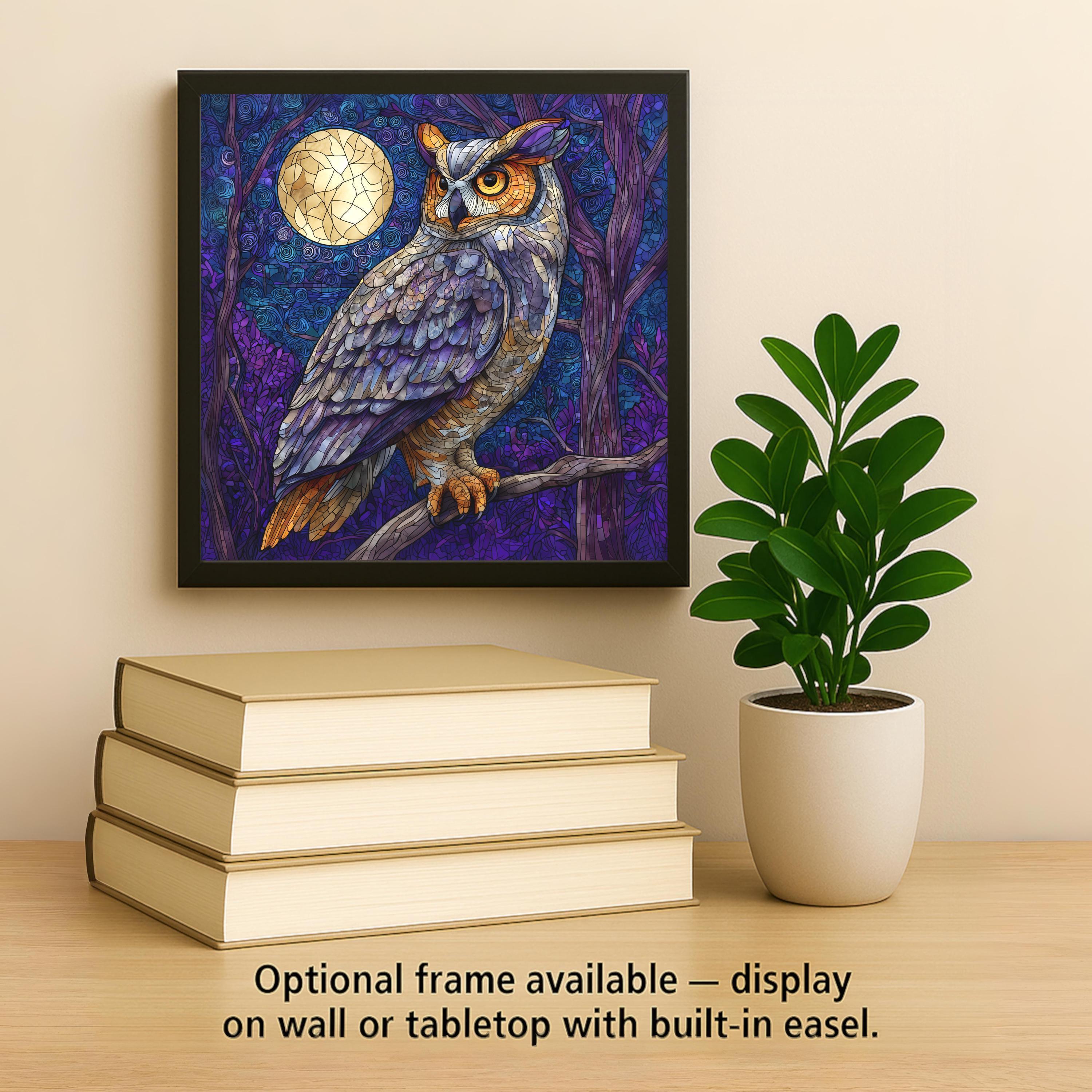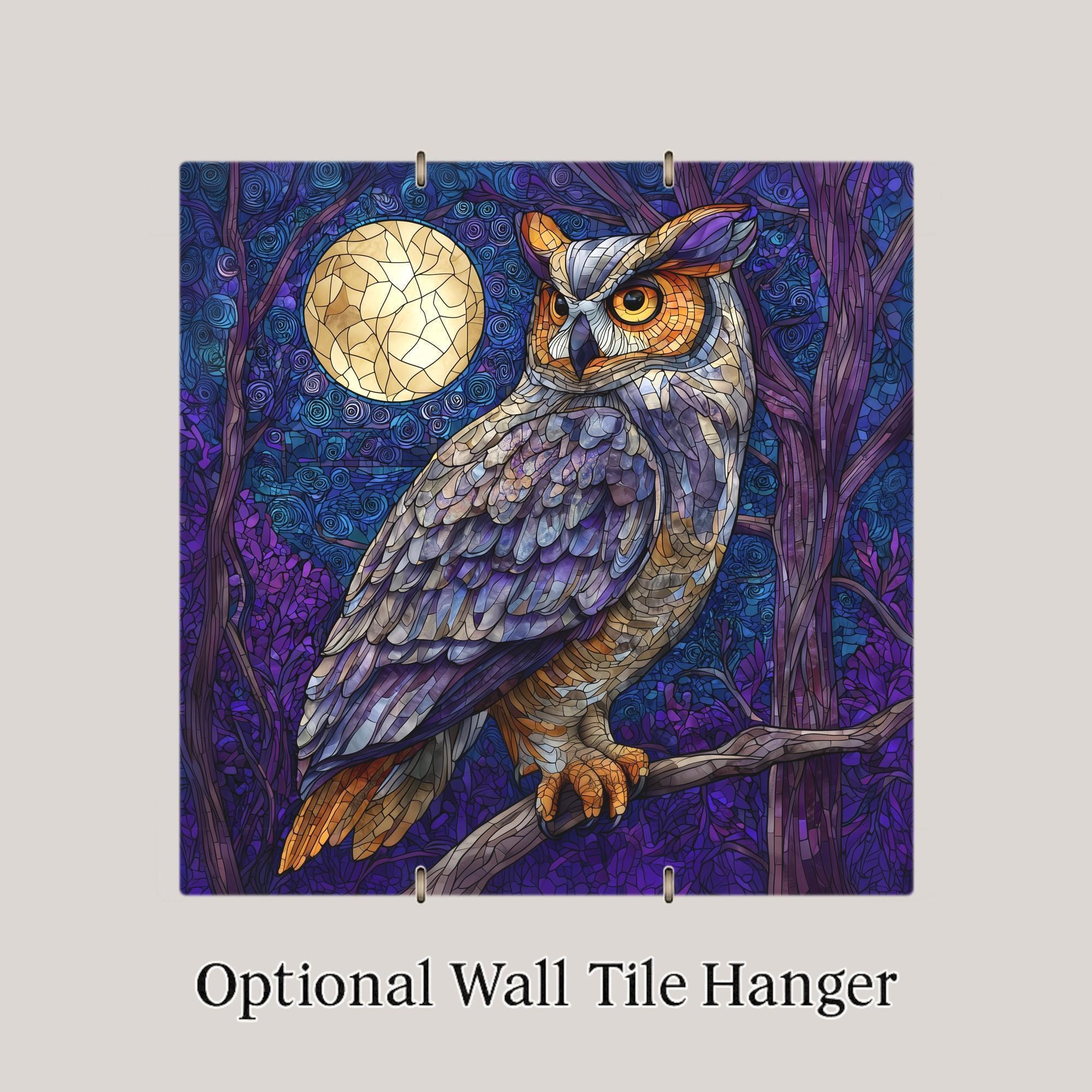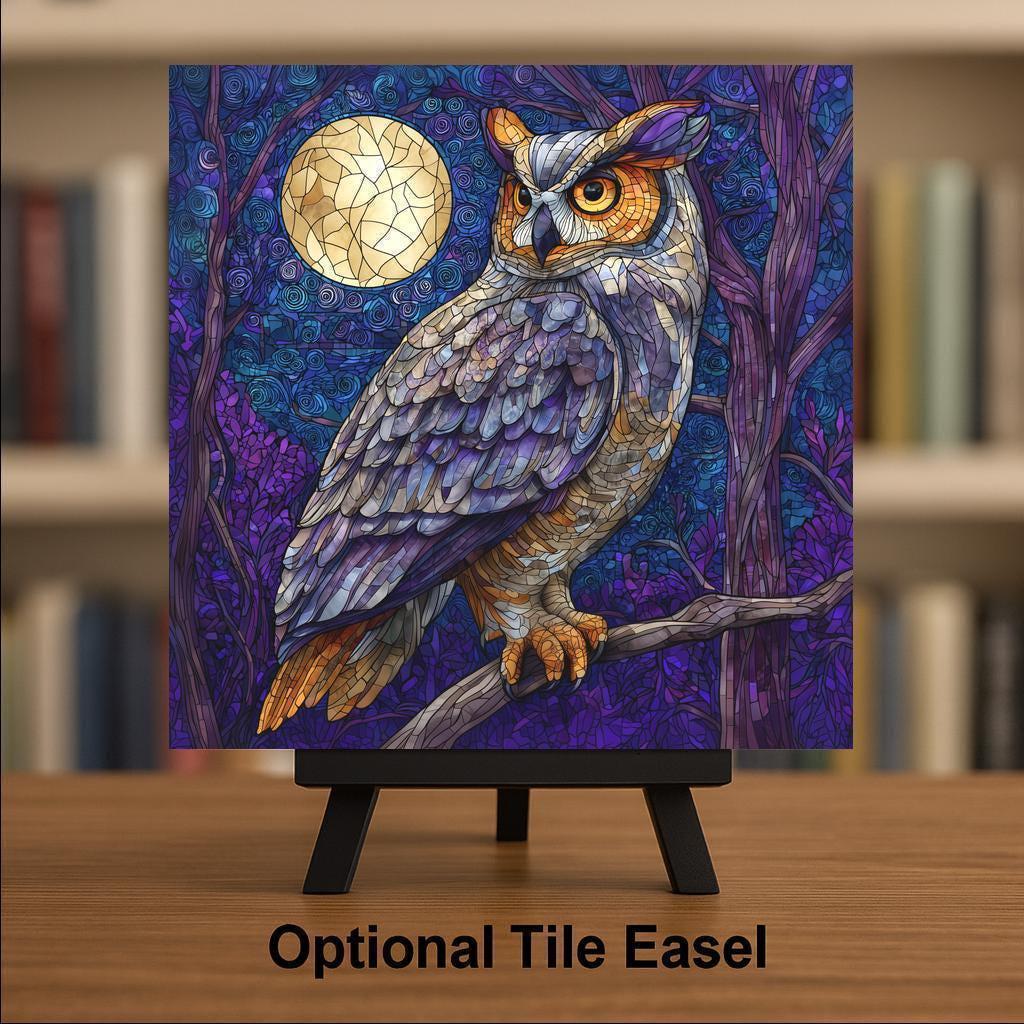 You can customize your display with optional accessories including a tile wall hanger for easy mounting, an easel tile stand for tabletop display, cork backing for added protection, or our premium frame option that elevates the artwork and suits both wall and table presentation. This tile makes an excellent gift for owl lovers, bird watchers, cabin décor fans, or anyone who enjoys moody, atmospheric artwork. Please note: the design is a printed image on ceramic tile, not actual stained glass.