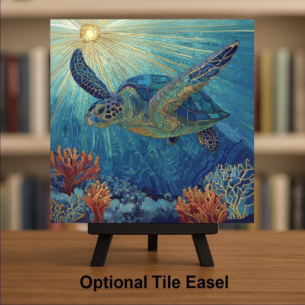 Choose optional accessories to suit your display preference, including a tile wall hanger for secure mounting, an easel tile stand for shelf or tabletop placement, cork backing, or our premium frame option for elevated presentation. This sea turtle tile also makes a memorable gift for divers, ocean conservation enthusiasts, and coastal décor fans. Please note: the design is printed artwork on a ceramic tile, not real stained glass.