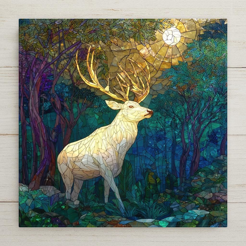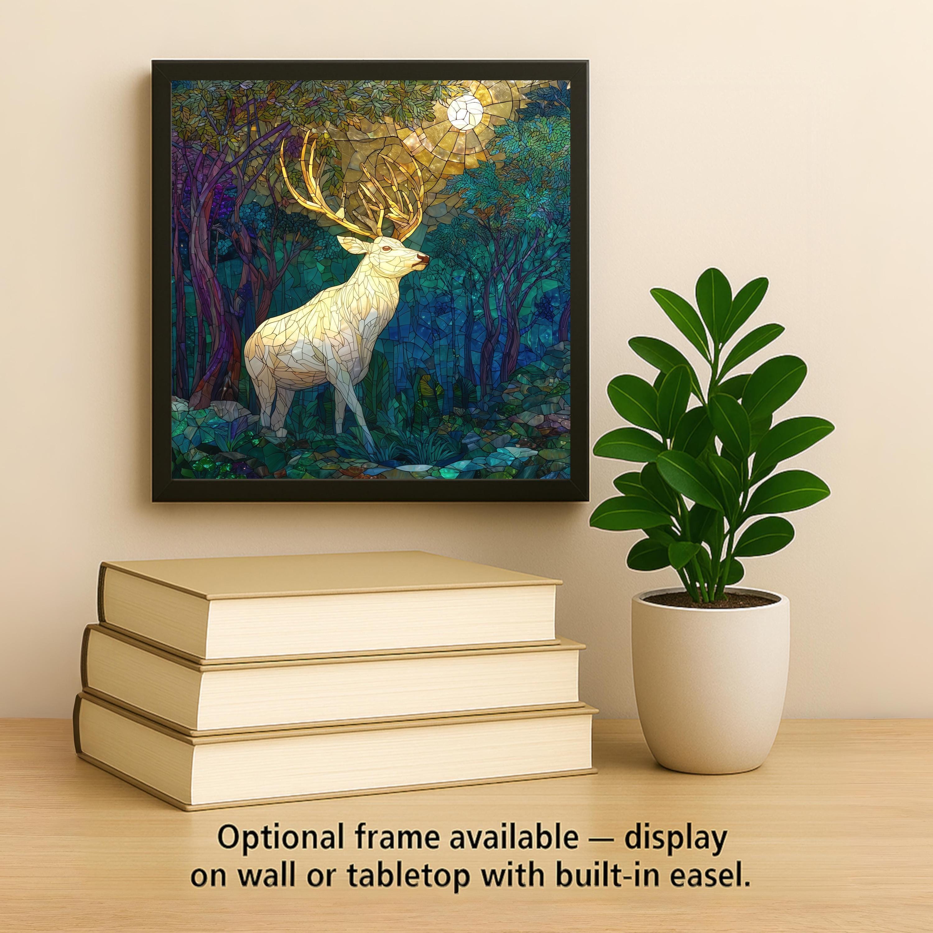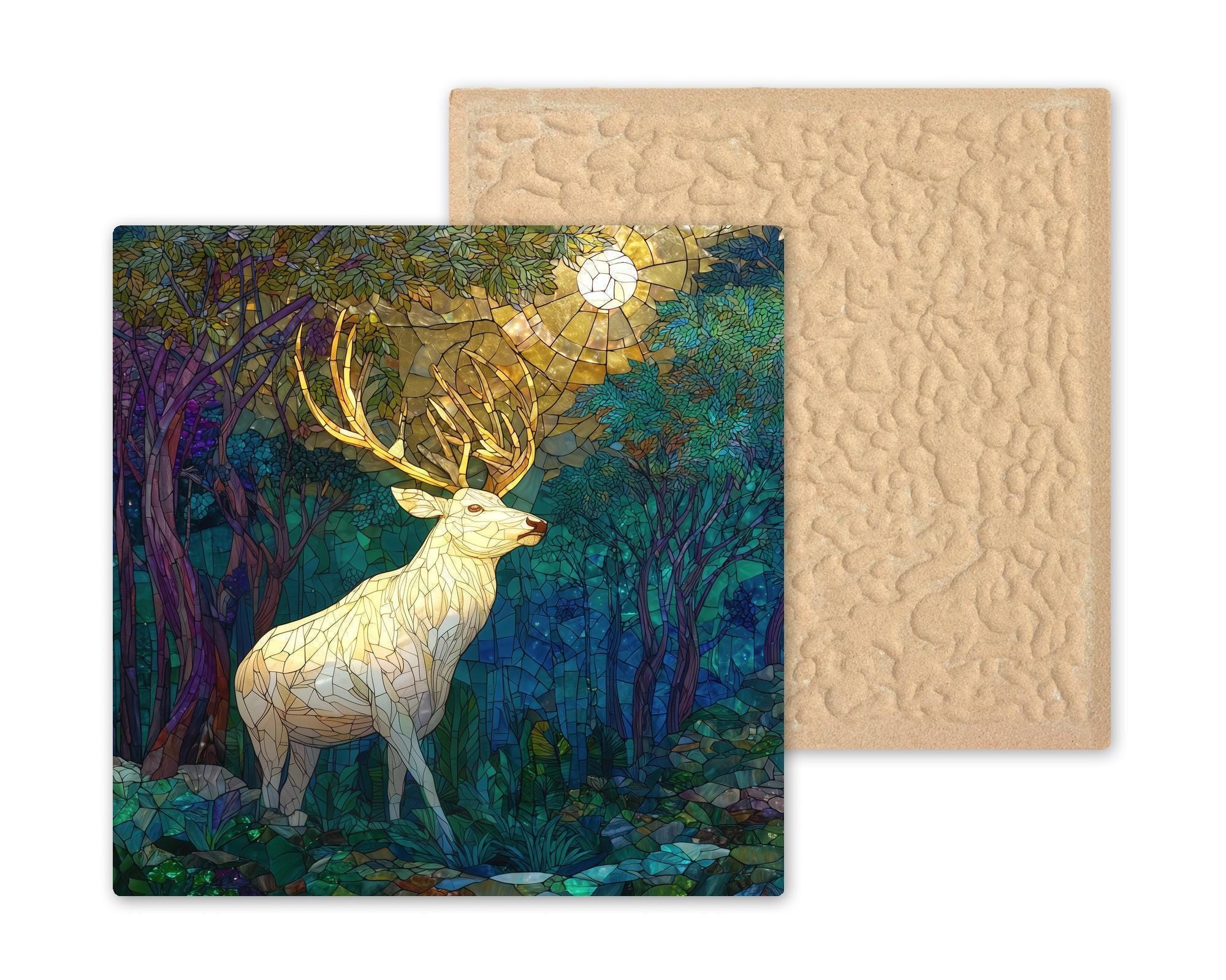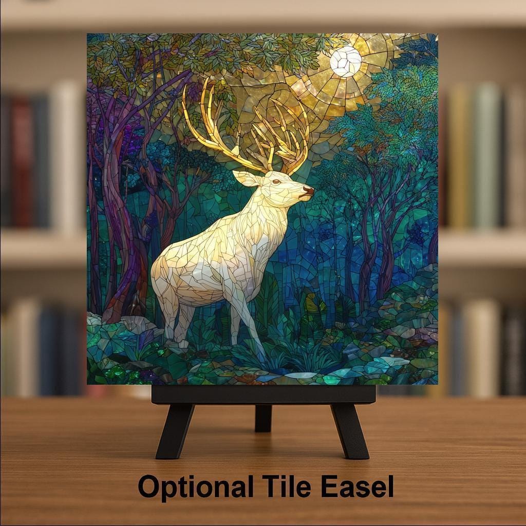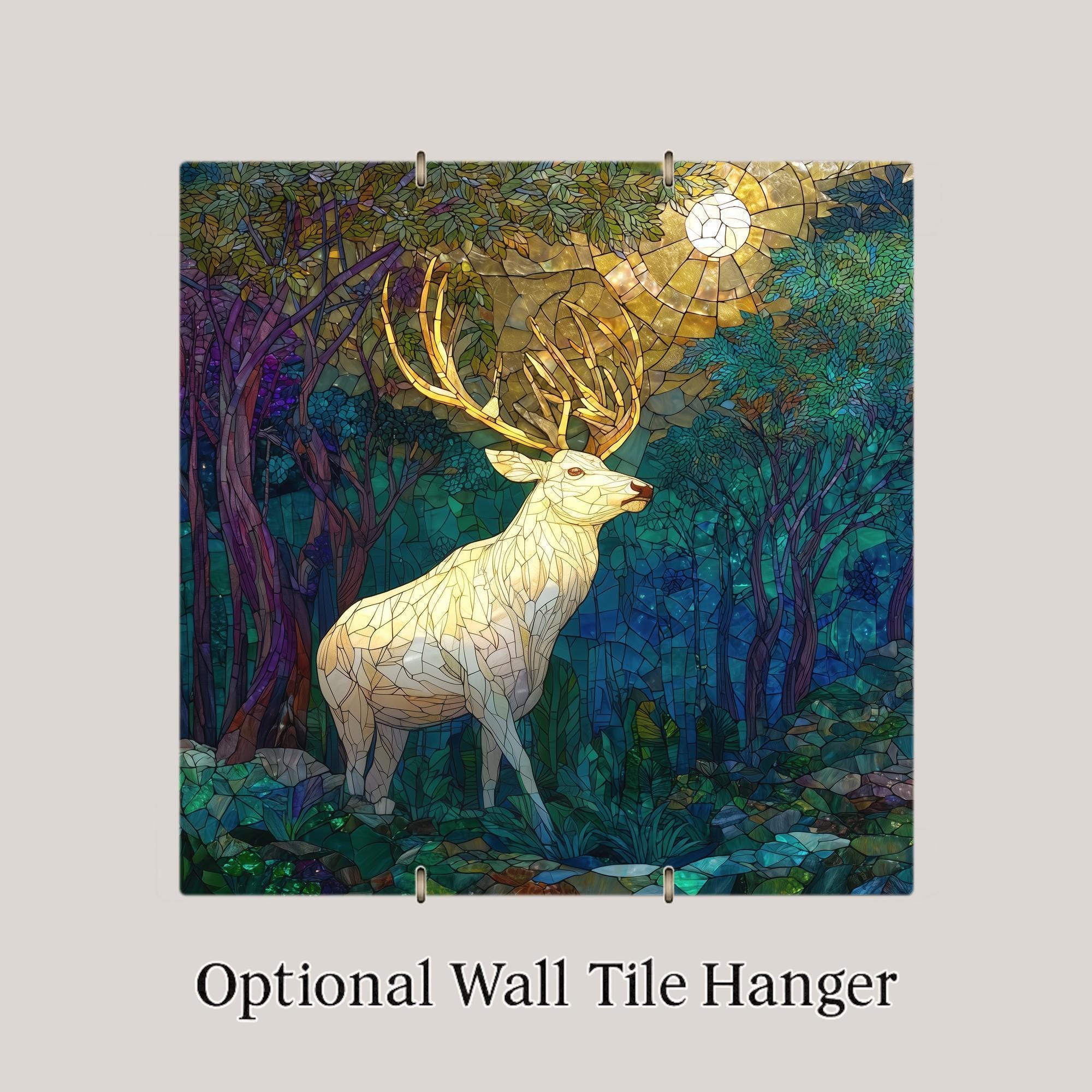 This white stag ceramic tile was designed for a buyer at the intersection of nature love and mythic imagination — the person who sees the forest as something more than trees, who keeps talismanic objects around them, who chooses art that carries meaning beyond decoration. The white stag is one of the most universally recognized symbols of magic, otherworldliness, and the pursuit of something sacred.The cobalt, teal, and warm gold luminous palette gives this tile a genuine otherworldly quality — it looks different in low light than in full light, which makes it exactly the kind of piece that rewards living with it.Although it has the look of stained glass, the artwork is permanently infused into the tile surface, creating a smooth finish with vivid color and ethereal forest detail.Optional display choices include a tile wall hanger, easel tile stand, cork backing, and a premium frame option for wall or tabletop use.