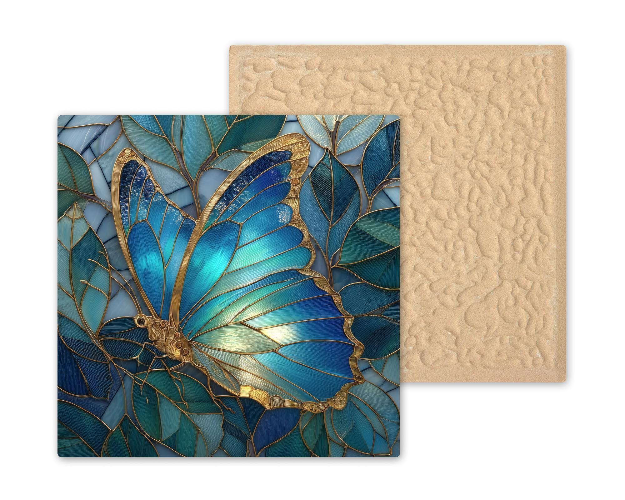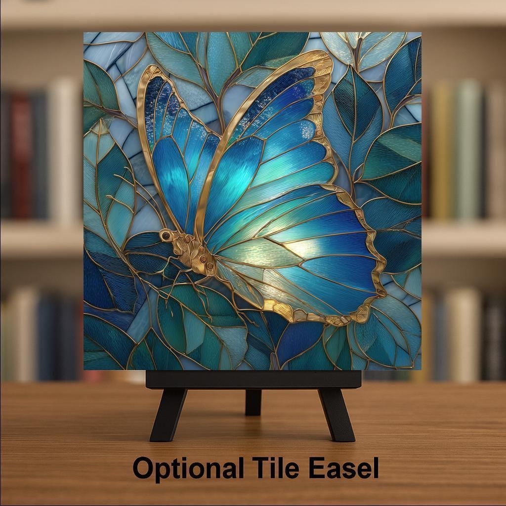 This stained glass–style blue butterfly ceramic tile brings a soft, peaceful feeling to any room. The glowing blue wings, gold detailing, and layered leaves create a design that feels bright, elegant, and calming. Although the artwork looks like real stained glass, it is a permanent printed design on a ceramic tile. The colors stay vibrant and the lines stay crisp, giving you wall decor or home decor that feels high quality and long lasting. The design works beautifully in living rooms, bedrooms, kitchens, offices, hallways, or any space that needs a touch of color and grace.