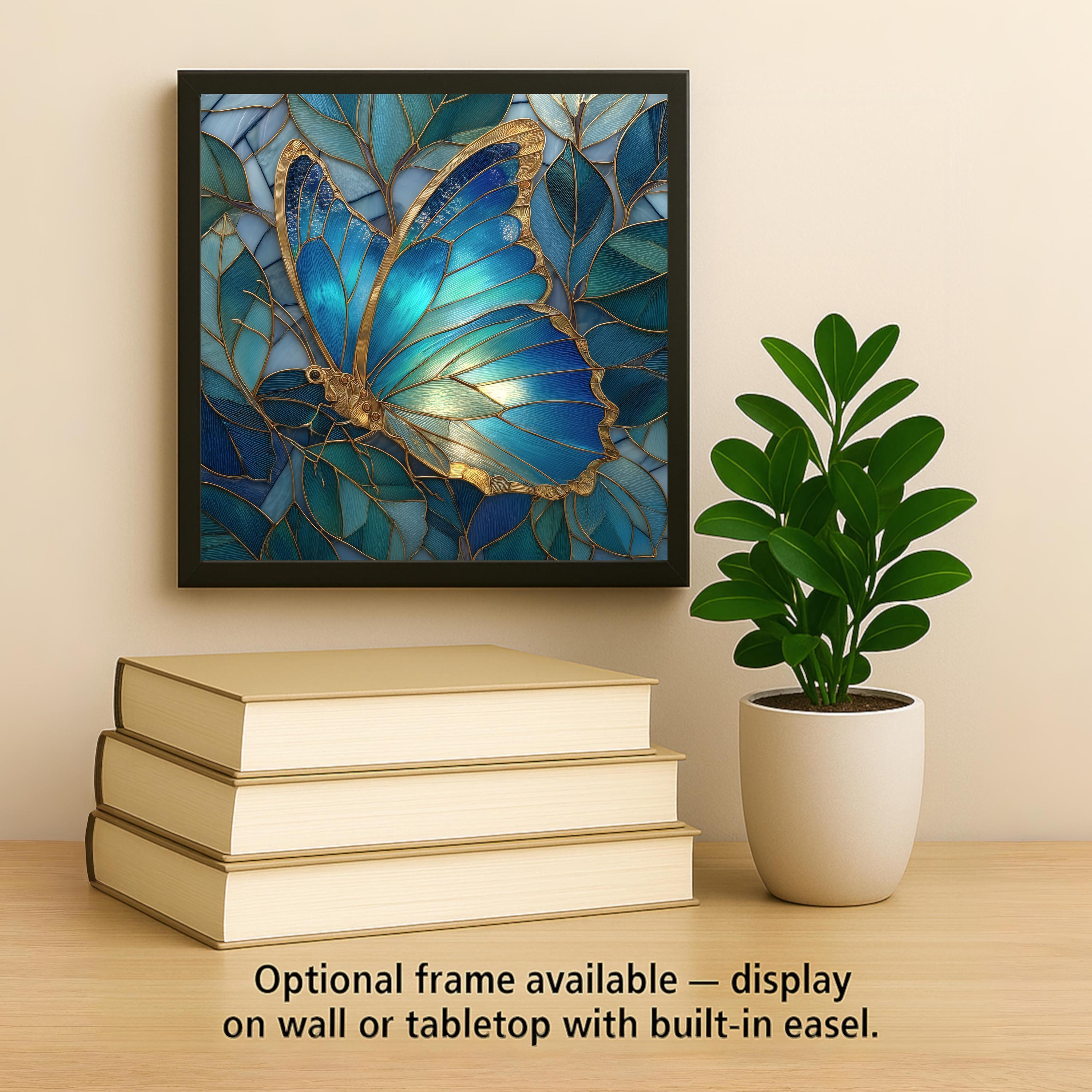 The cool blue tones make this tile easy to pair with coastal themes, botanical décor, or nature-inspired interiors. Customers often display this piece near windows, shelves, desks, or gallery walls where light brings out the shimmer of the wings. The tile can be displayed using optional add-ons such as a tile wall hanger, an easel tile stand, or protective cork backing. If you prefer a polished and framed finish, a premium frame option is available for both hanging and tabletop display.