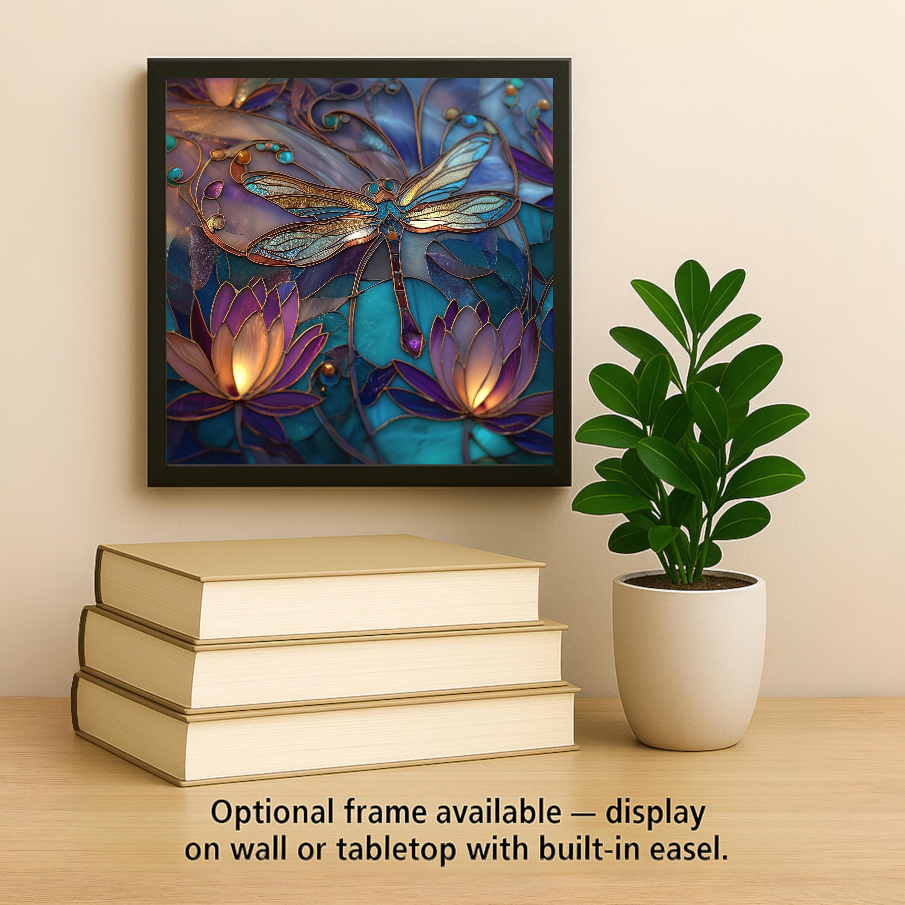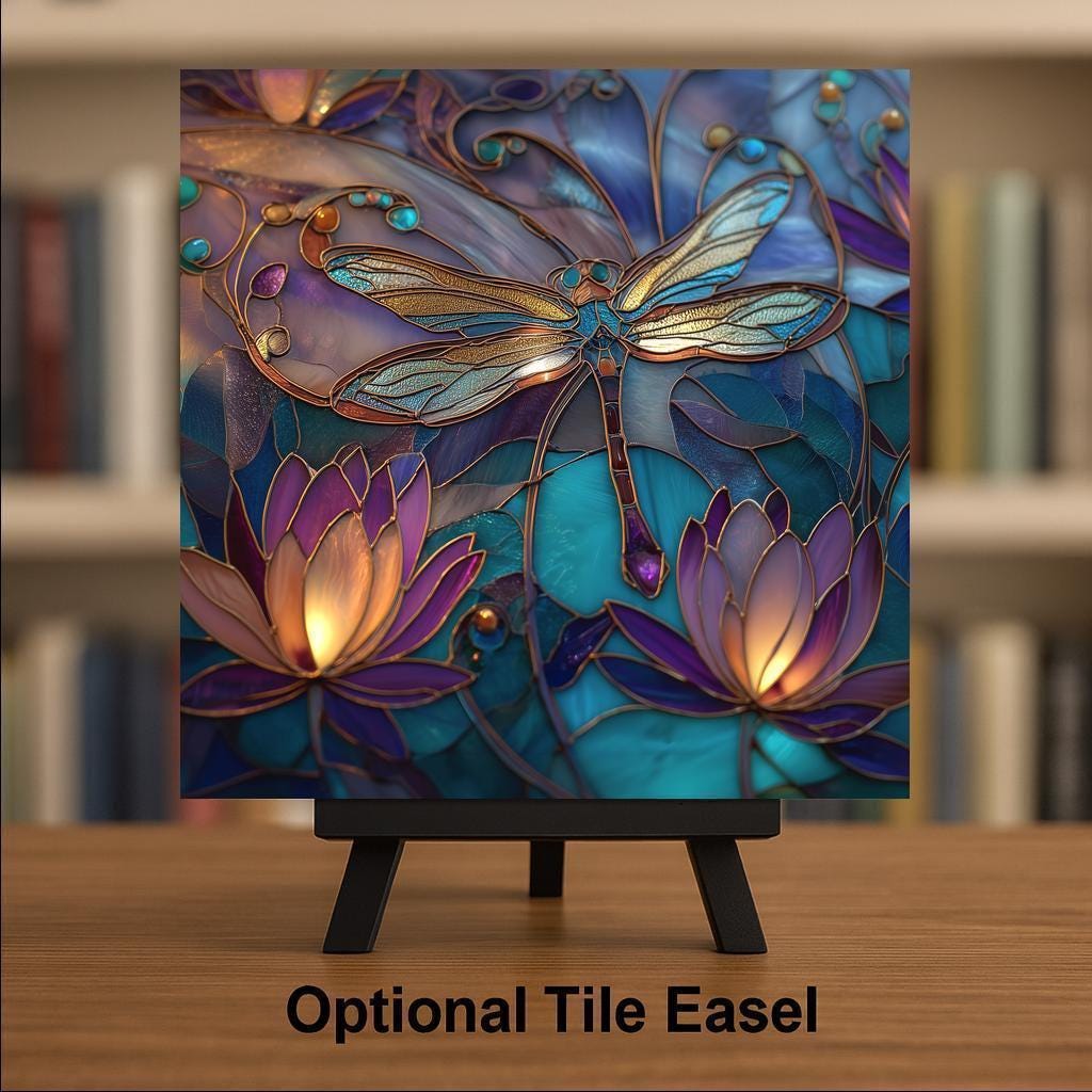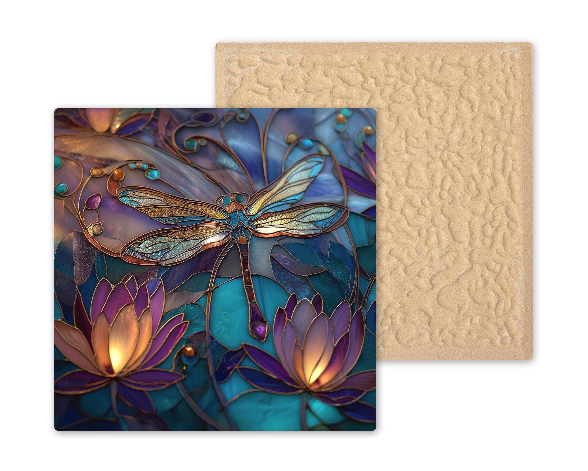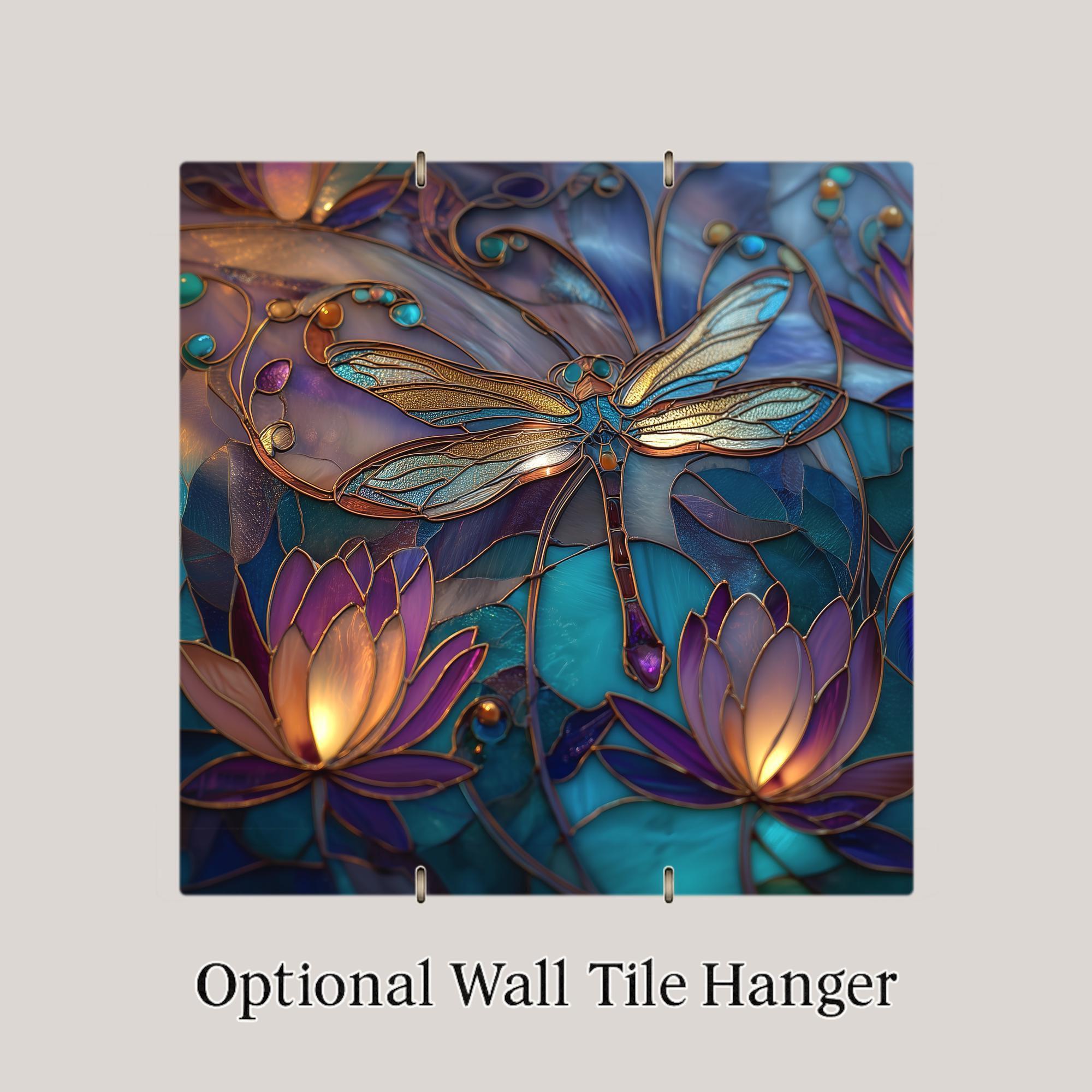 This stained glass–style dragonfly ceramic tile brings a peaceful and magical feeling to any space. The detailed wings, glowing lotus flowers, and swirling botanical patterns create a design that feels alive with movement and color. Although it looks like real stained glass, the artwork is a permanent print on ceramic, giving you rich color and crisp detail without the fragility of glass. It makes beautiful wall decor or home decor for living rooms, bedrooms, offices, meditation spaces, and nature-themed rooms.