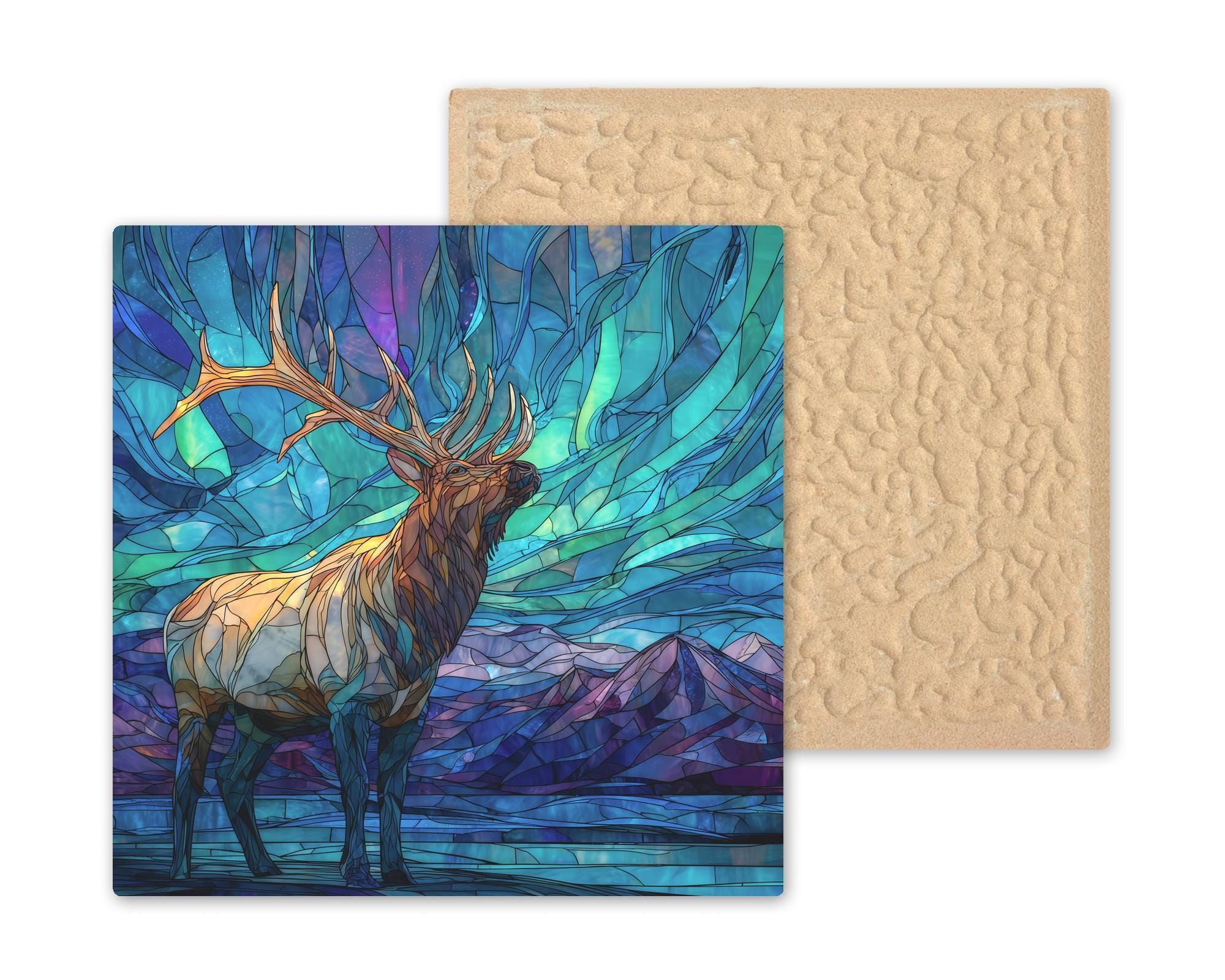 This stained glass–style elk ceramic tile brings the peaceful spirit of the wilderness into your home. The design features a majestic elk standing beneath swirling aurora colors that glow with greens, blues, and purples. Although it resembles stained glass, this is a permanent design printed on ceramic, ensuring crisp detail and long-lasting color. It works beautifully as wall decor or home decor in living rooms, cabins, offices, or nature-inspired spaces.