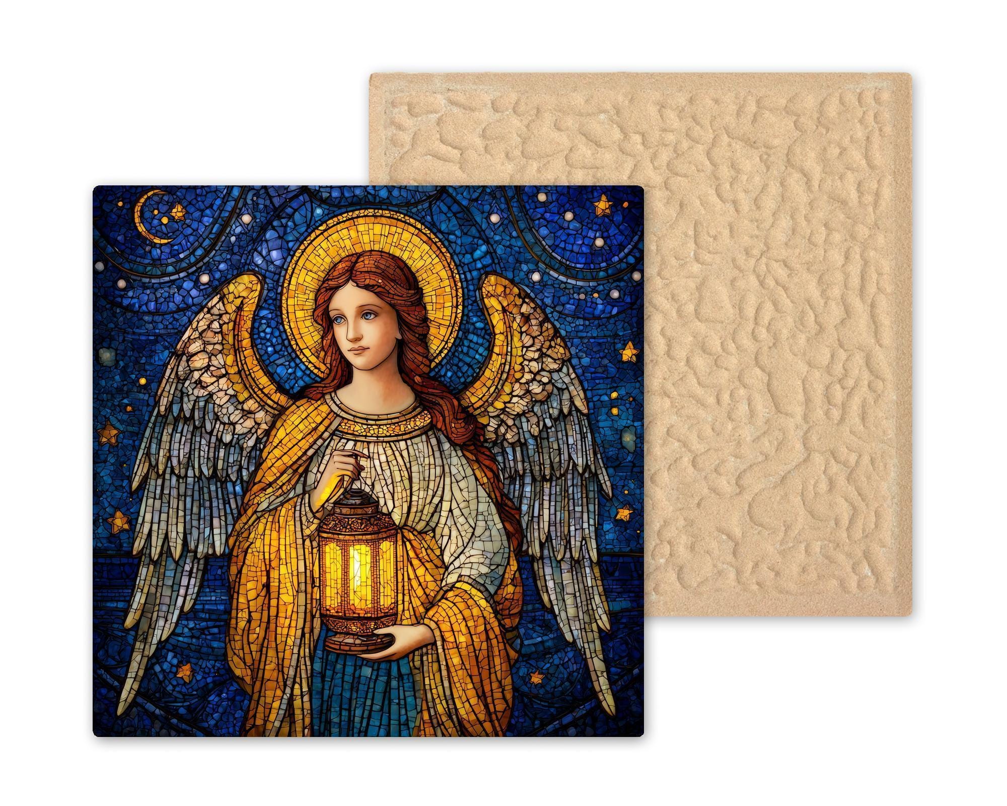 This stained glass–style angel tile brings a warm, peaceful glow into any home, crafted as a permanent print on ceramic tile. The artwork shows a radiant guardian angel holding a lantern filled with soft golden light, surrounded by a deep blue night sky, shimmering stars, and beautifully detailed mosaic wings. The design creates the look of glass and light without being actual stained glass, making it a durable art piece that works beautifully as wall art or standing home decor. Customers love this celestial style because it adds comfort, meaning, and a sense of protection to bedrooms, entryways, memorial spaces, and gift displays.