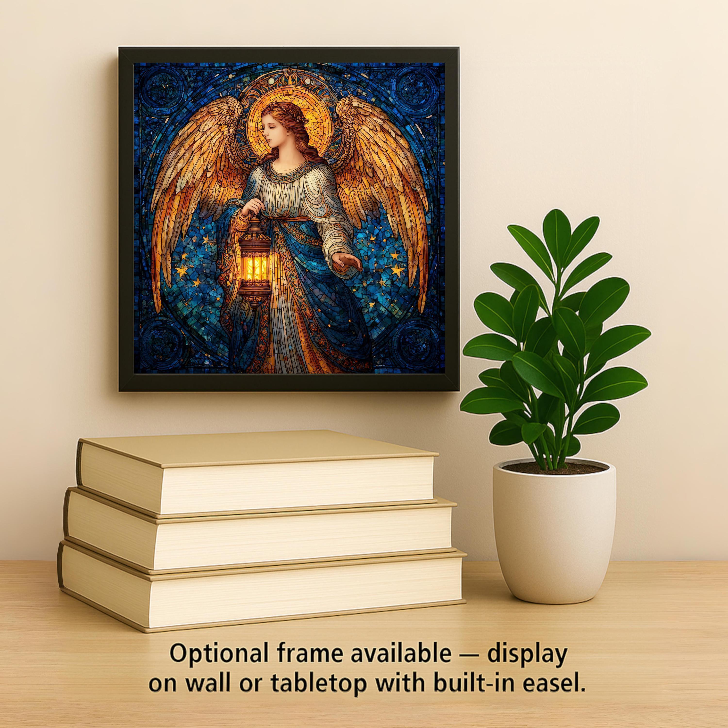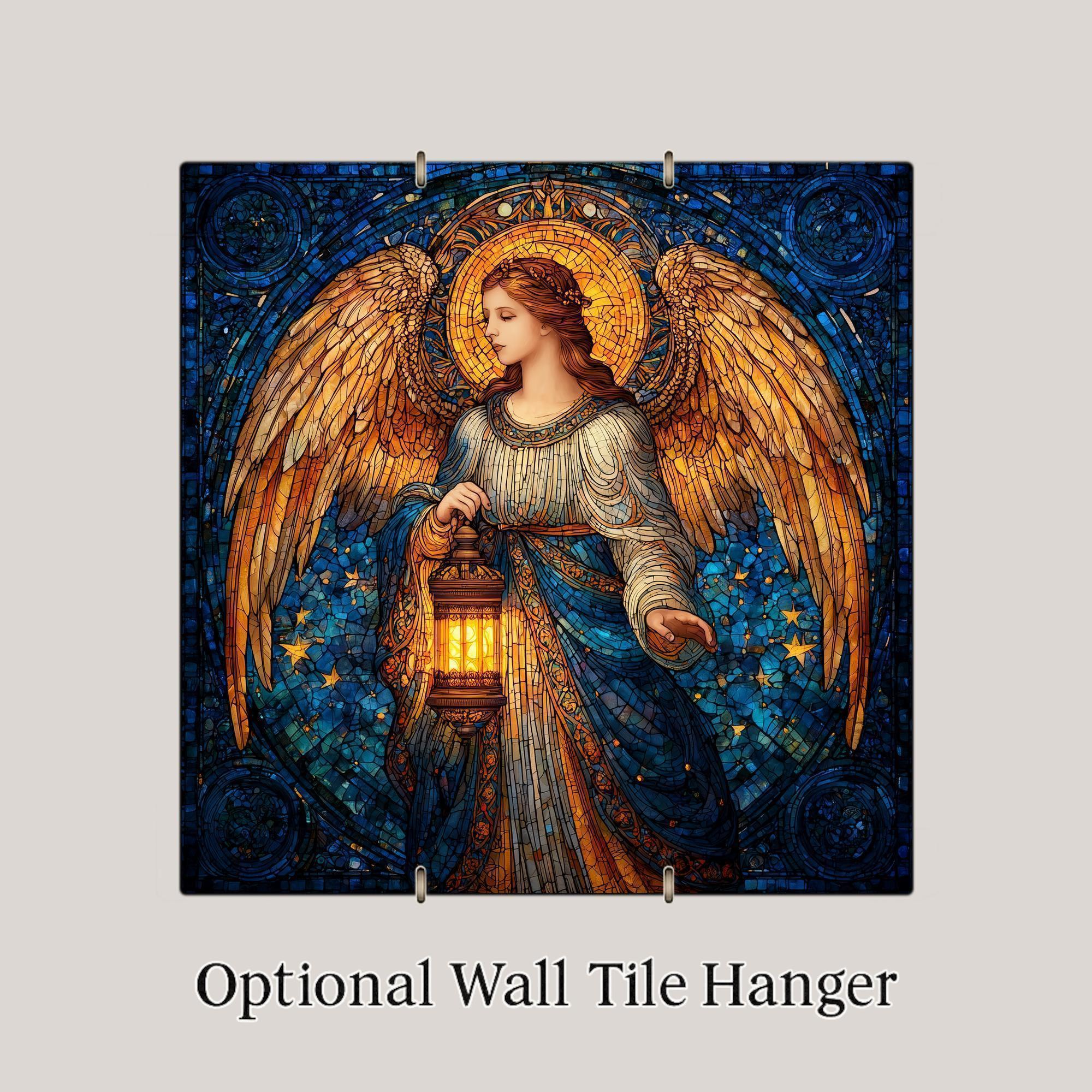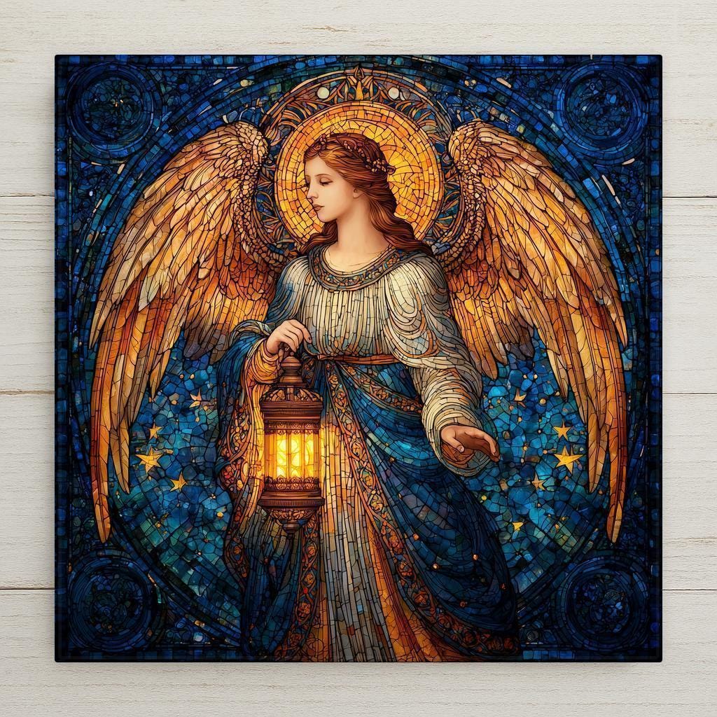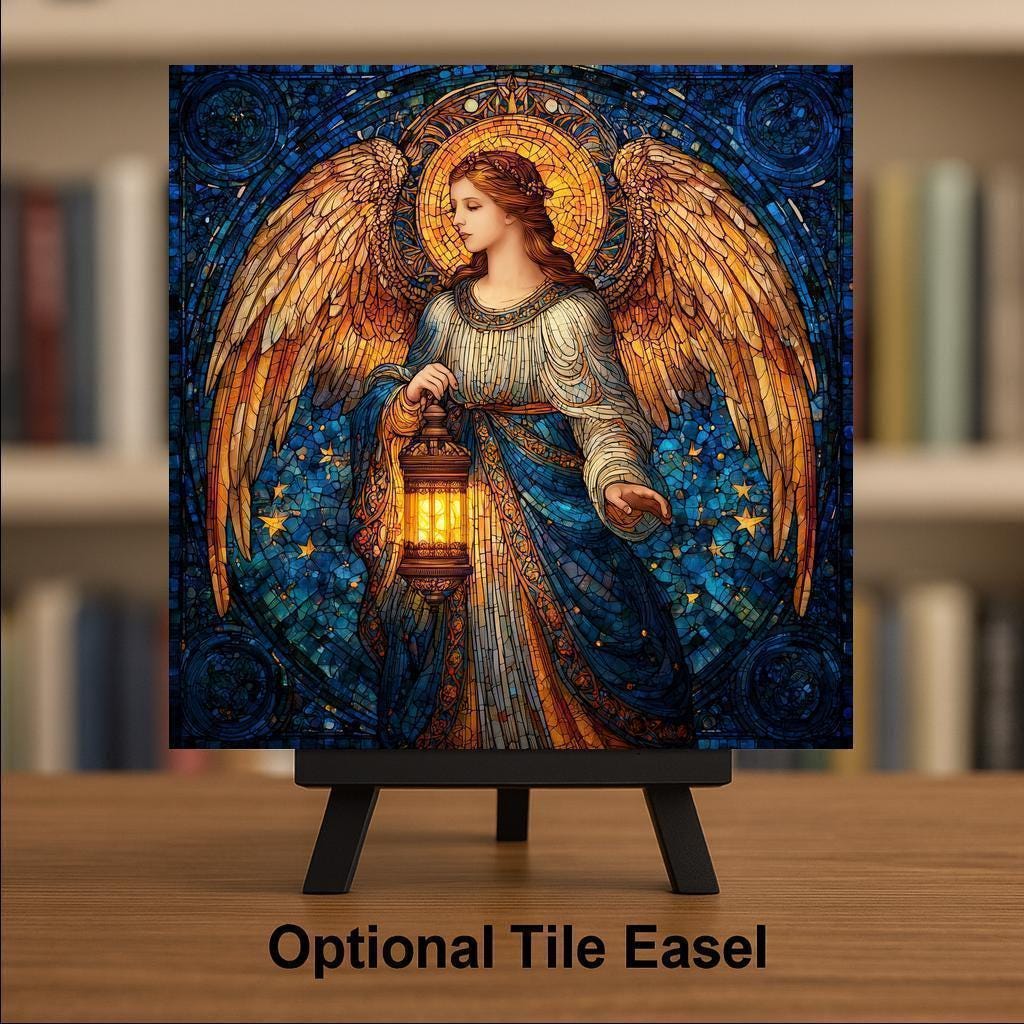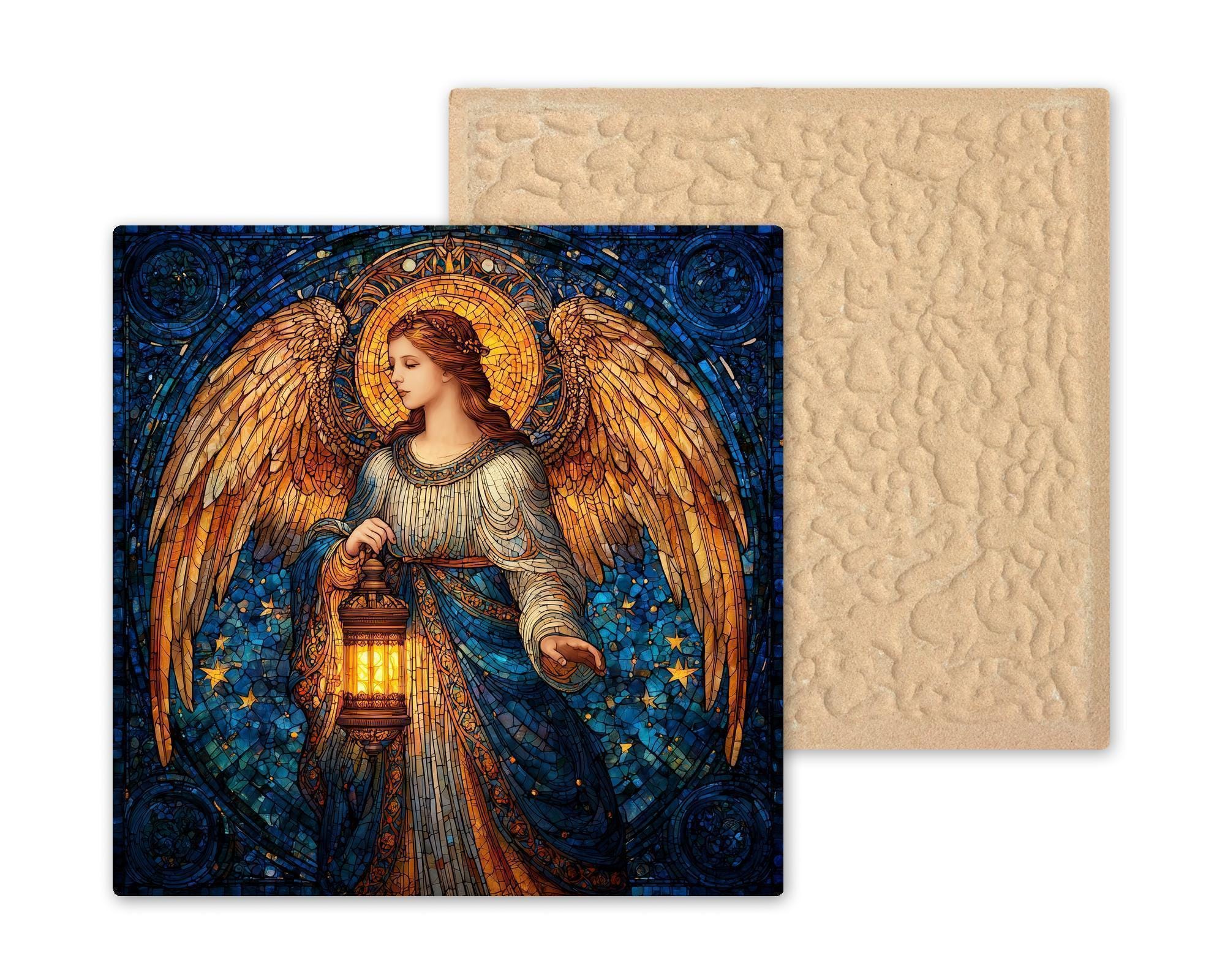 Although the artwork looks like stained glass, this tile is a solid ceramic print. The mosaic effect is created through high-resolution art that captures light and detail. This makes the piece bright and eye-catching while still durable enough for everyday décor. The glowing lantern and gentle expression of the angel make the tile feel peaceful and hopeful.