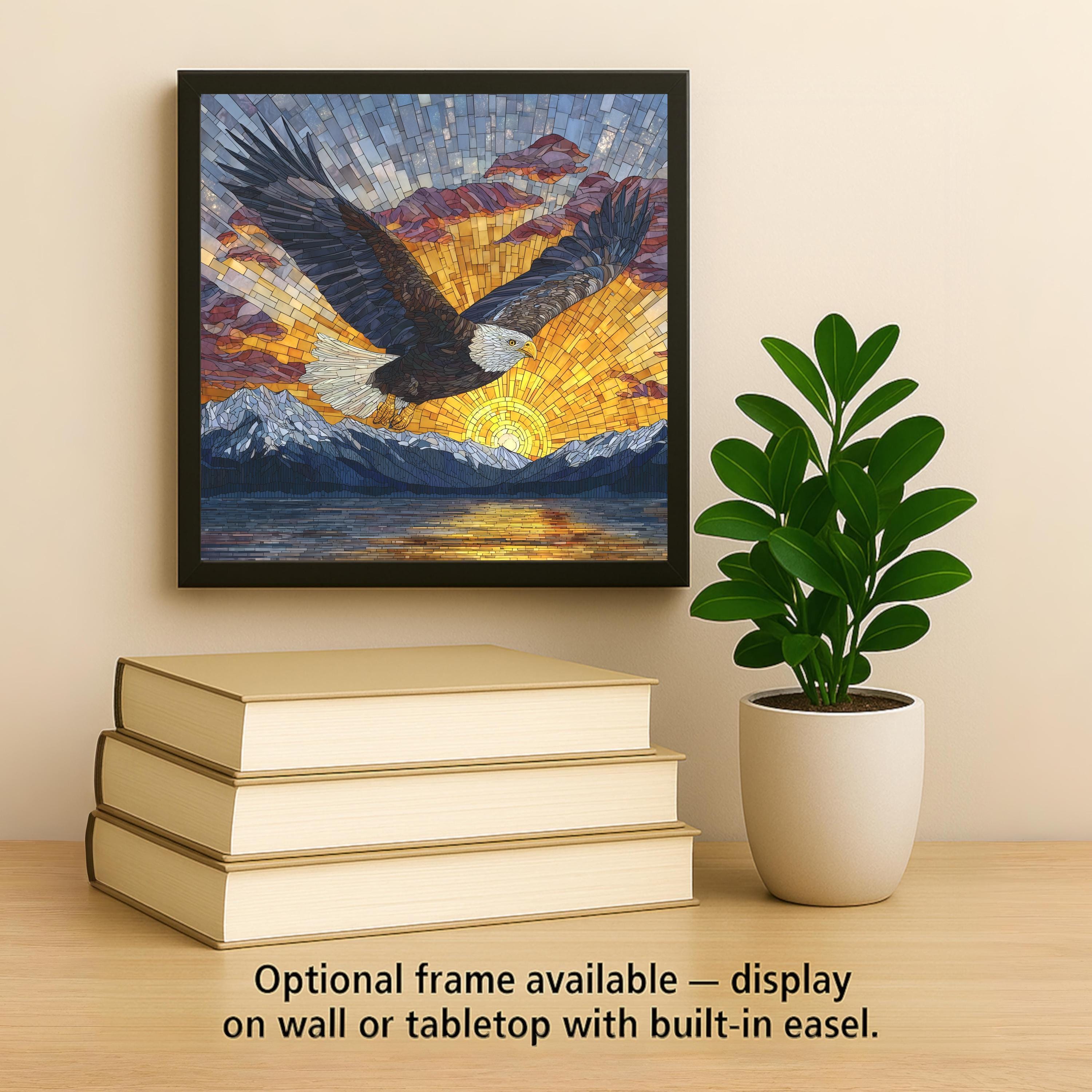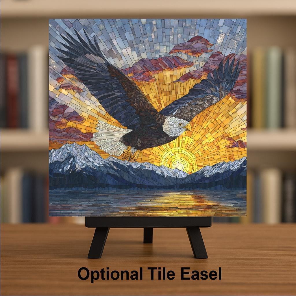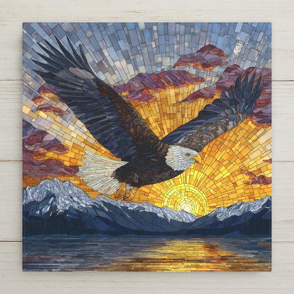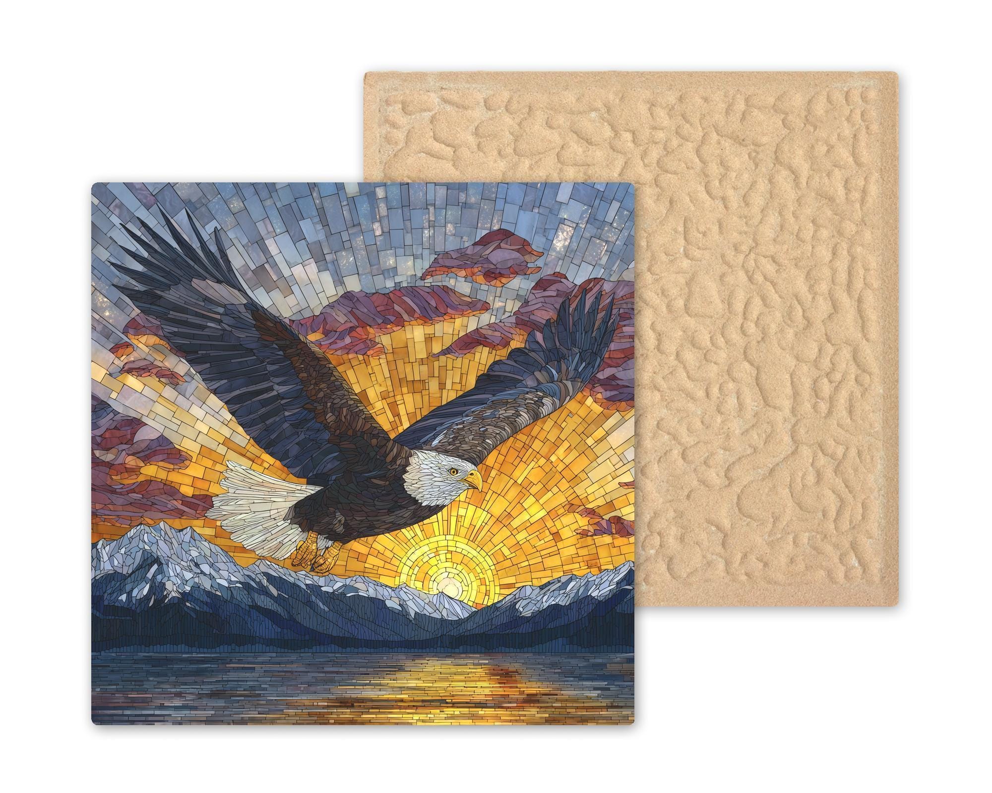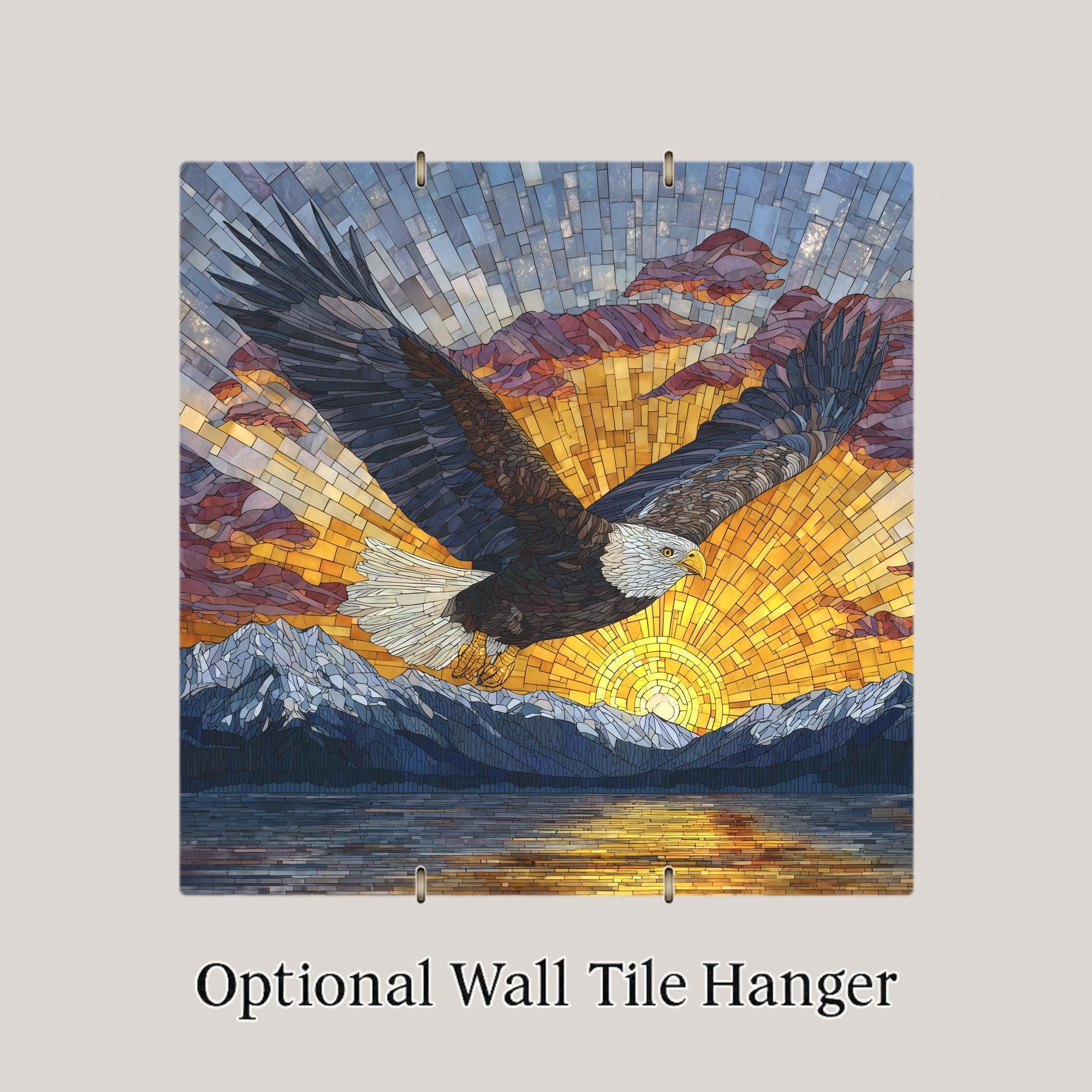 This bold bald eagle ceramic tile brings the strength and beauty of the wild into your home. The stained-glass style artwork shows the eagle soaring across a glowing sunset sky, with golden light shining over snow-covered mountains and calm reflective water below. The warm colors and detailed lines give it a vibrant, uplifting look that fits beautifully into any room.