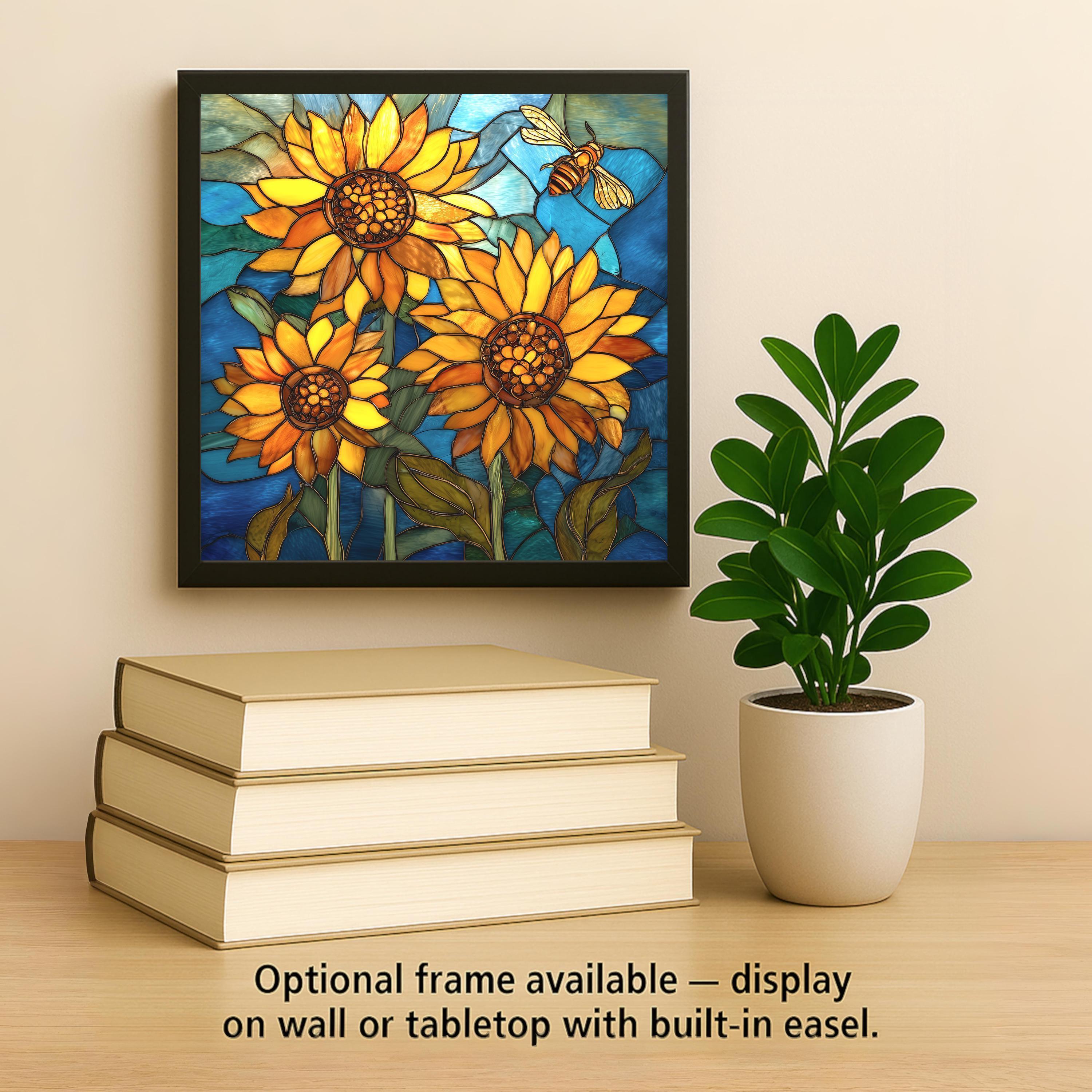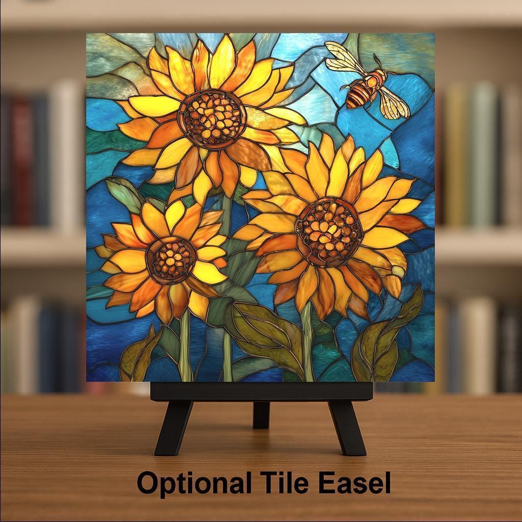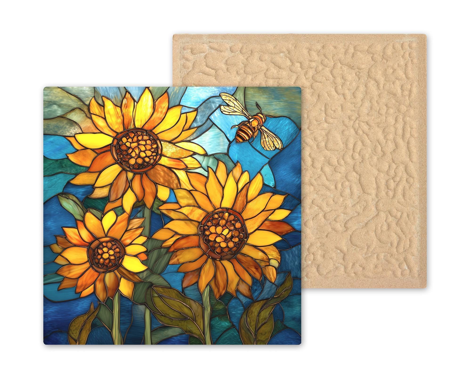 Bring a burst of sunshine into your home with this sunflower ceramic tile wall art. This design features three glowing stained-glass style sunflowers and a honeybee in rich golds, blues, and greens. Each petal and leaf is detailed to look like real stained glass, giving the tile a warm, radiant glow. It’s a bold statement piece for anyone who loves bright floral decor, nature artwork, or cheerful kitchen accents.