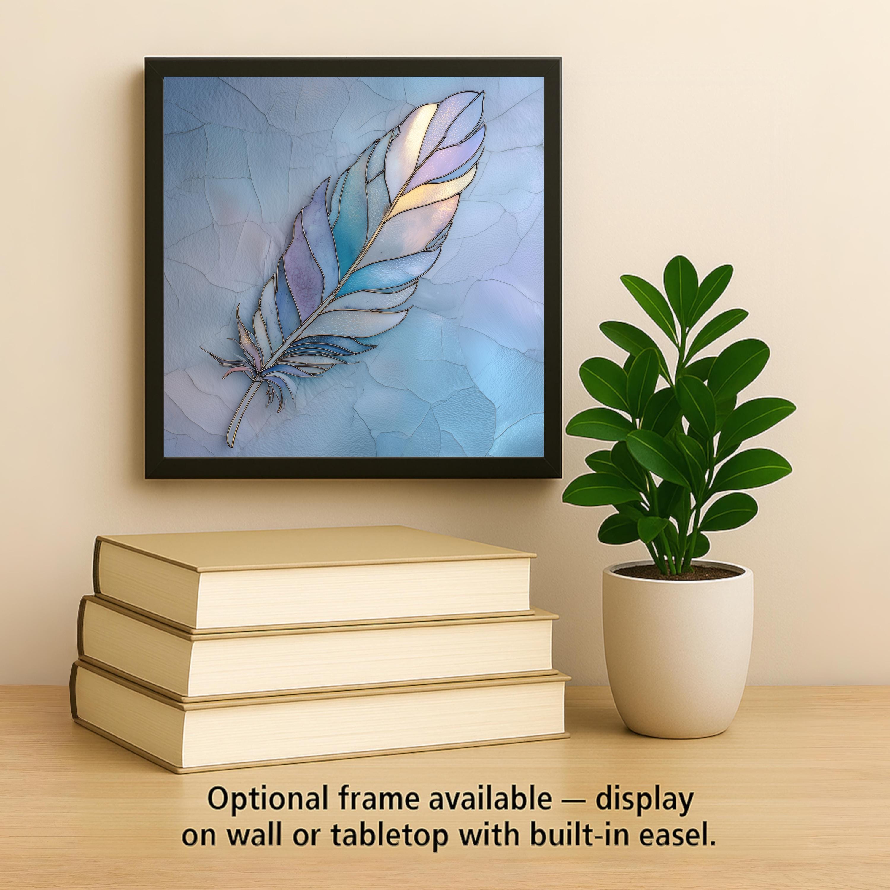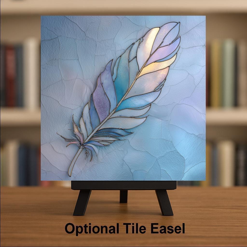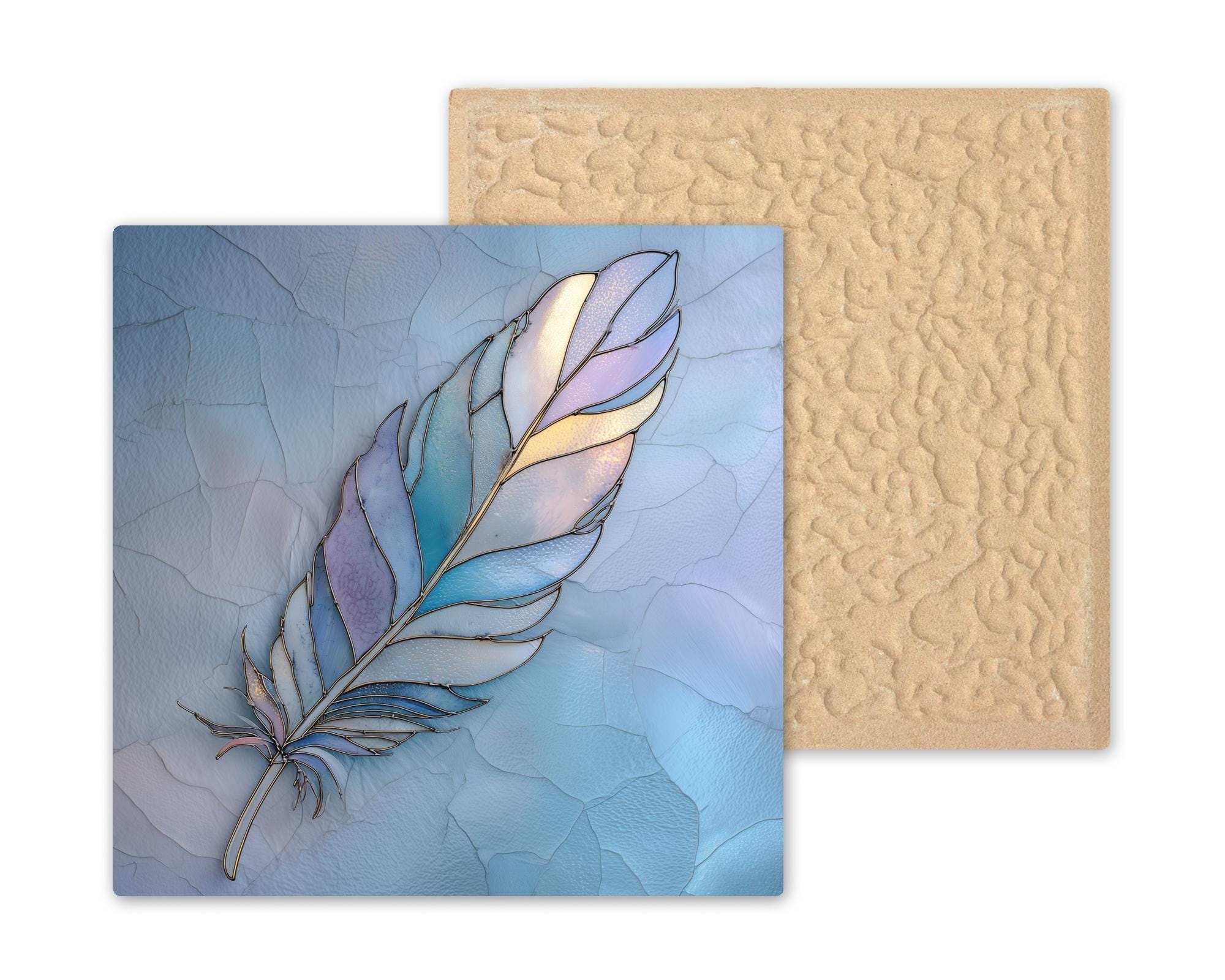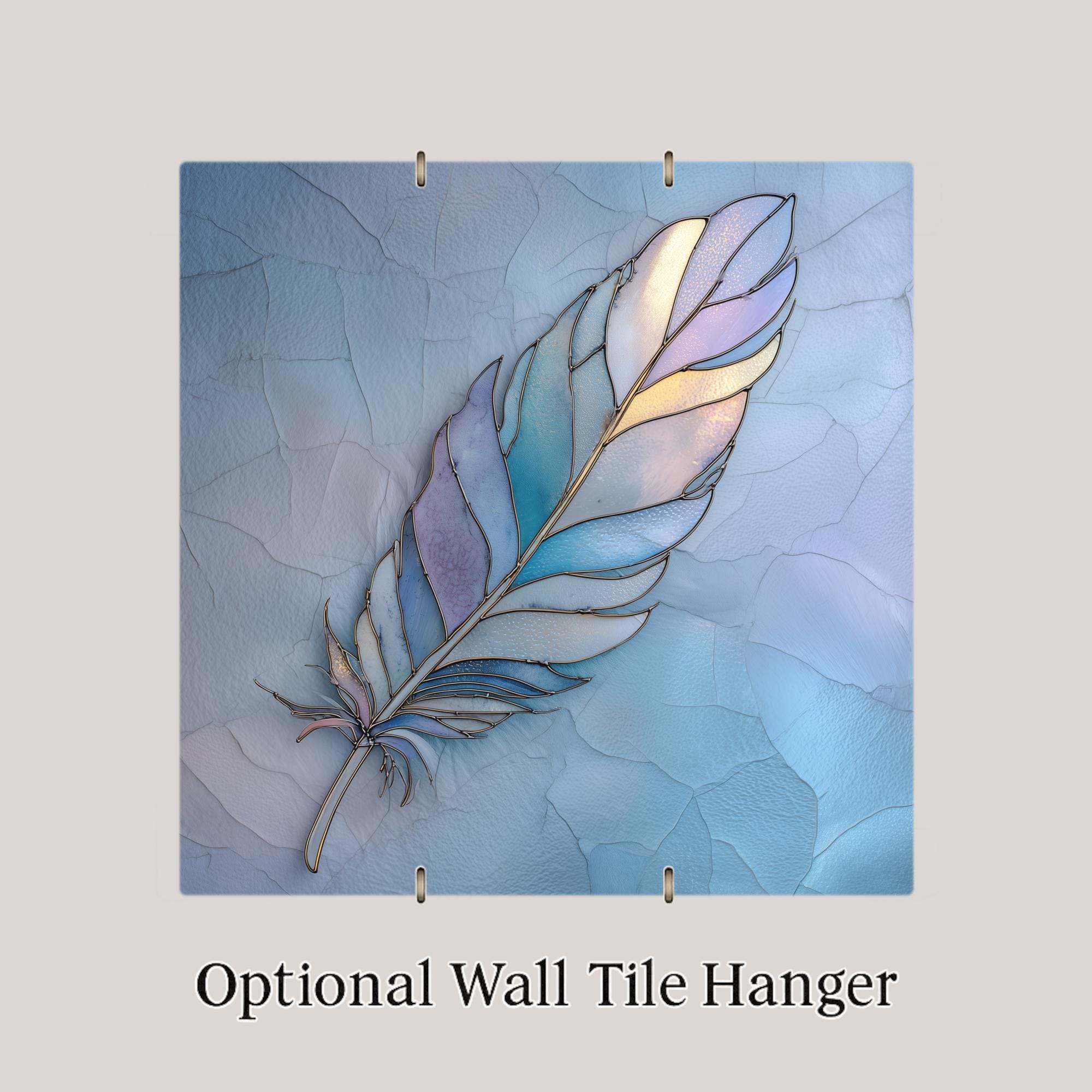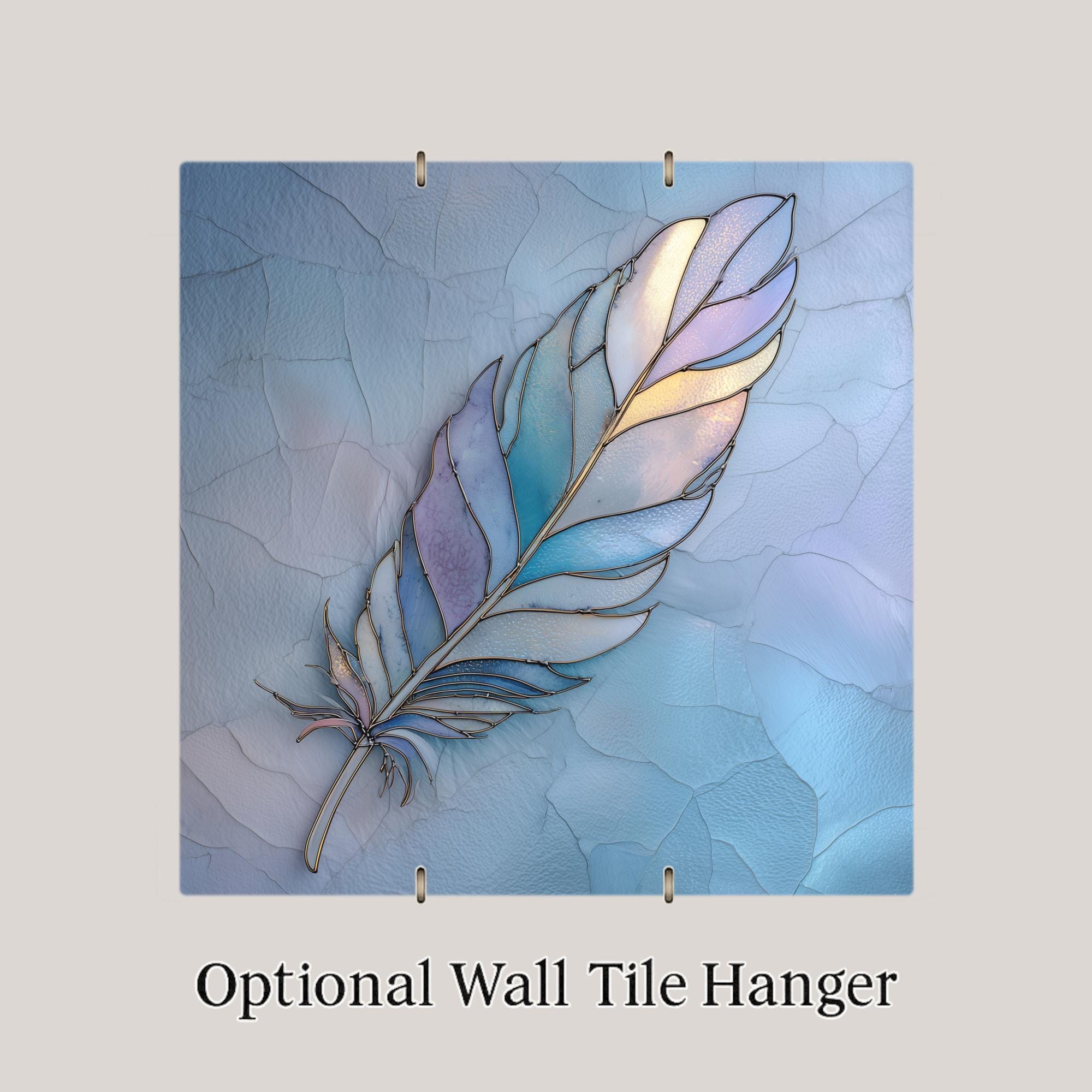 This symbolic feather ceramic tile wall art represents freedom, lightness of spirit, guidance, and quiet inner strength. Feathers are widely searched on Etsy as meaningful symbols associated with protection, spiritual connection, and the idea of being gently supported through life’s transitions. This design captures that sentiment through soft flowing lines, calm blue tones, and a stained glass–inspired aesthetic that feels both peaceful and uplifting.