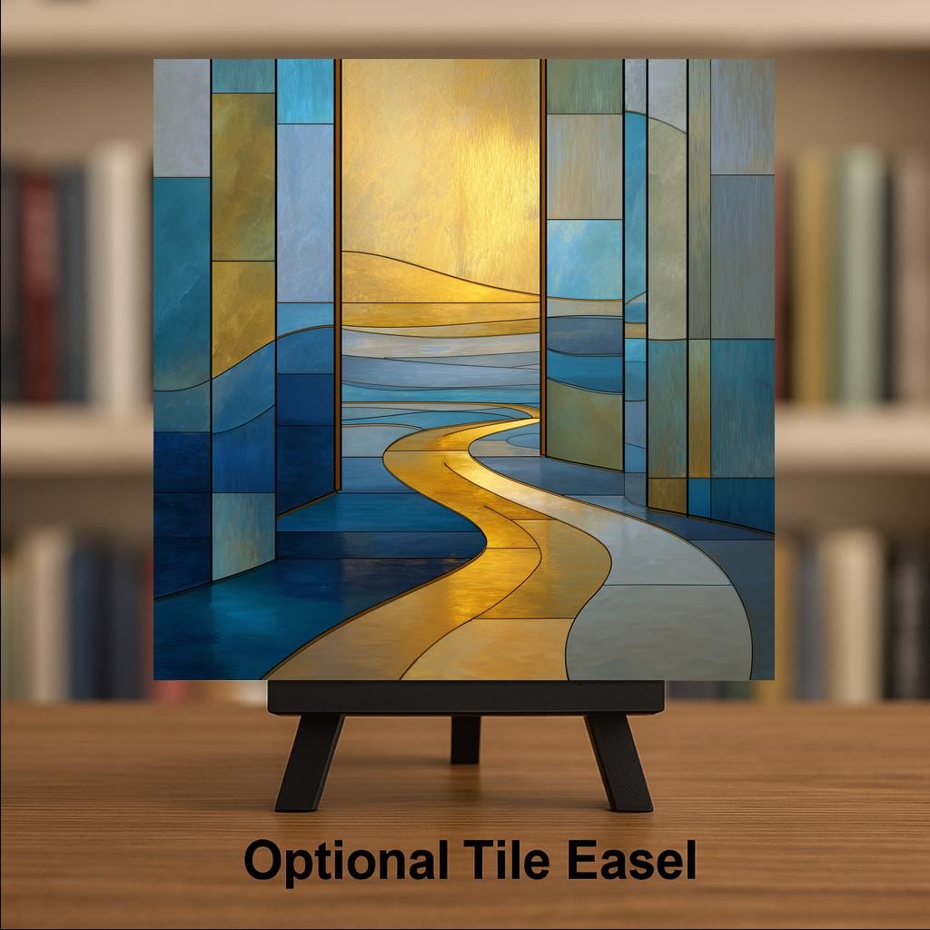 The structured vertical panels suggest boundaries and choices, while the open horizon evokes possibility and renewal. The balance of cool blues with warm gold tones creates a sense of calm confidence, making this piece especially meaningful for moments of transition, new beginnings, or reflection.