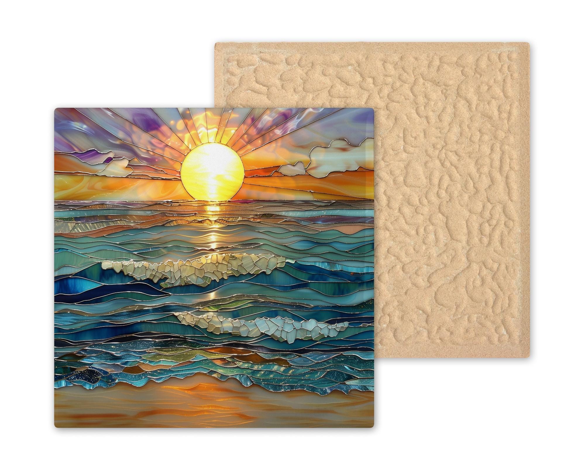 This ceramic tile features stylized ocean waves under a radiant golden sunset. Aqua blues, sparkling whites, and molten gold glass-effect textures create the illusion of stained glass, capturing the sun’s final burst of light over the sea.