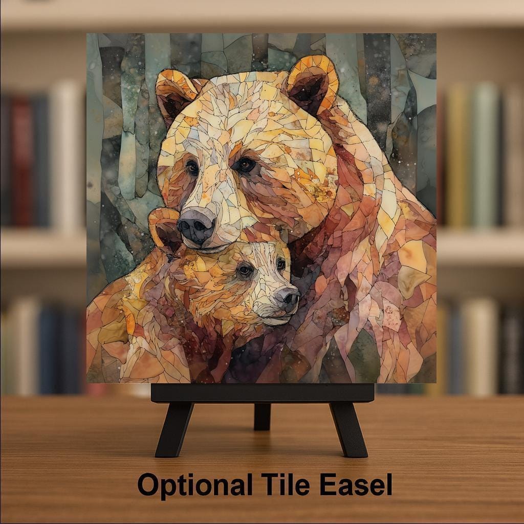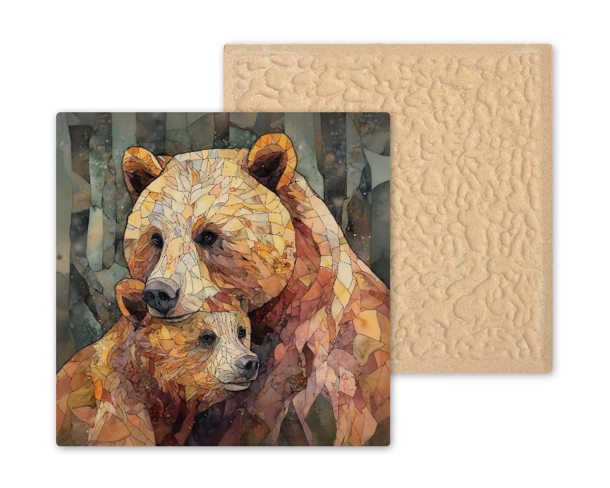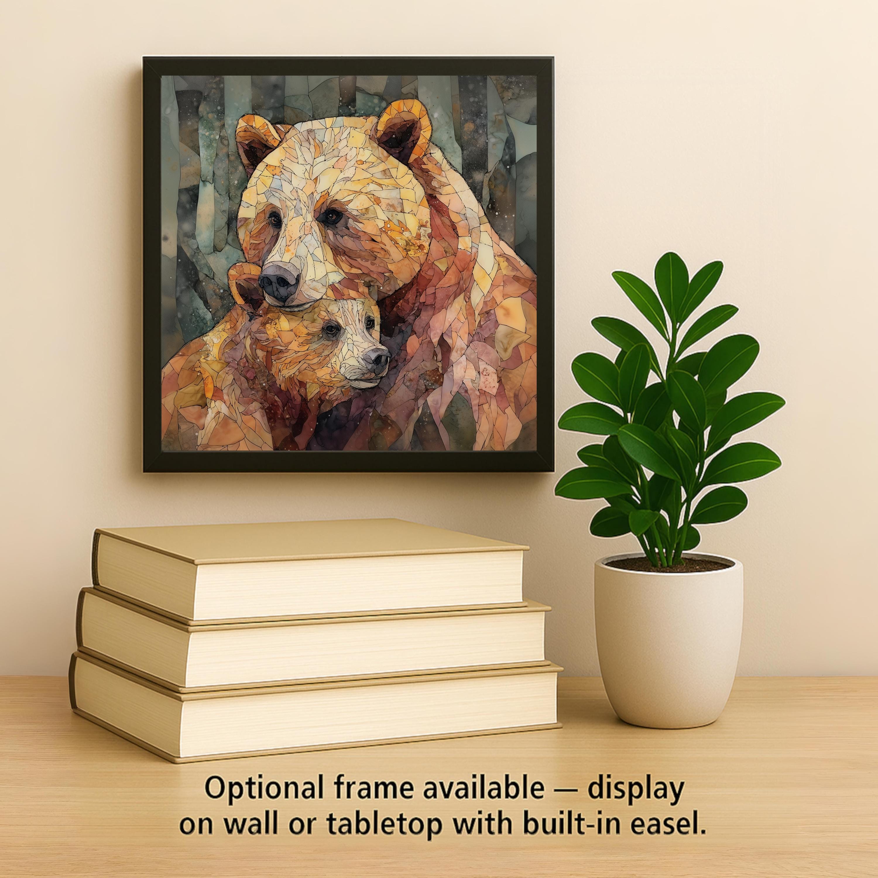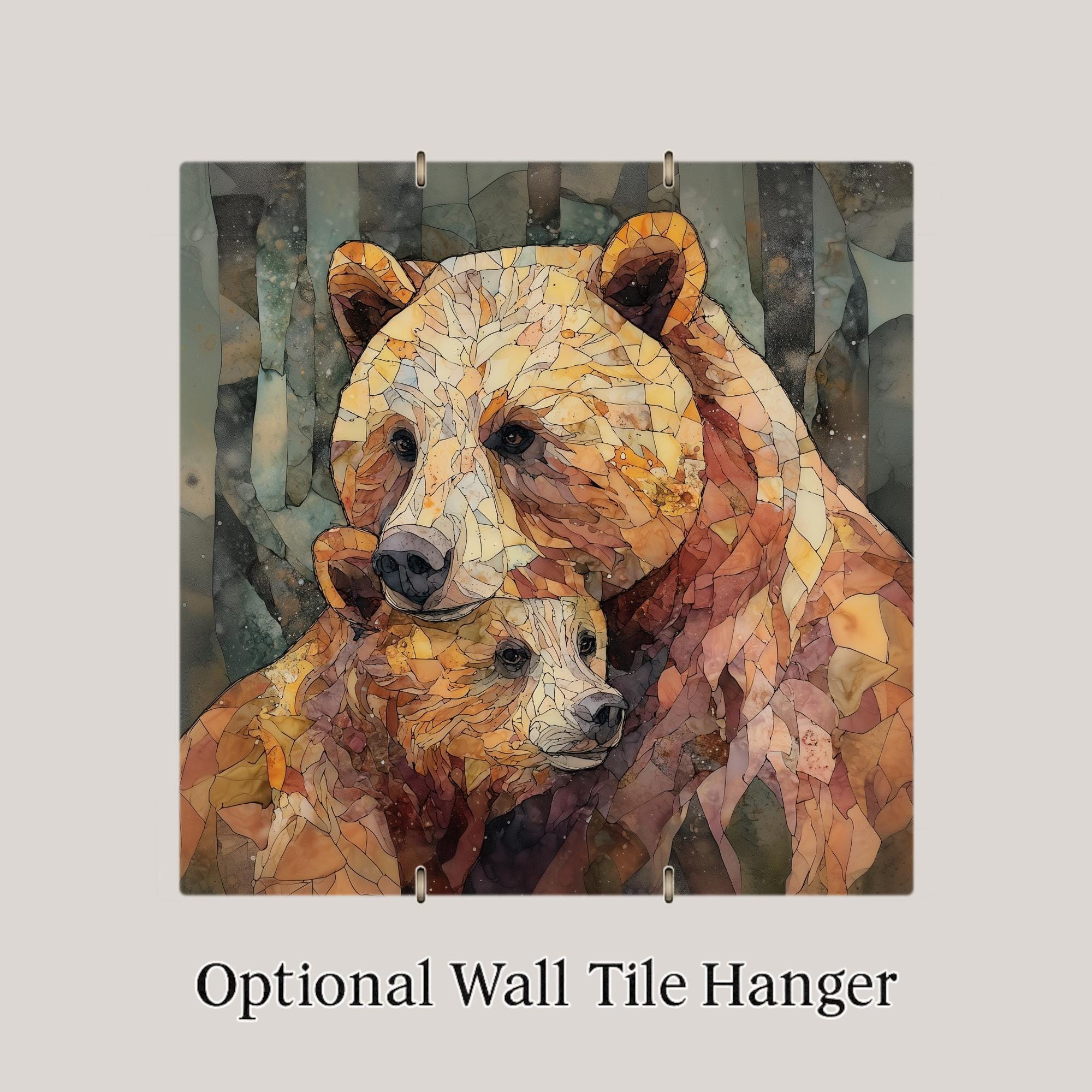 Capture the quiet strength of the wild with this Bear and Cub Wall Art Tile, designed in a rich mosaic-inspired style. A mother bear cradles her cub in a warm forest setting, surrounded by golden earth tones and stained glass-style textures. The artwork feels emotional, rustic, and full of warmth—perfect for woodland nursery themes, cabin walls, or cozy home decor.