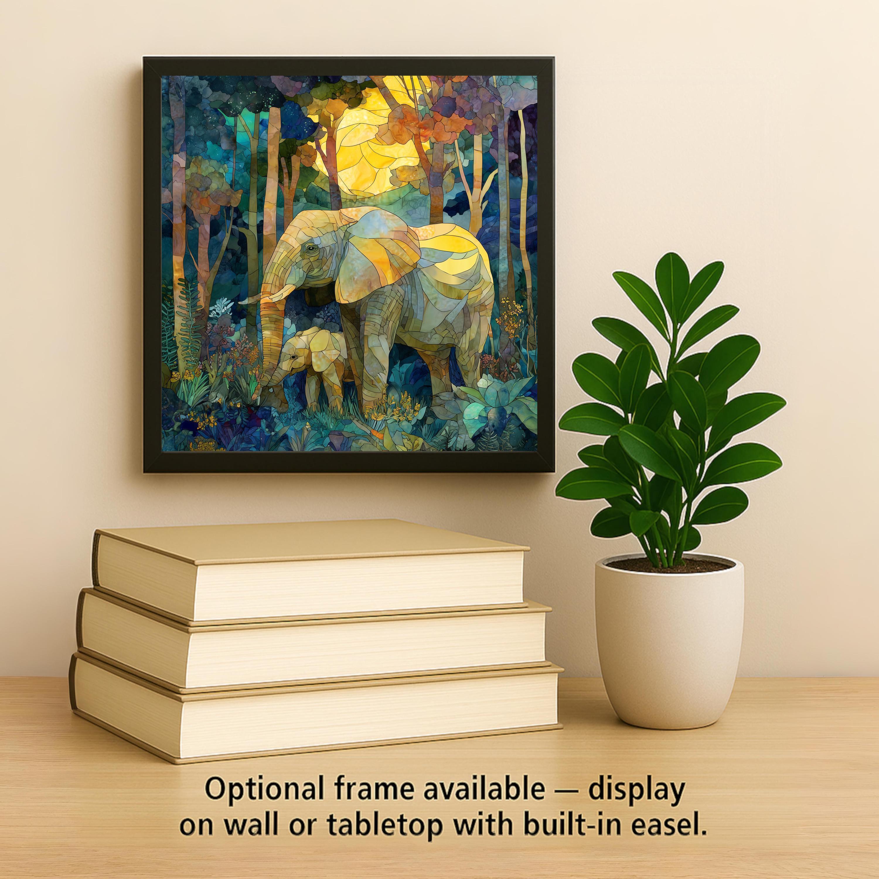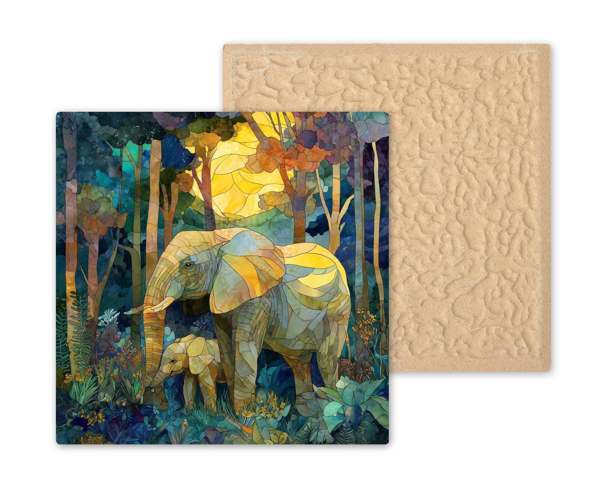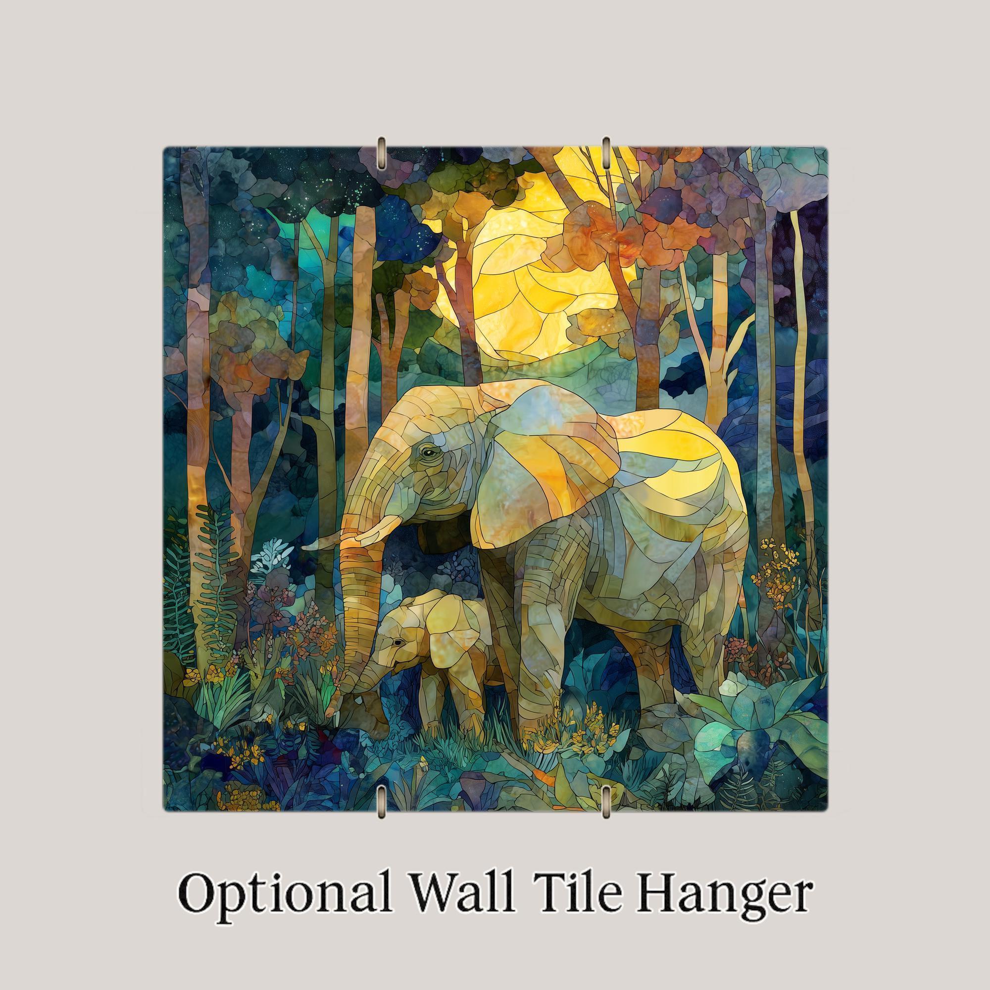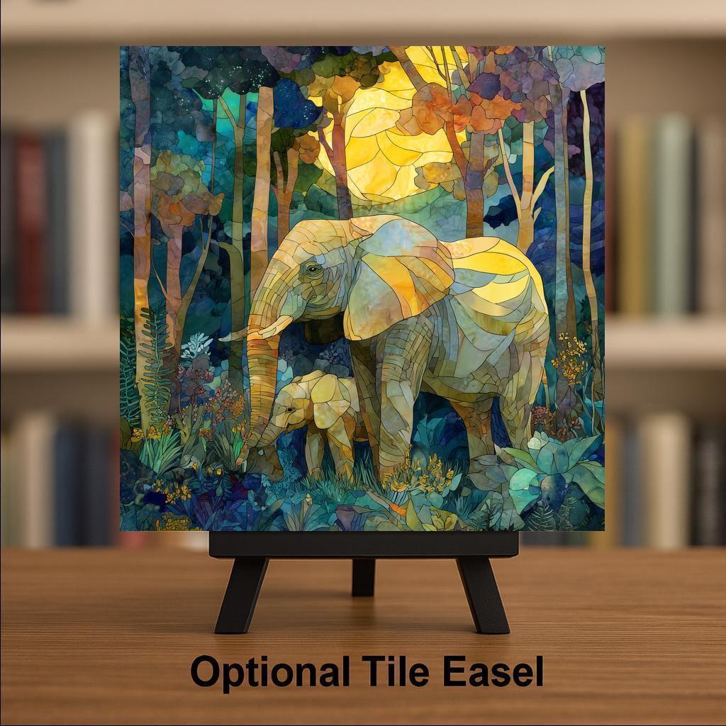 This elephant mother baby decorative tile captures a quiet, powerful moment between a mother elephant and her calf as they walk together through a peaceful forest. The scene is illustrated in a stained glass–inspired style, with layered colors and soft light that create a feeling of calm, safety, and connection. The artwork focuses on what matters most: love, protection, and the bond between parent and child.