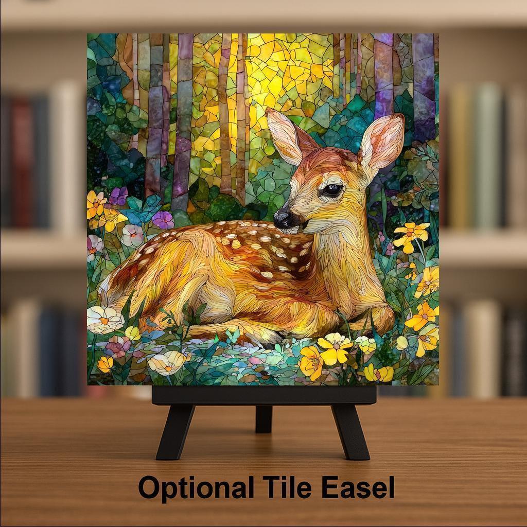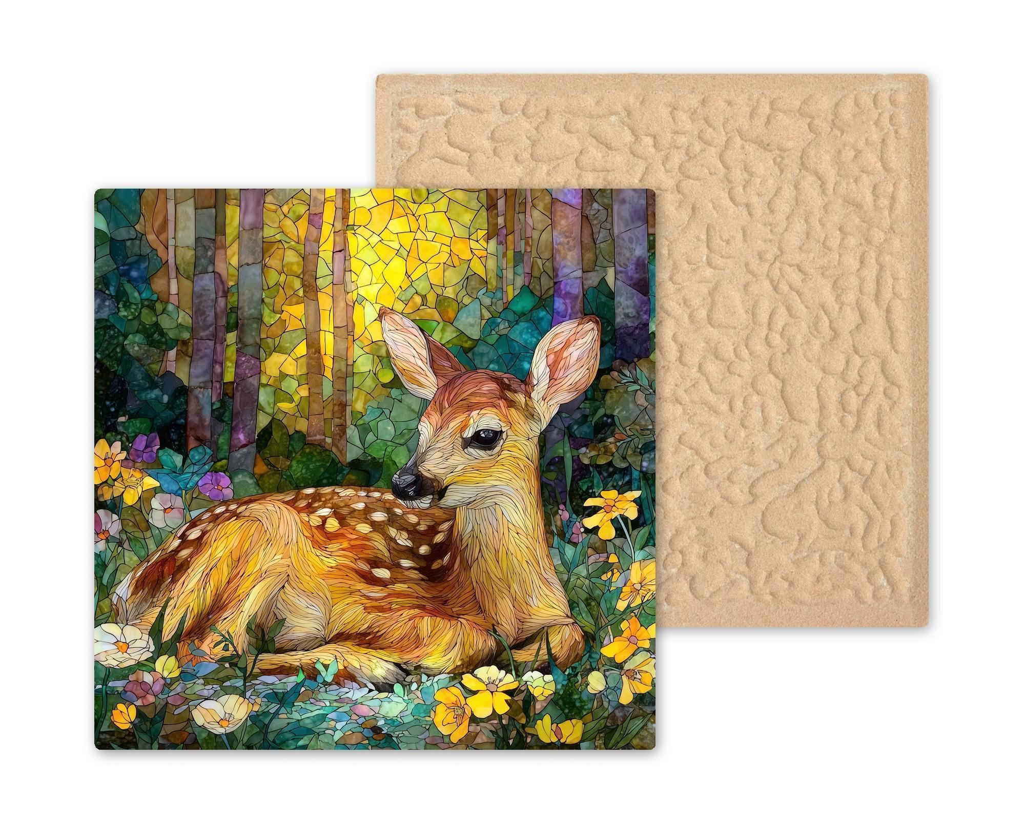 This fawn deer decorative tile features a peaceful woodland scene inspired by stained glass art. The illustration shows a young deer resting quietly among wildflowers, surrounded by trees and soft glowing light. The scene feels calm and gentle, making it a meaningful piece for anyone who loves nature, wildlife, or tranquil home decor.