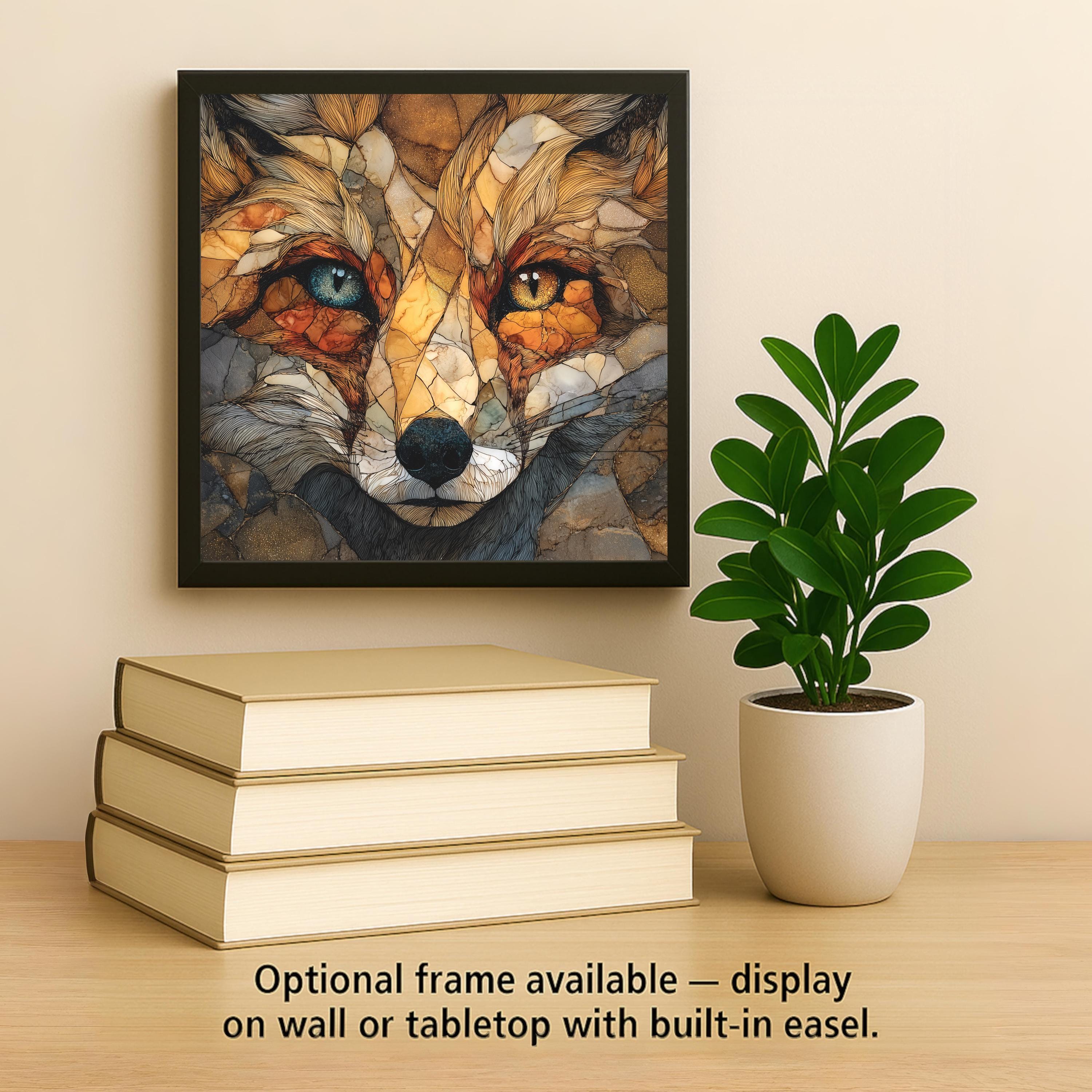This fox decorative tile brings the quiet intelligence and warmth of woodland life into your space through a rich stained glass–inspired design. The close-up portrait draws attention to the fox’s expressive eyes and layered textures, creating a piece that feels both calm and powerful. Earthy tones of amber, stone gray, and soft blue blend together, giving the artwork depth and a natural sense of movement.