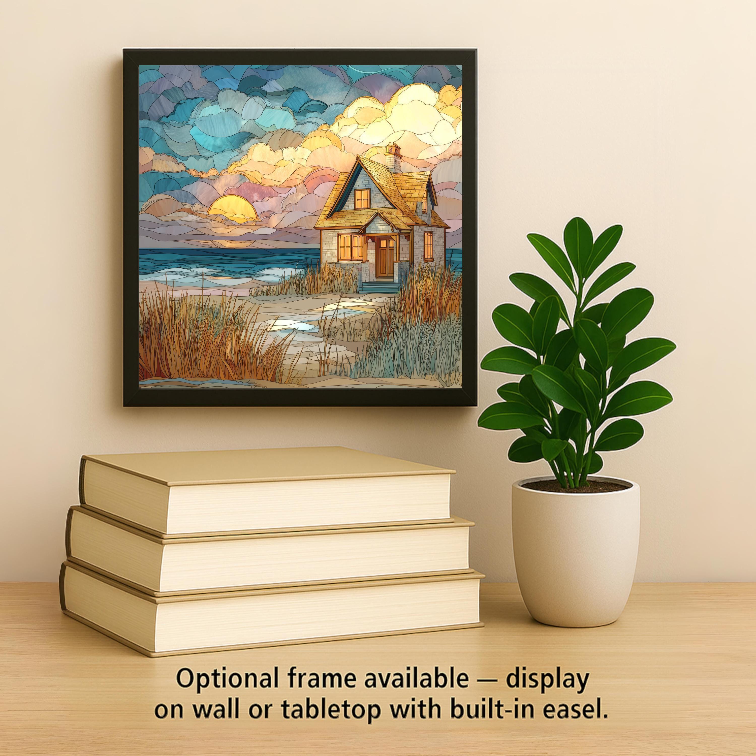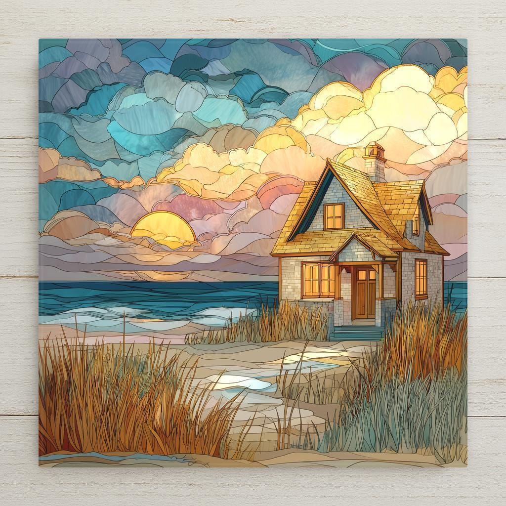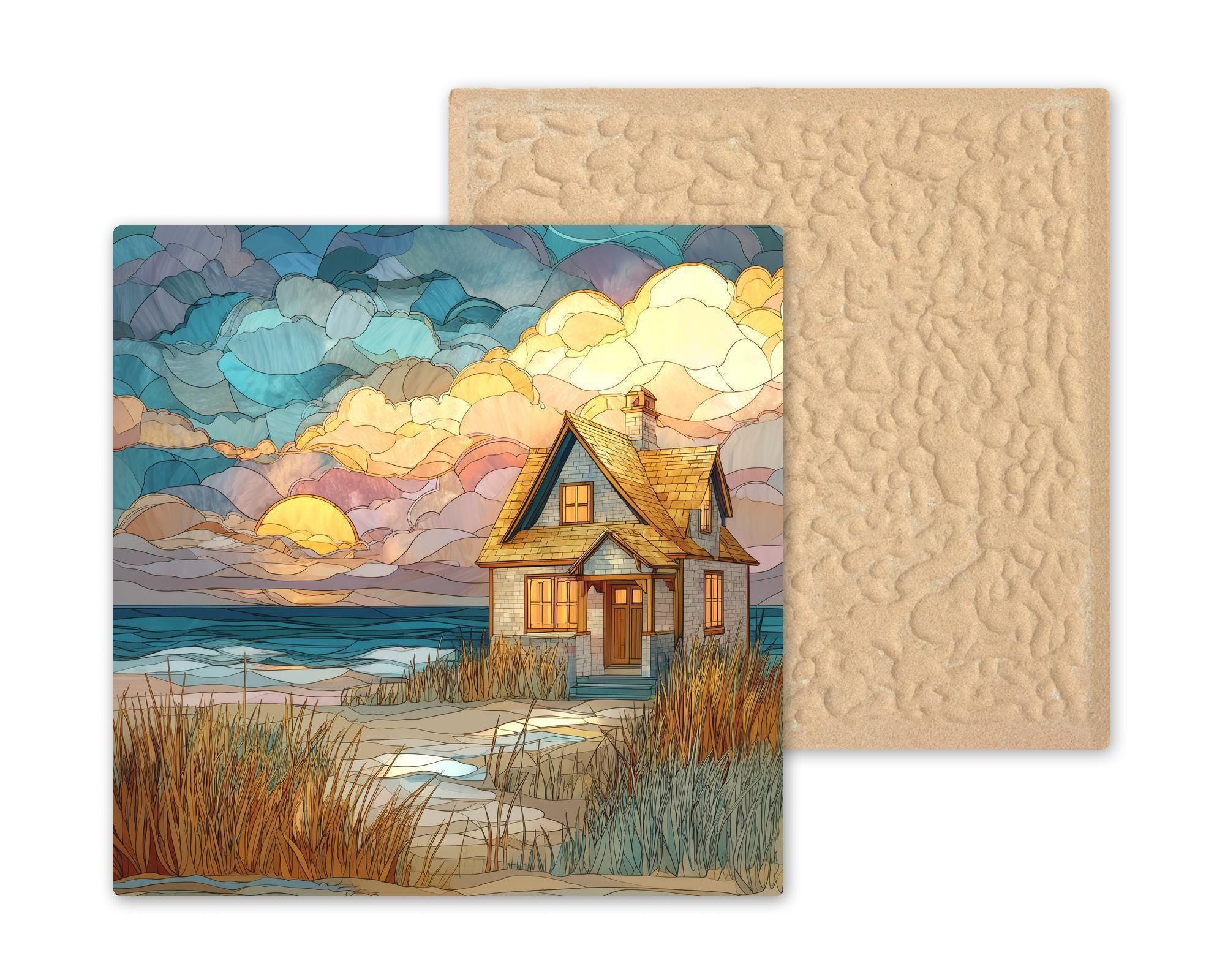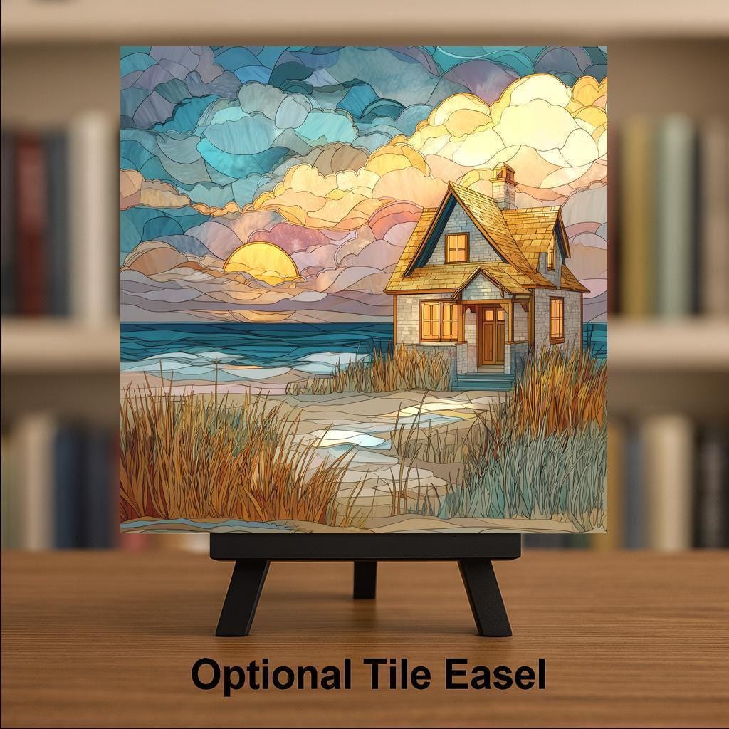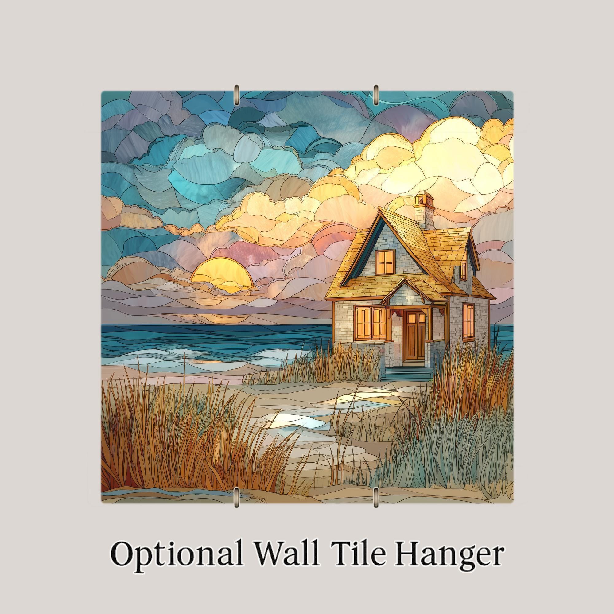Bring the feeling of the shoreline into your space with this coastal cottage stained glass–style decorative tile. Featuring a small beach house, tall grasses, and a glowing ocean sunset, the design captures a peaceful seaside moment through layered textures and soft, flowing lines. The stained glass look gives the artwork a timeless quality while maintaining a relaxed, coastal feel.