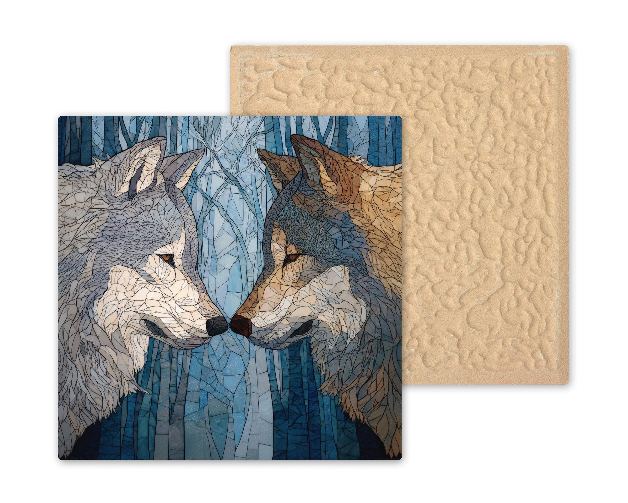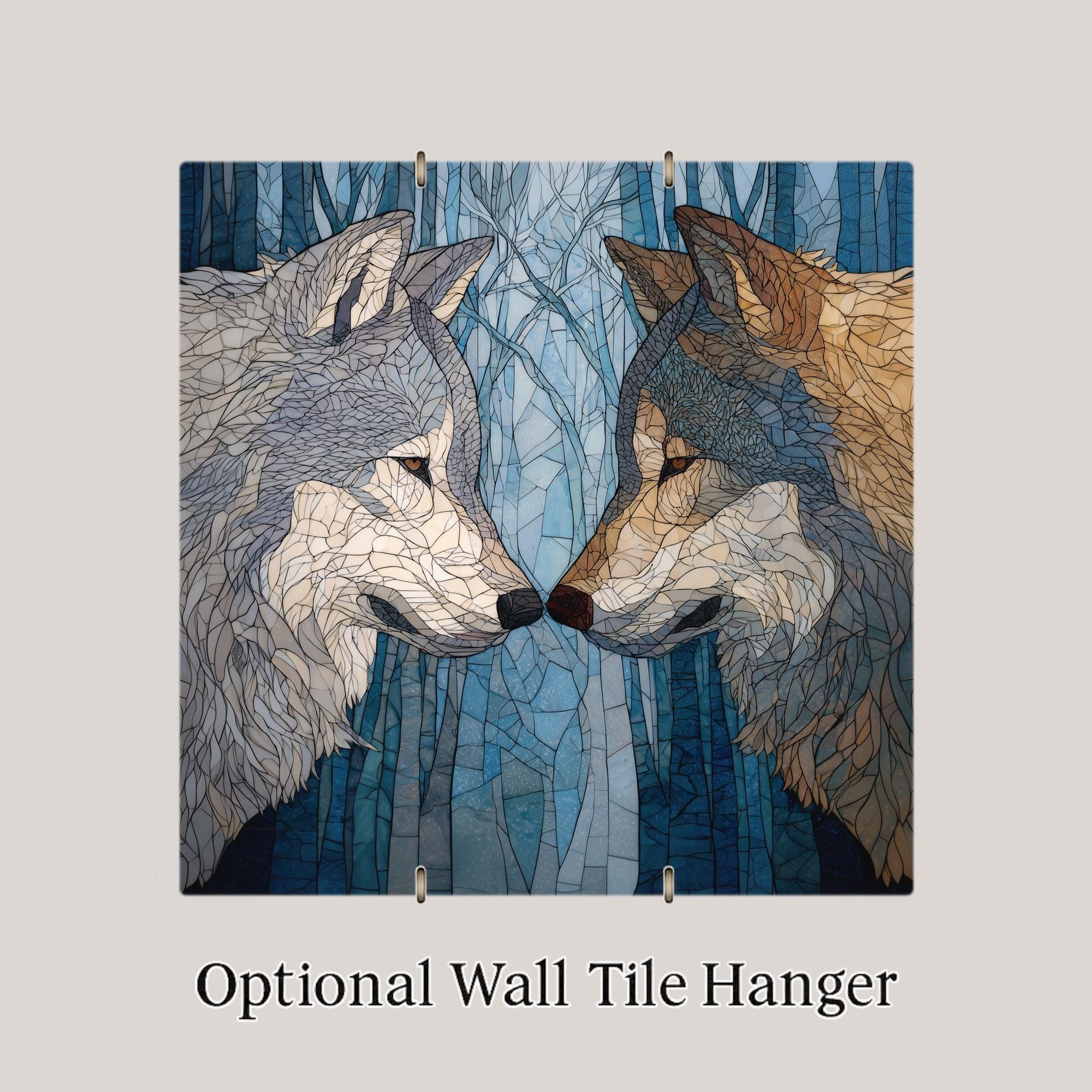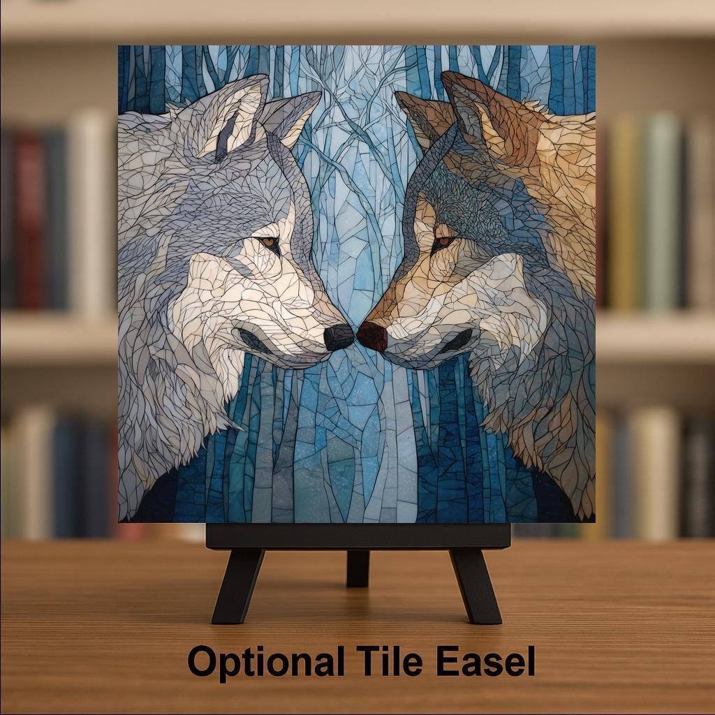 This Wolf Pair Ceramic Tile Wall Art tells a quiet story of companionship and balance. The two wolves face one another beneath a forest-inspired background, their contrasting colors symbolizing harmony between strength and tenderness. The stained glass-style design adds a handcrafted look while maintaining a serene, modern feel that works beautifully as meaningful home decor.