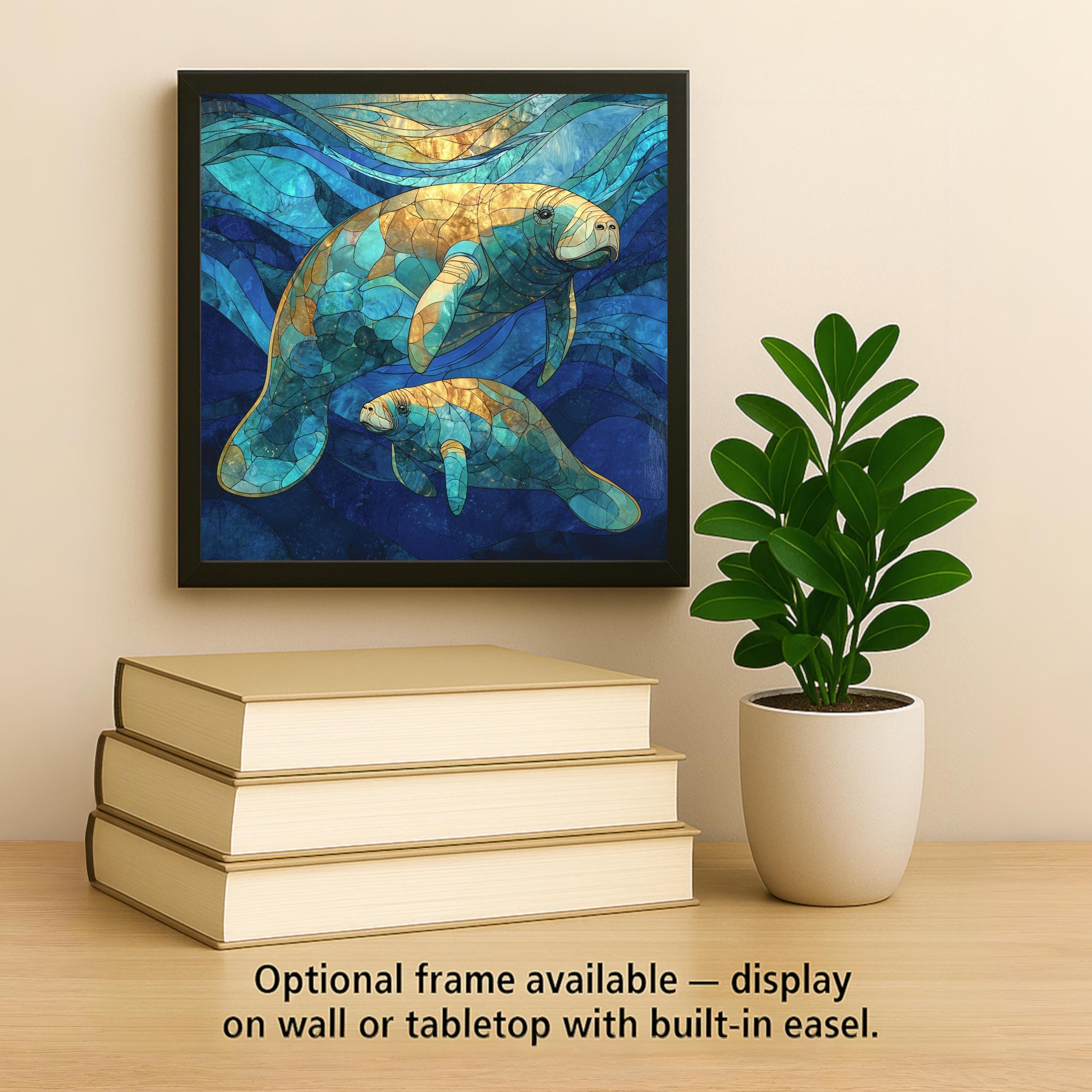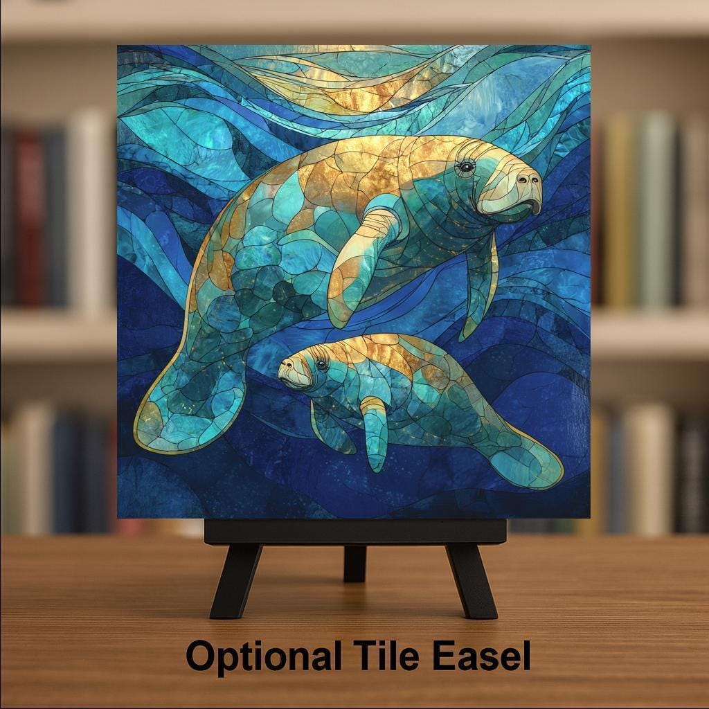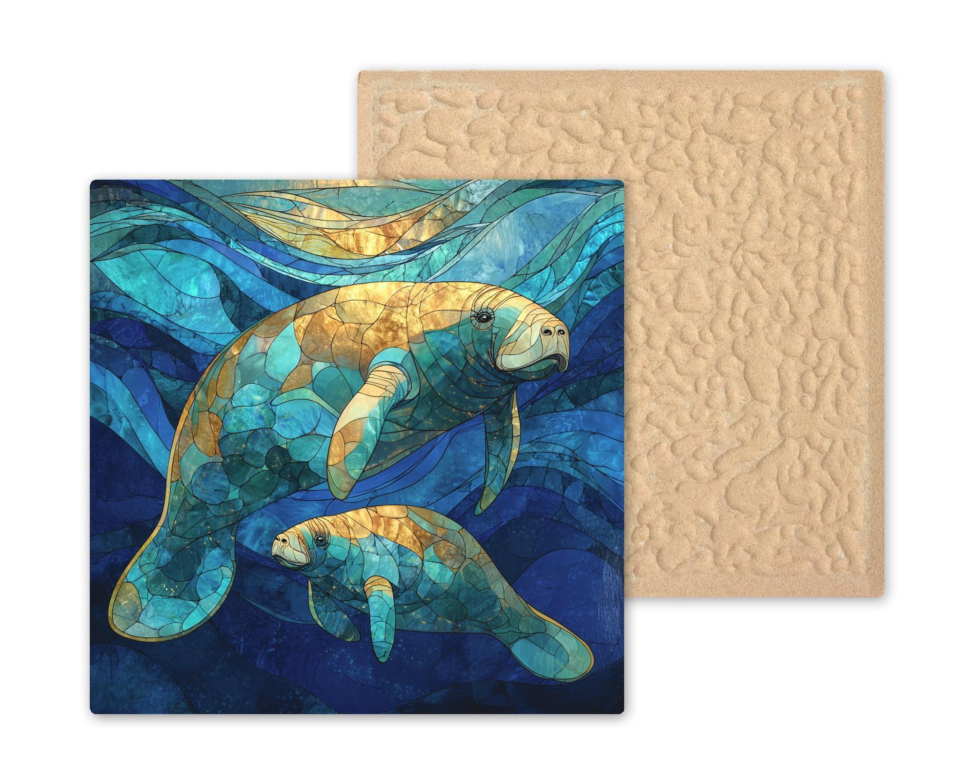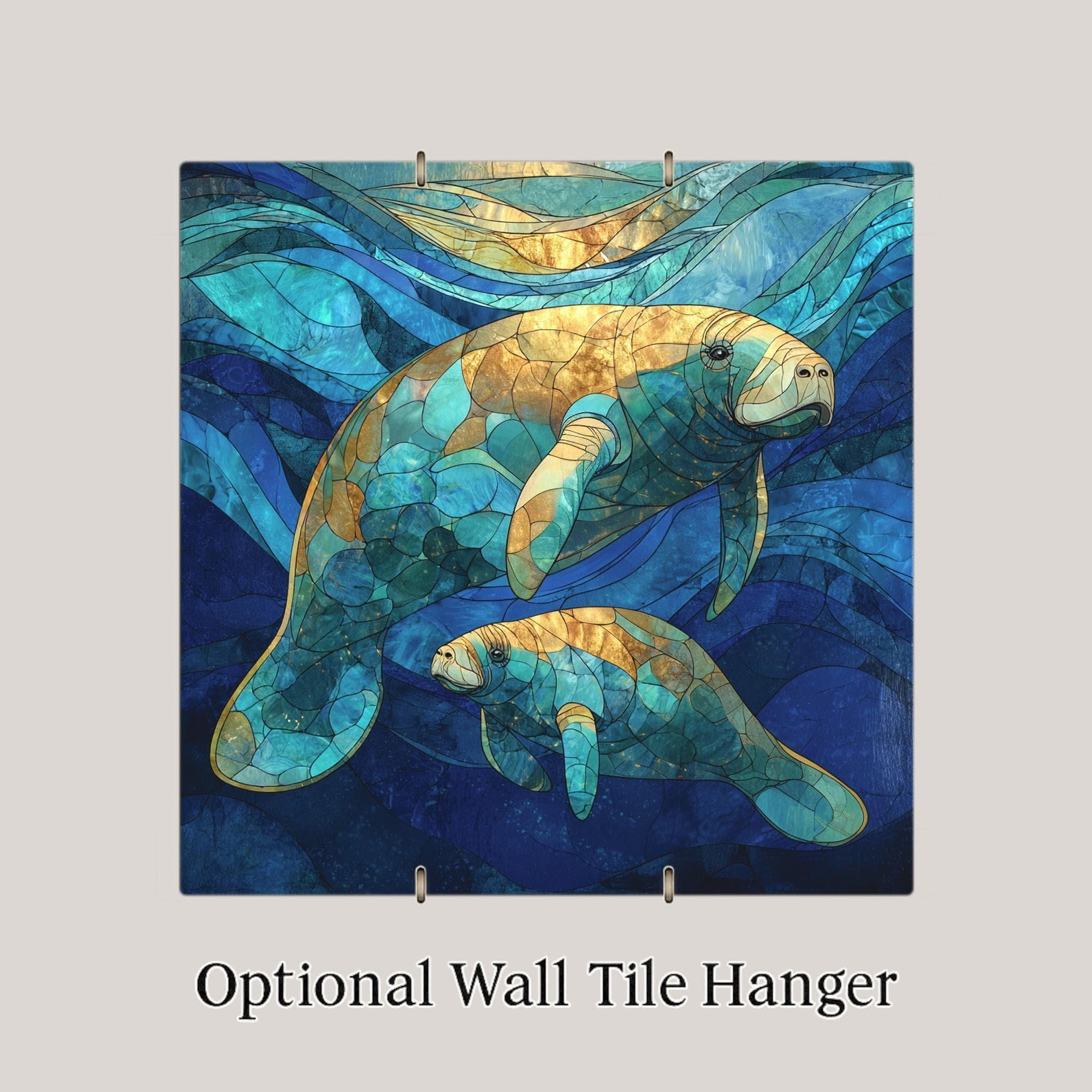 This Manatee and Baby Ceramic Tile Wall Art tells a quiet, emotional story of protection and closeness beneath the ocean’s surface. The mother manatee guides her calf through layered waves of blue and teal, accented with golden highlights that mimic the glow of stained glass. The result is coastal wall art that feels soothing, symbolic, and timeless.