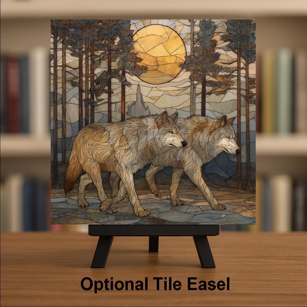 This Wolf Pair Ceramic Tile Wall Art tells a quiet story of unity and forward motion. The wolves move together with purpose, symbolizing trust, balance, and commitment. The forest setting and warm moon backdrop evoke a sense of stability and shared direction, making this piece ideal for couples, spouses, or newlyweds.