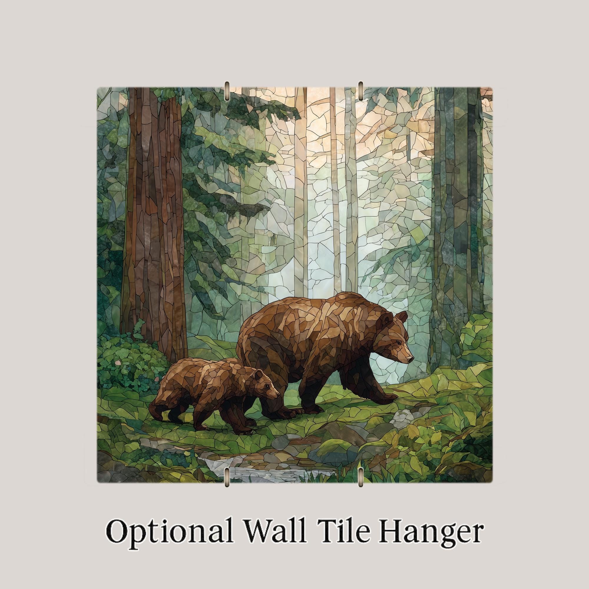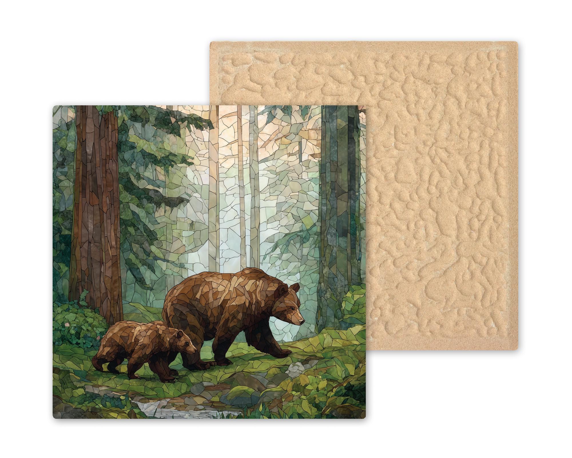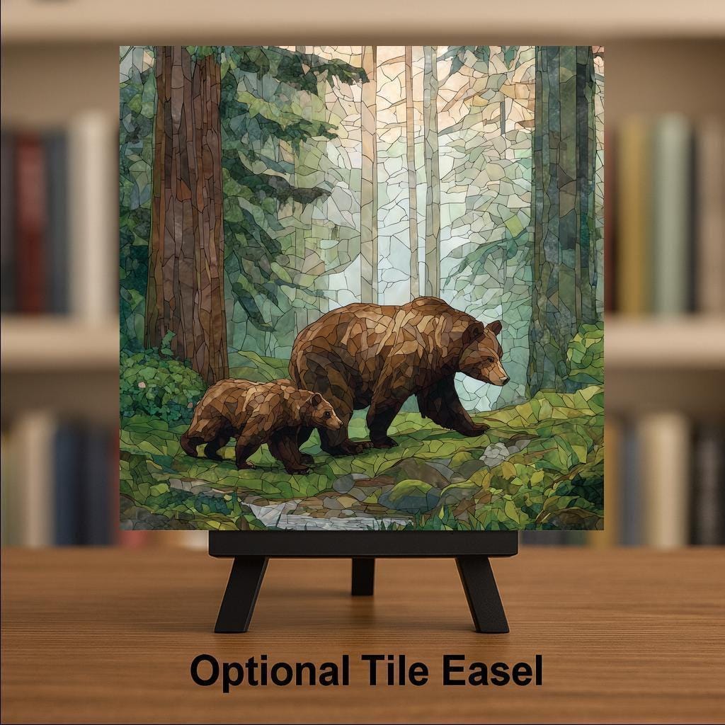 This Bear and Cub Ceramic Tile Wall Art tells a story of leadership and care. The mother bear moves forward with quiet confidence while the cub mirrors her path, symbolizing guidance, growth, and the reassurance of family presence. The stained glass-style aesthetic gives the artwork a handcrafted look while maintaining a calm, natural palette that complements both rustic and modern interiors.