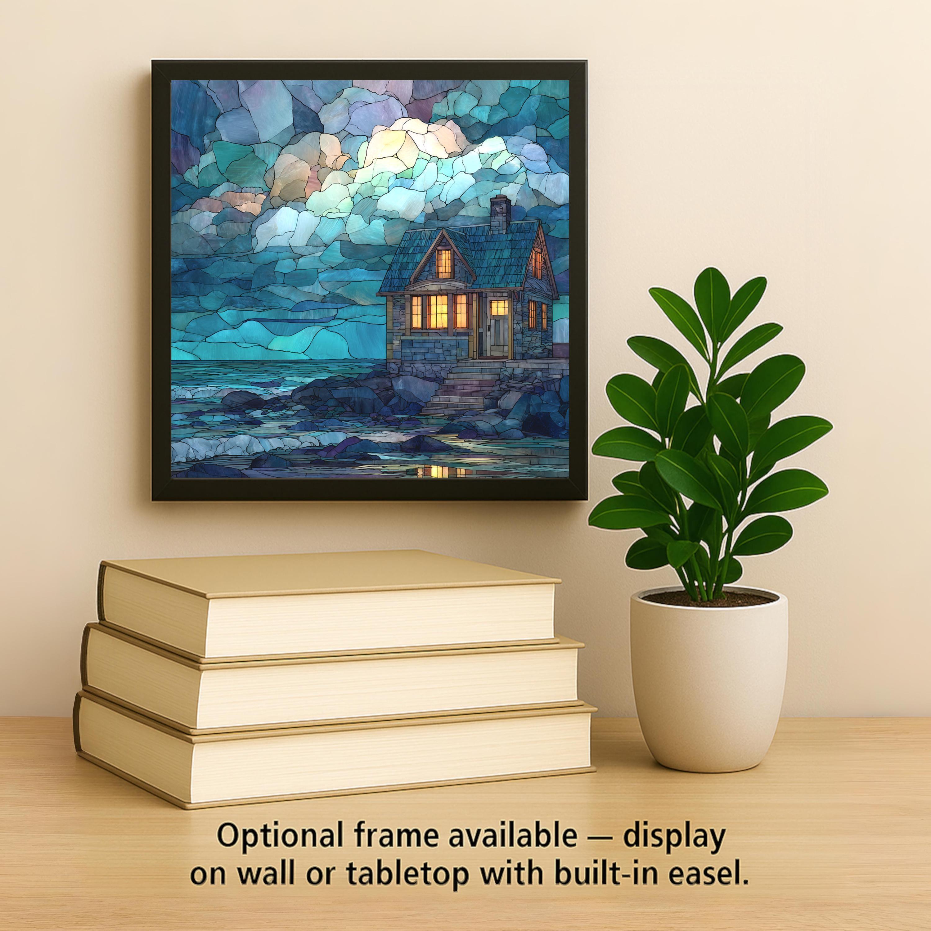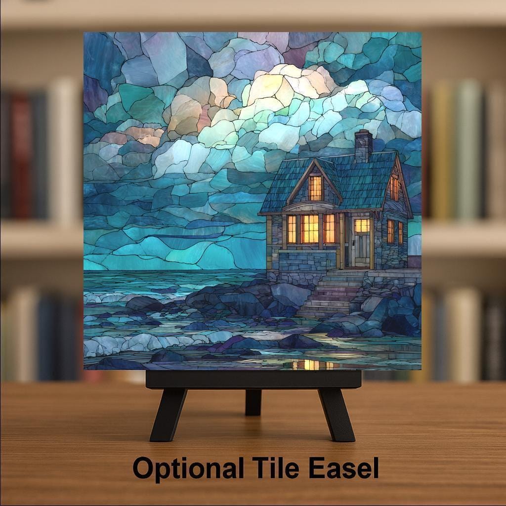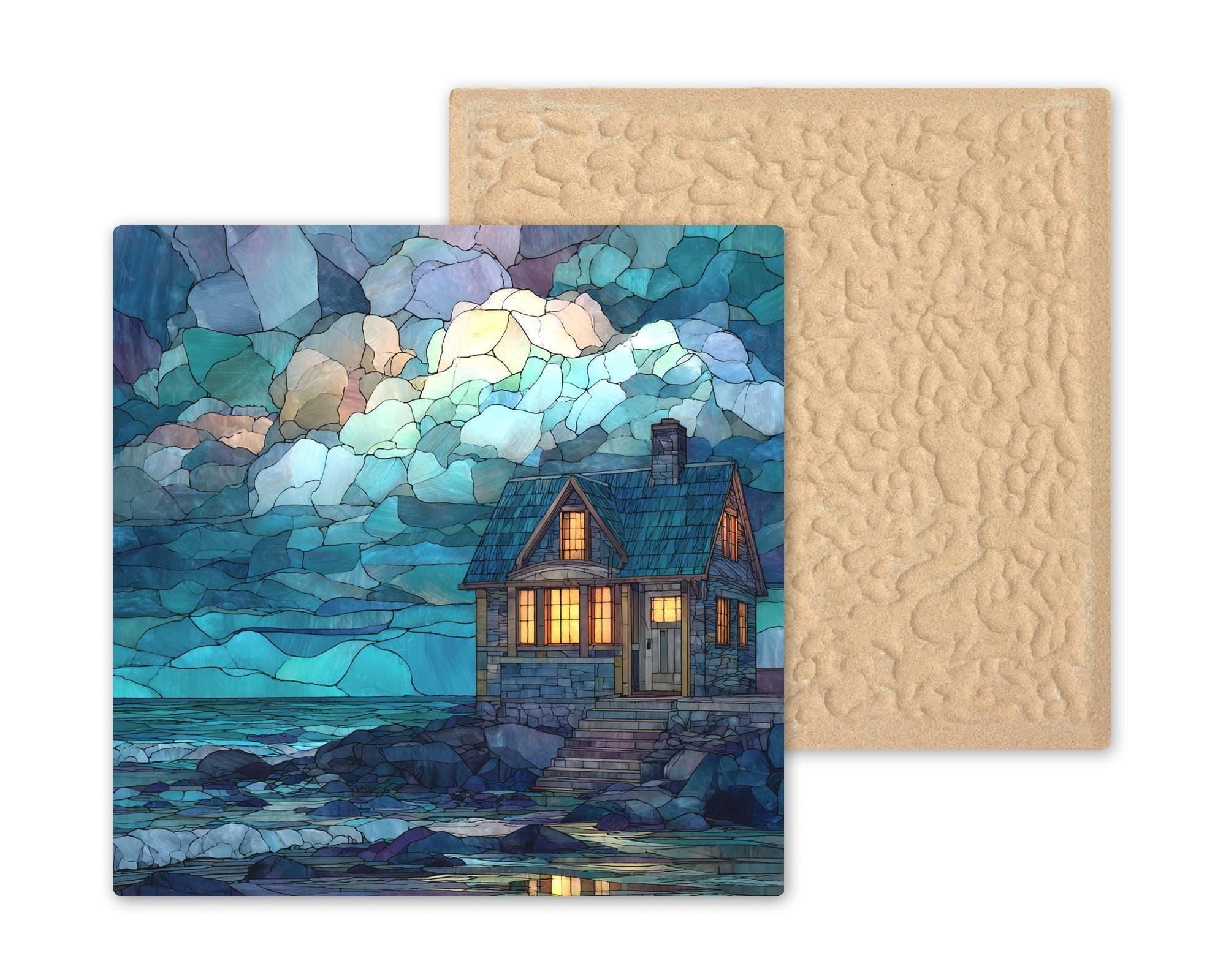 This coastal cottage ceramic tile artwork speaks to the idea of home as a place of warmth, safety, and renewal. The glowing windows and tranquil shoreline symbolize comfort during life’s quieter moments, making this piece especially appealing during the winter-to-spring transition when buyers focus on creating peaceful living spaces.