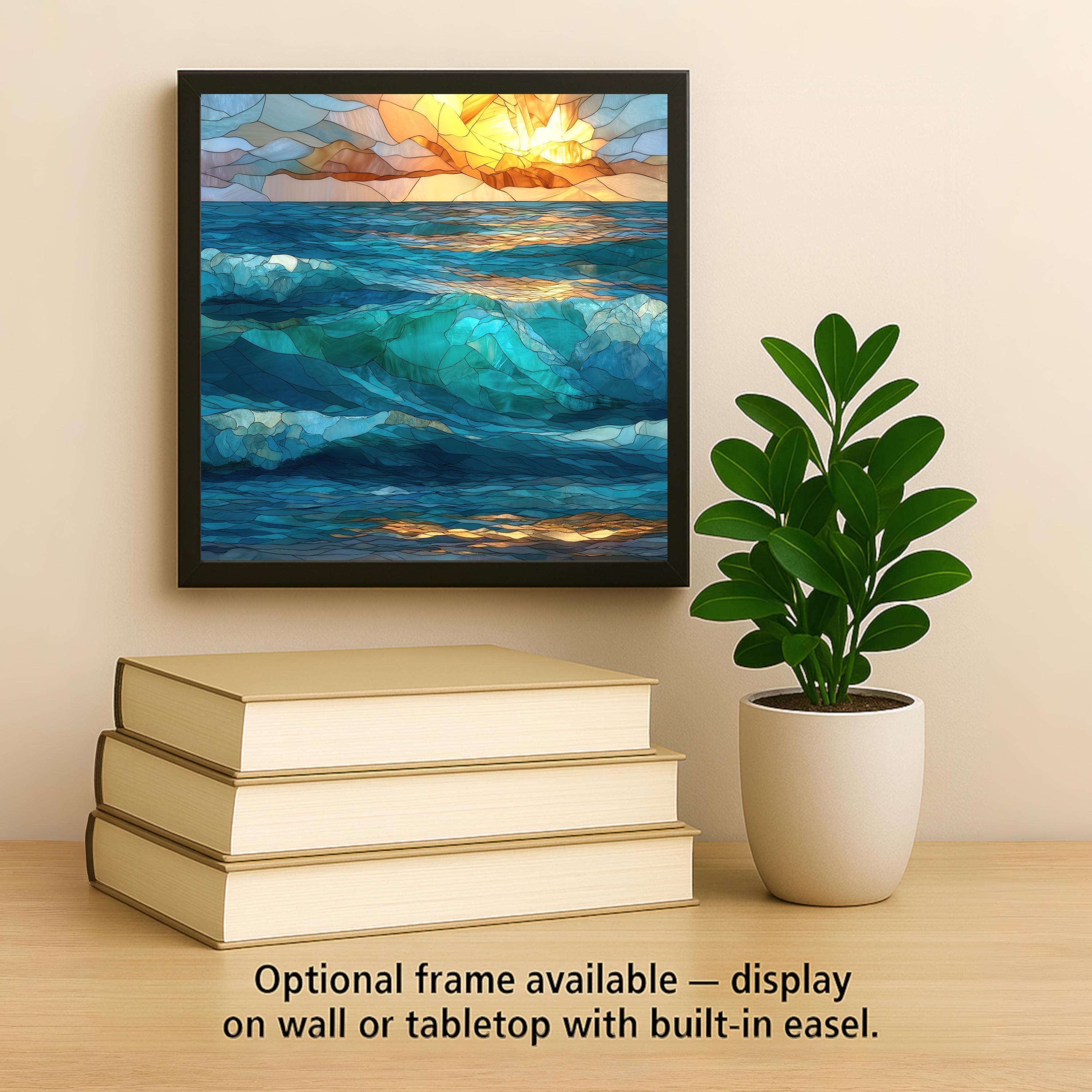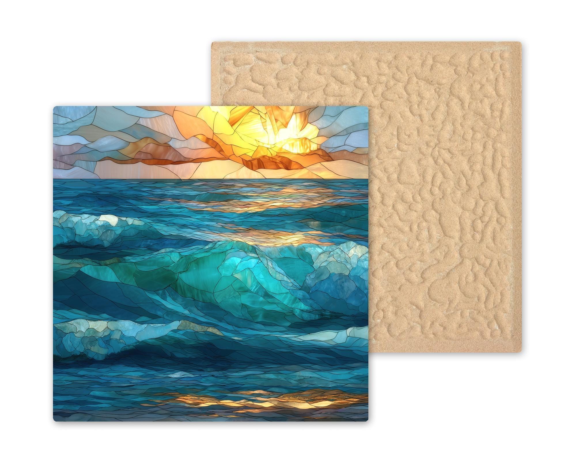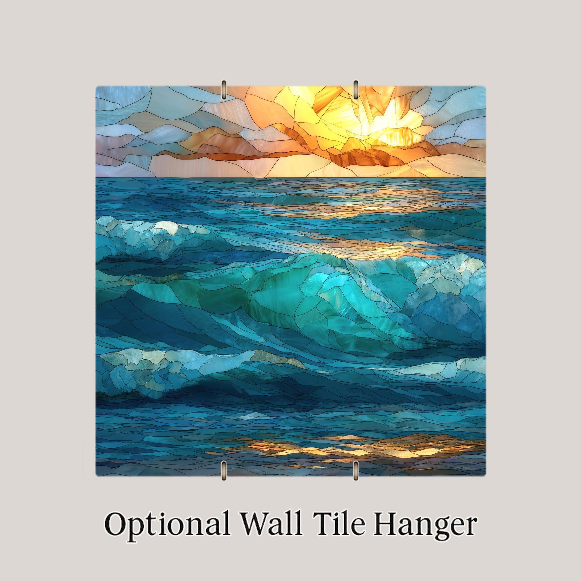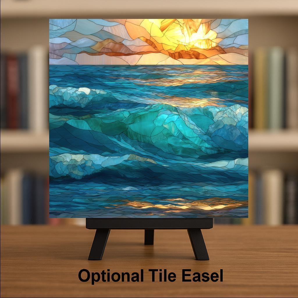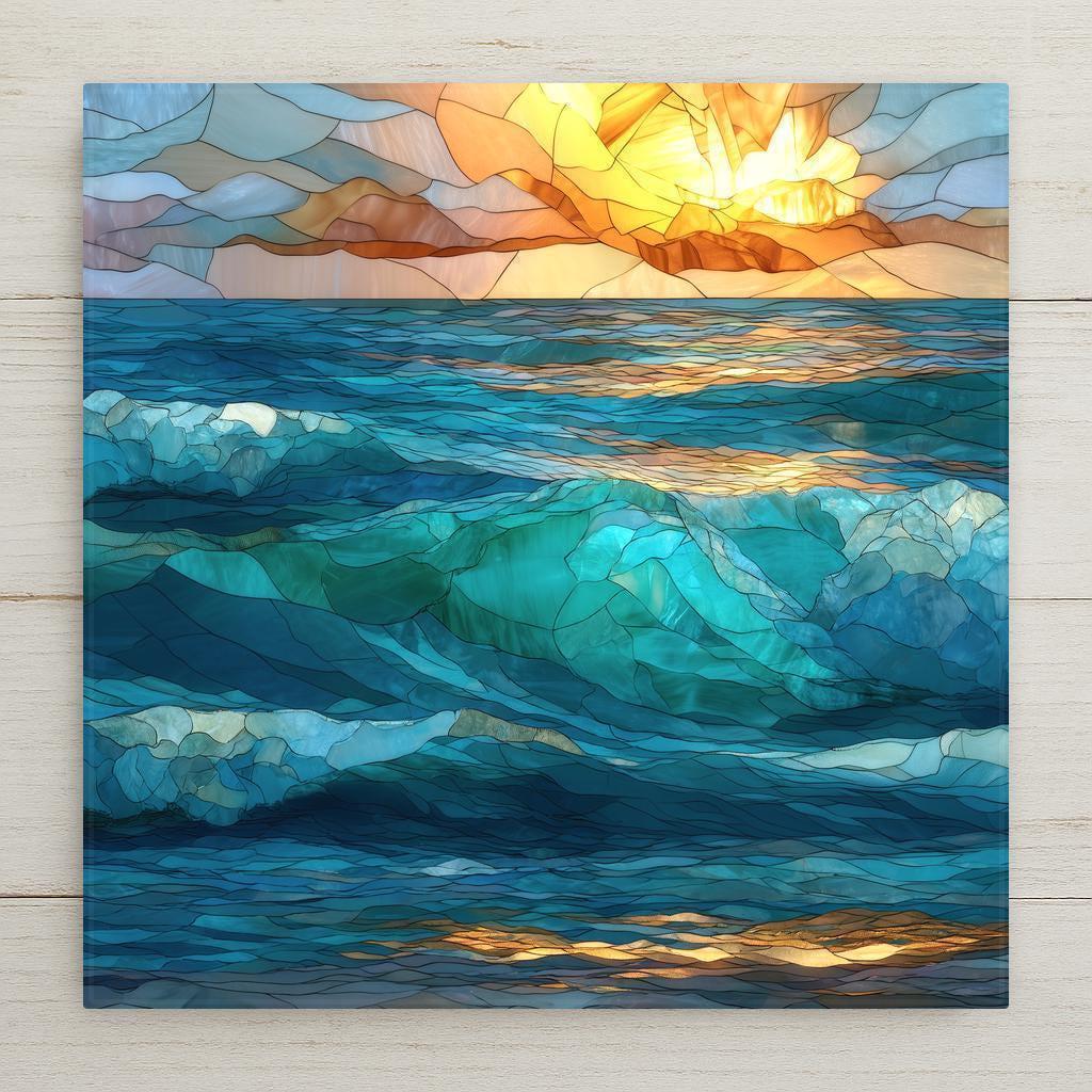 Designed for those who appreciate art with meaning, this abstract ocean ceramic tile captures the essence of waves without tying the viewer to a specific place or moment. The stained glass–style layering allows light and color to feel alive, making the artwork shift subtly as it’s viewed throughout the day.