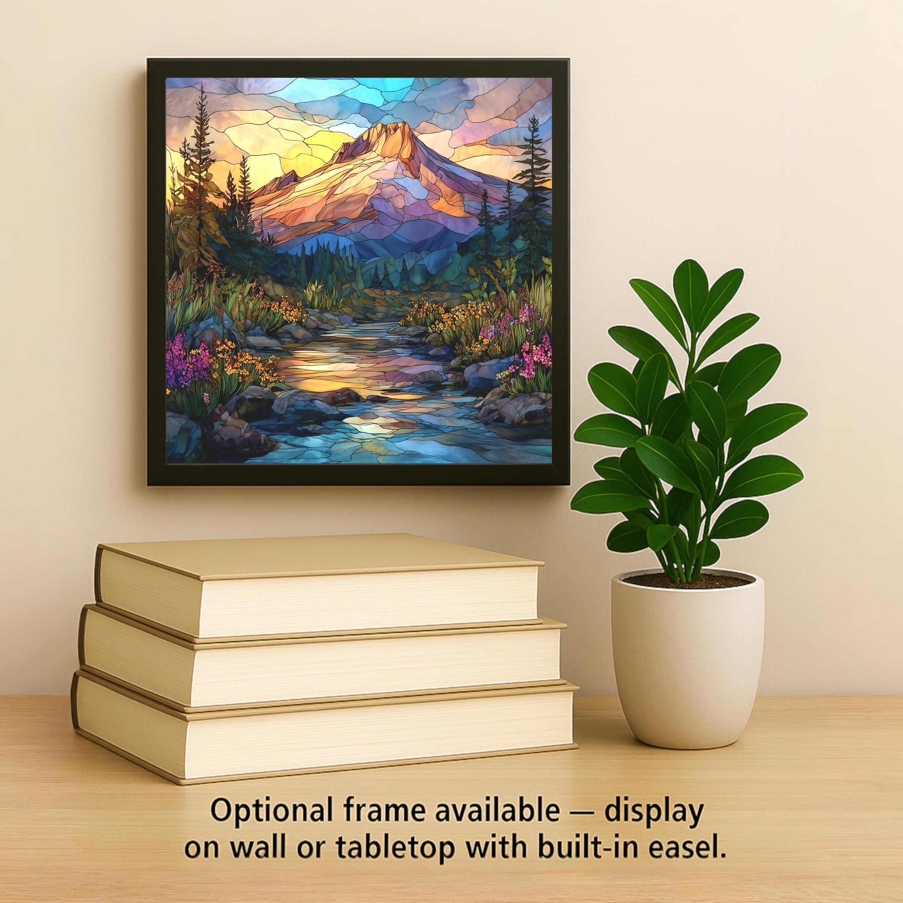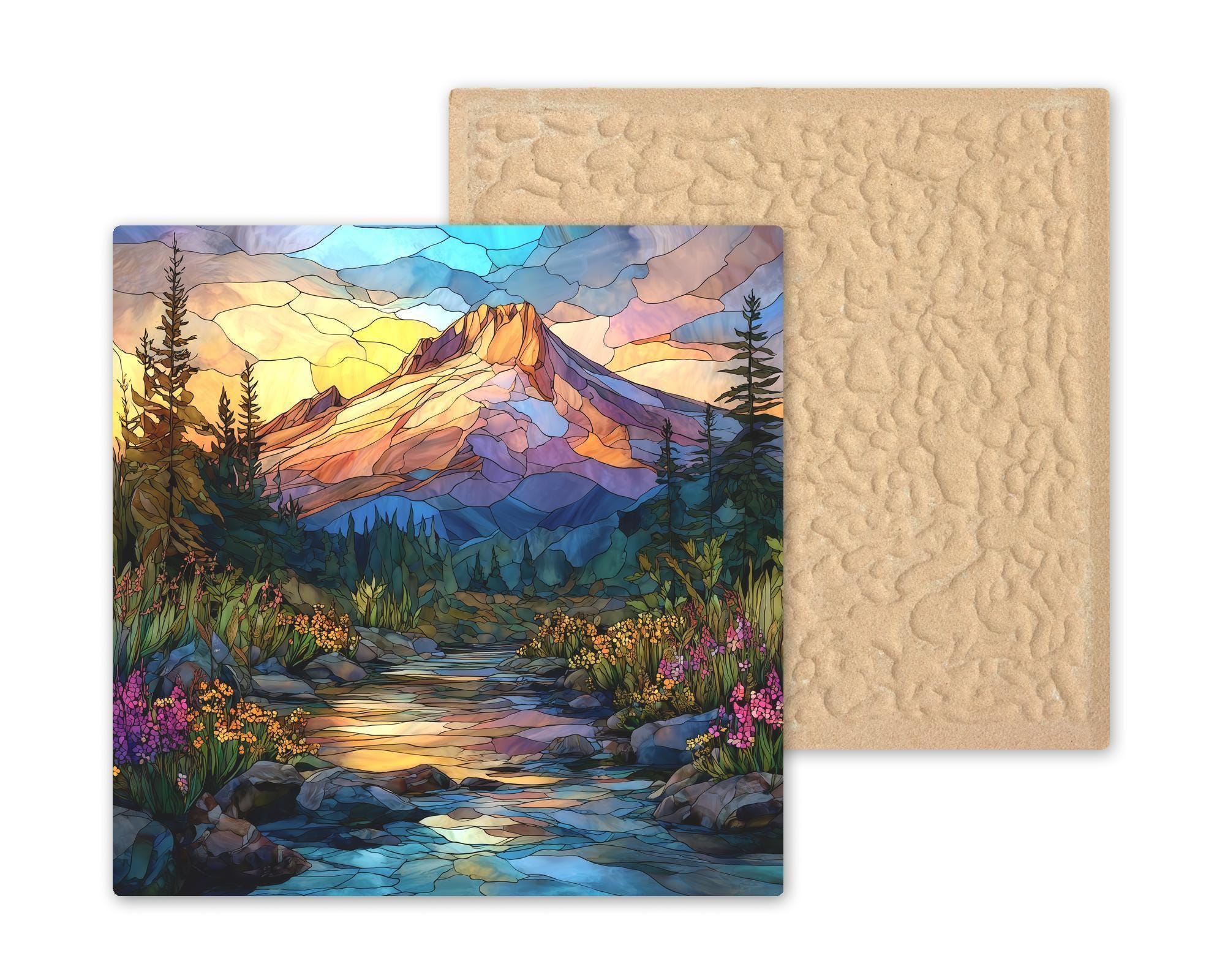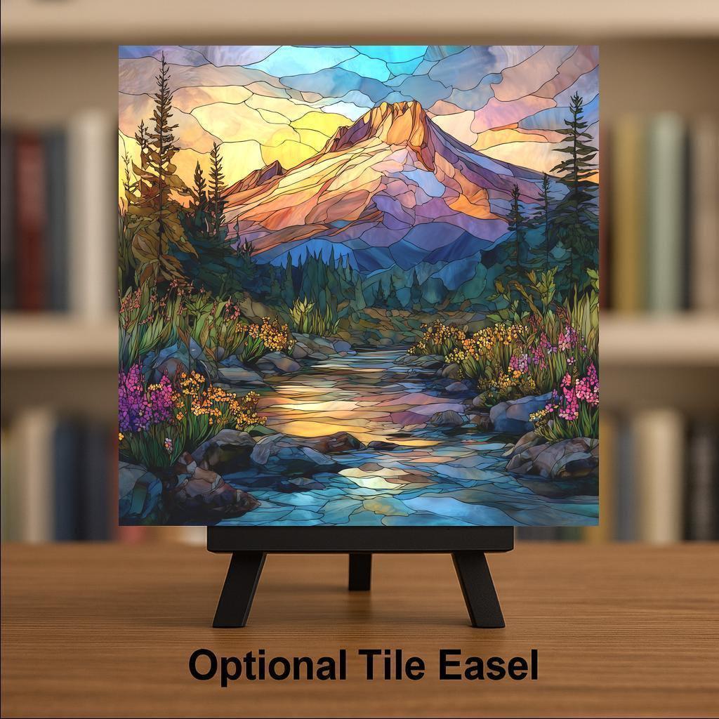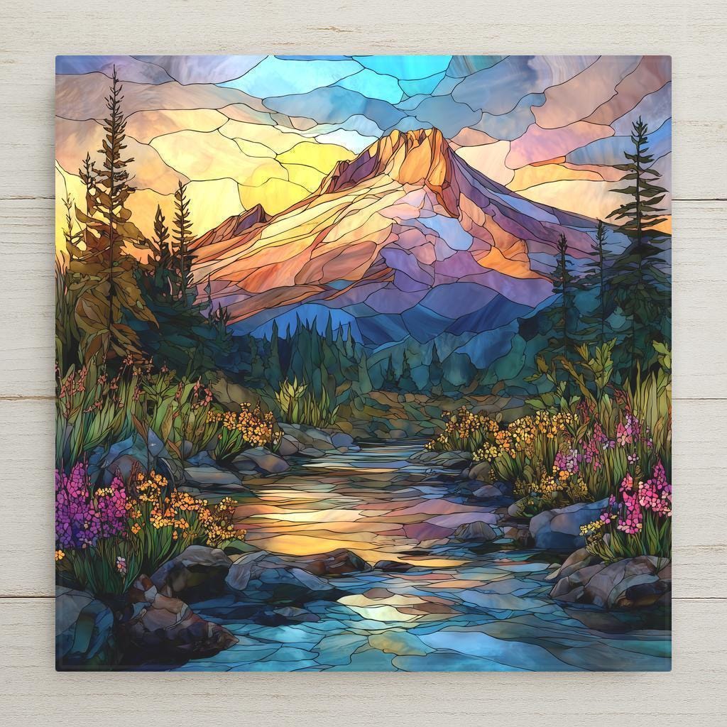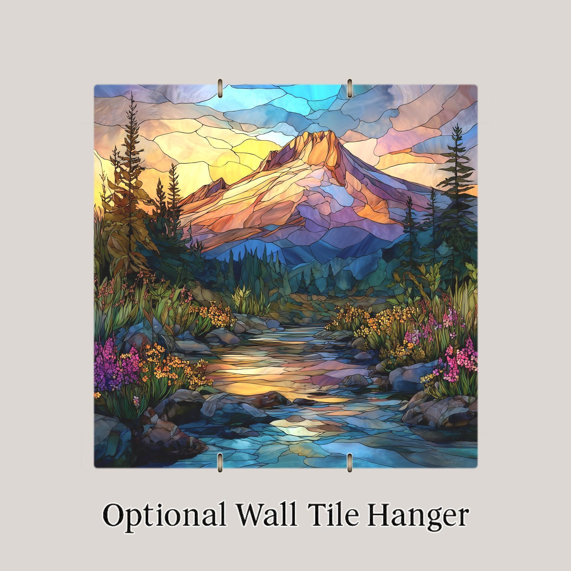 Designed for collectors who appreciate art with meaning, this Mount Hood tile blends geographic identity with a timeless stained glass–style aesthetic. The layered mountain forms and reflective water give the artwork a peaceful presence that changes subtly with light, making it a calming focal point throughout the day.