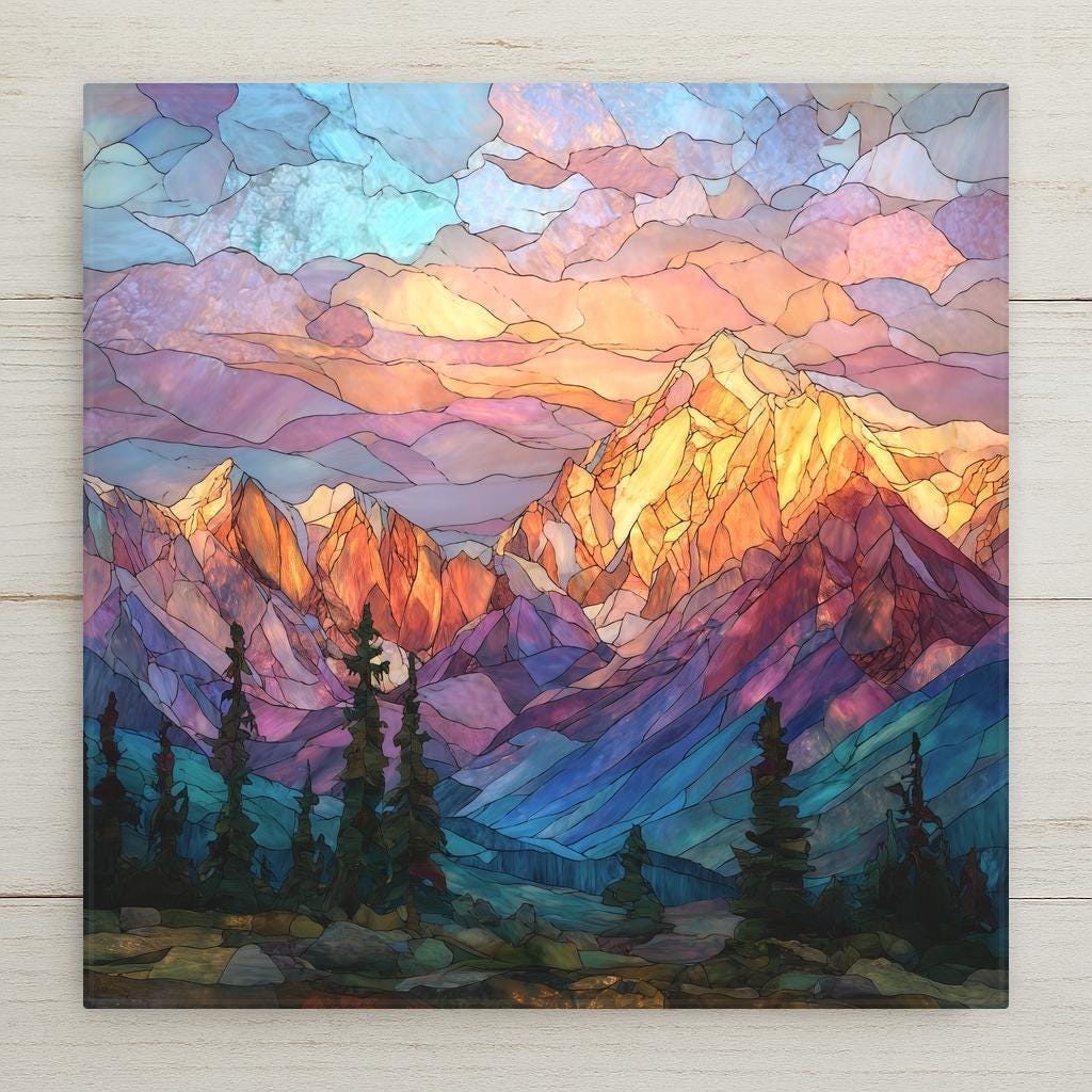 Designed for collectors who appreciate art with meaning, this Denali tile blends geographic identity with a timeless stained glass–style aesthetic. The layered mountain forms and glowing sky shift subtly with light, creating a calming yet powerful focal point throughout the day.