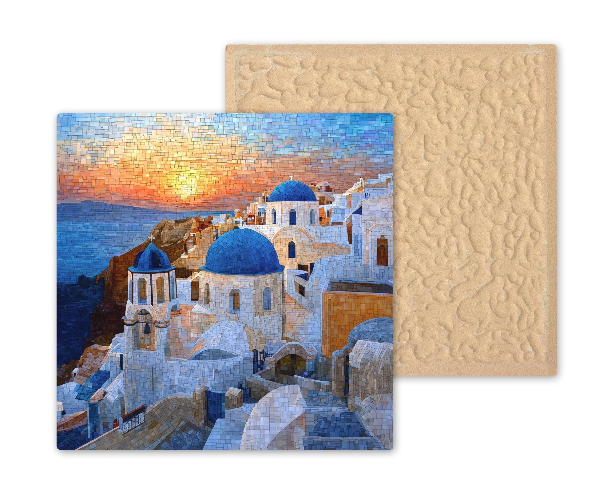 Santorini is more than a destination—it’s a feeling. This ceramic tile wall art captures the calm magic of an Aegean sunset as golden light reflects across white stone walls and iconic blue domes. Inspired by Oia’s cliffside churches, this piece evokes romance, travel memories, and peaceful Mediterranean evenings.